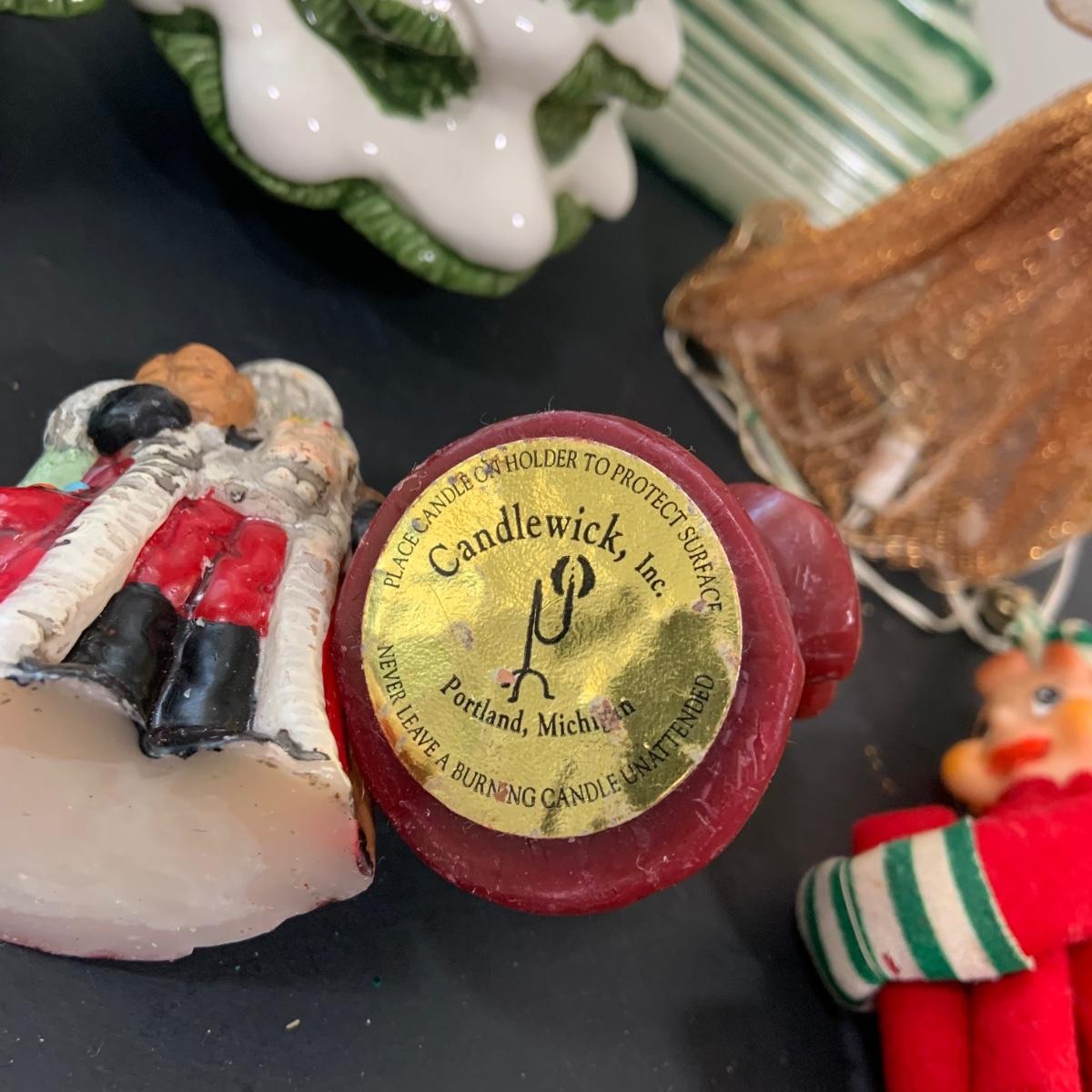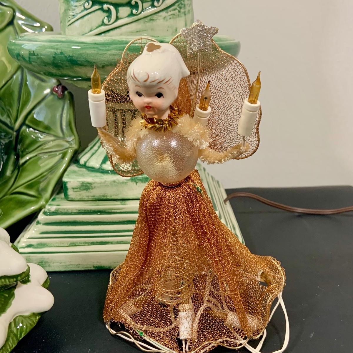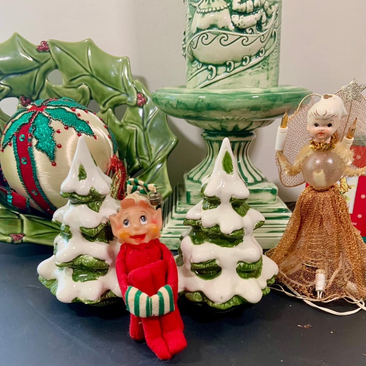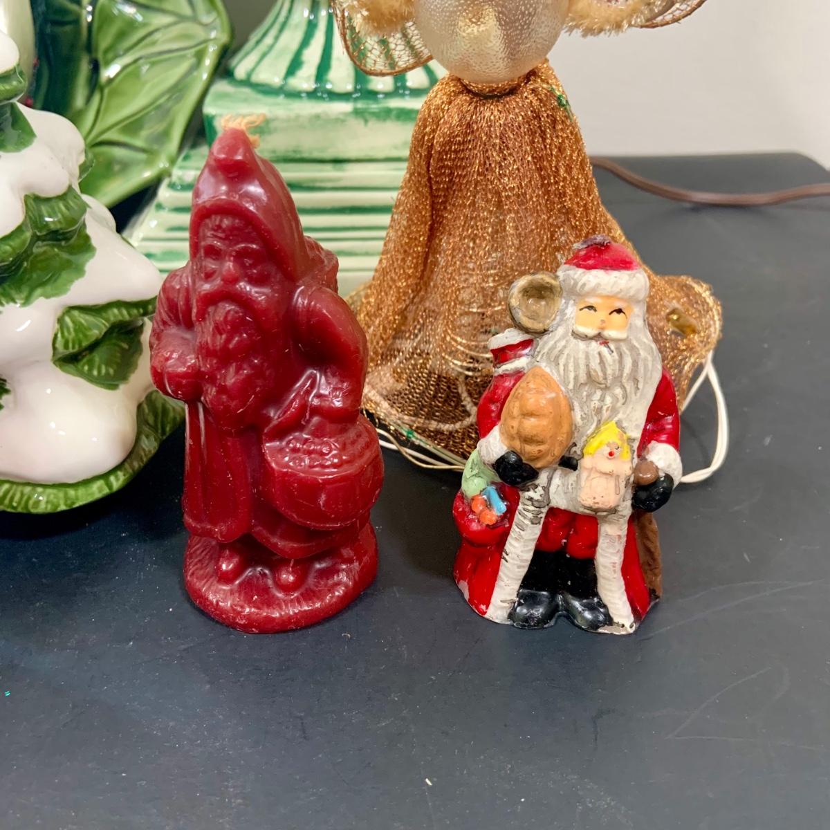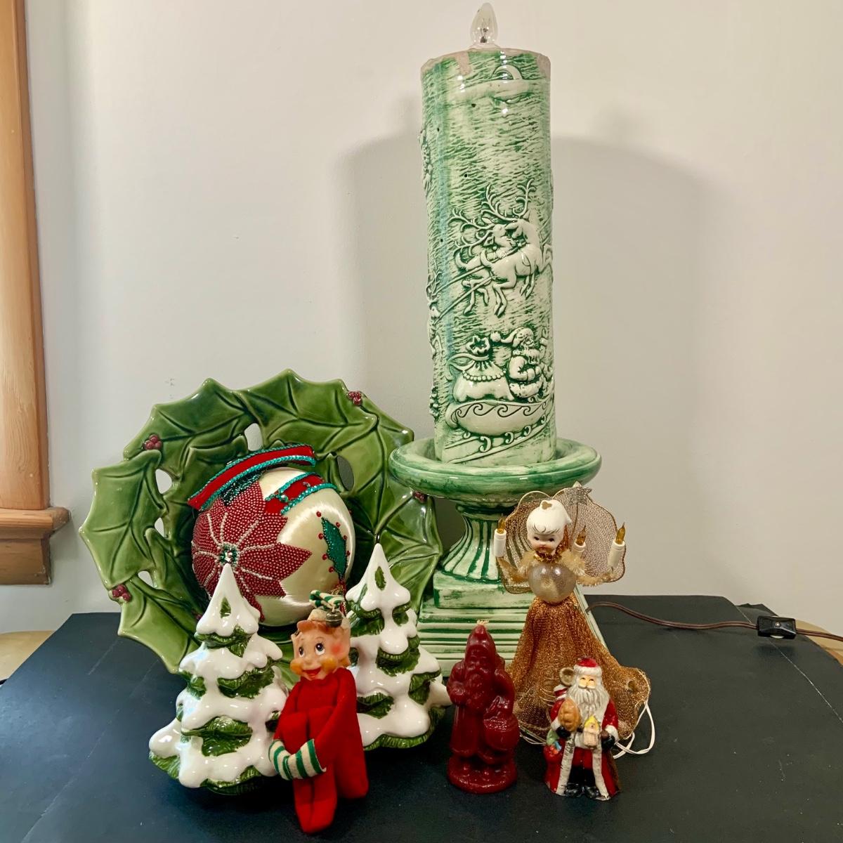 LOT:148: Collection of Vintage Christmas Decor and More Includng a Very Large Ceramic Alantic Mold Candle Lamp, Vintage Knee Hugger Elf, Santa Wax Candles Light-up Angel Tree Topper and More