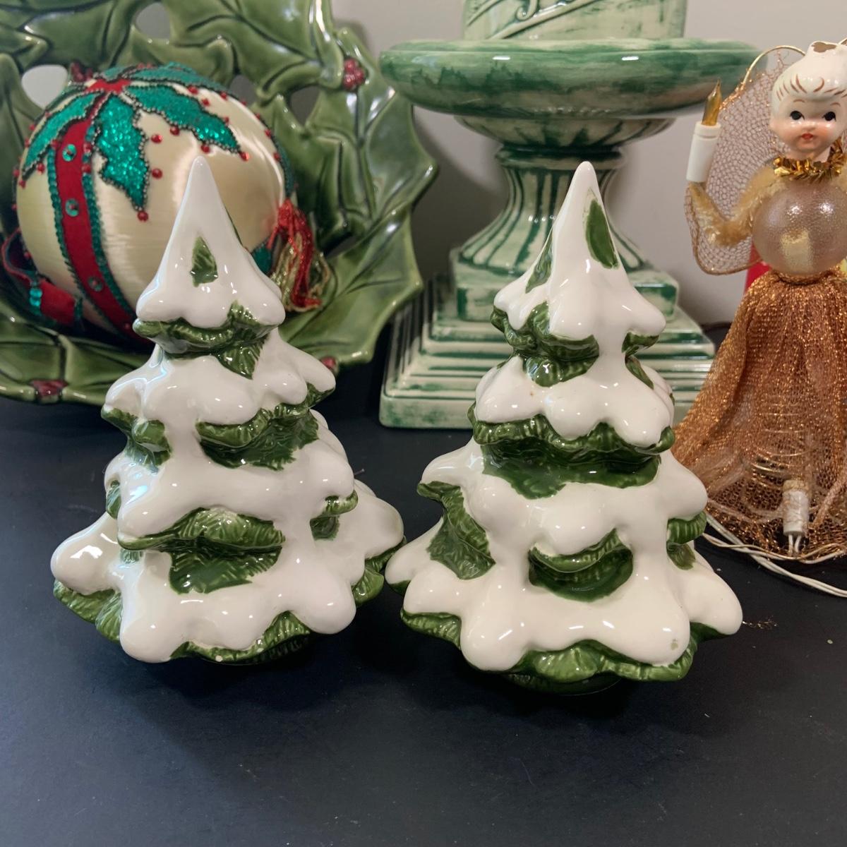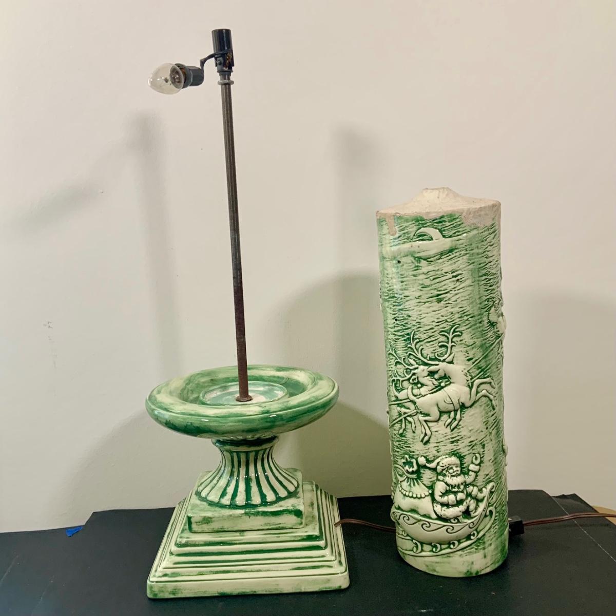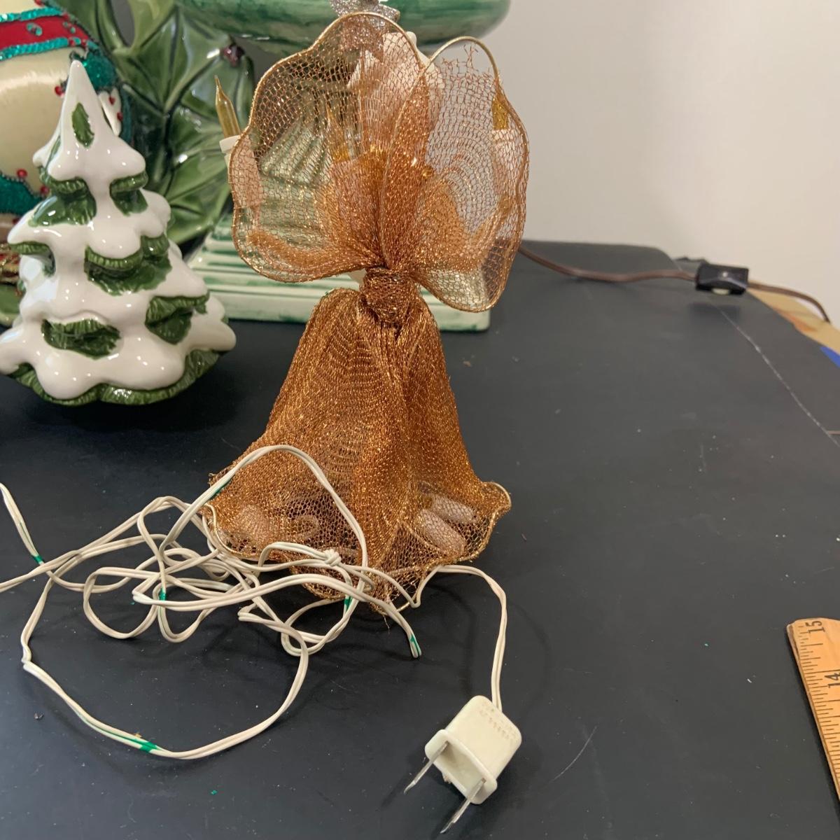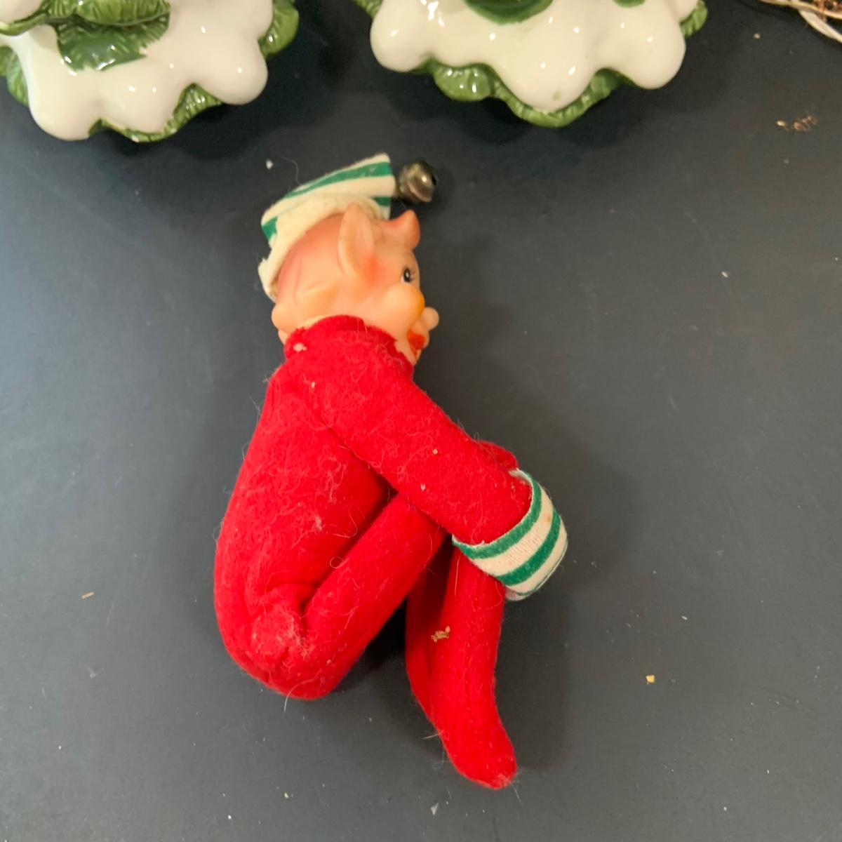 LOT:148: Collection of Vintage Christmas Decor and More Includng a Very Large Ceramic Alantic Mold Candle Lamp, Vintage Knee Hugger Elf, Santa Wax Candles Light-up Angel Tree Topper and More