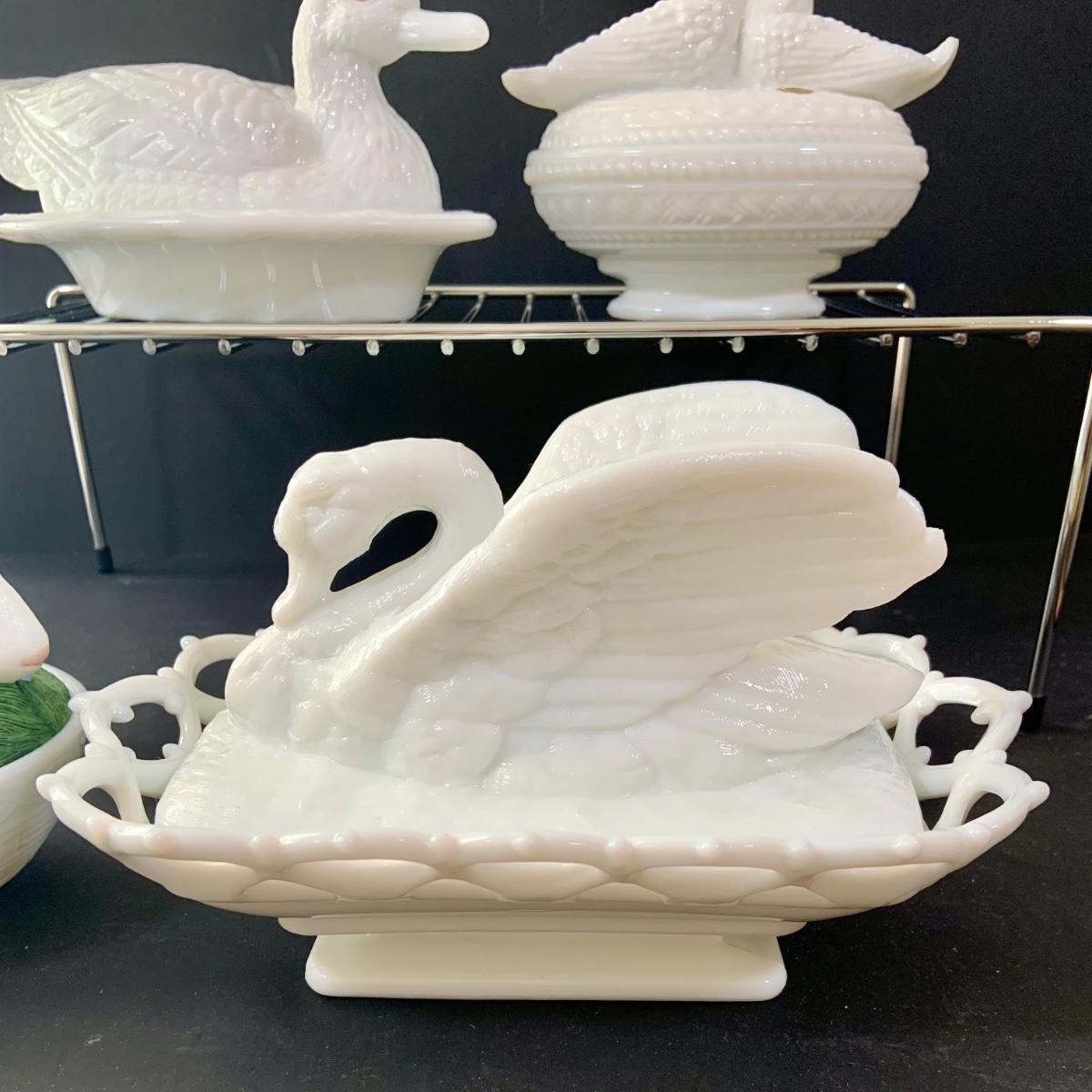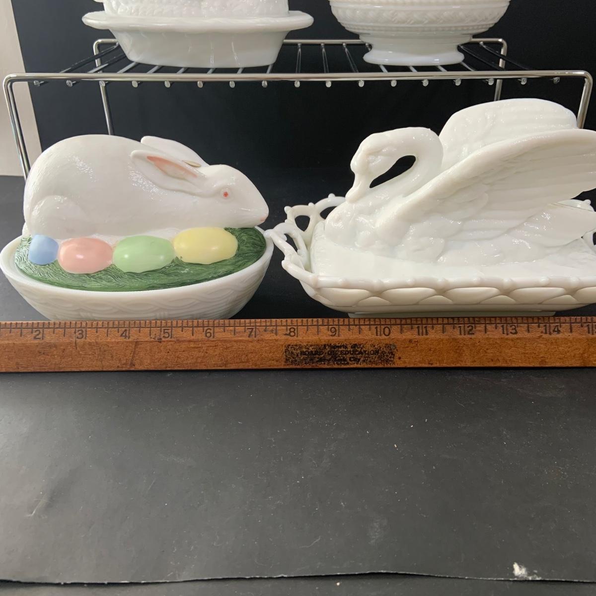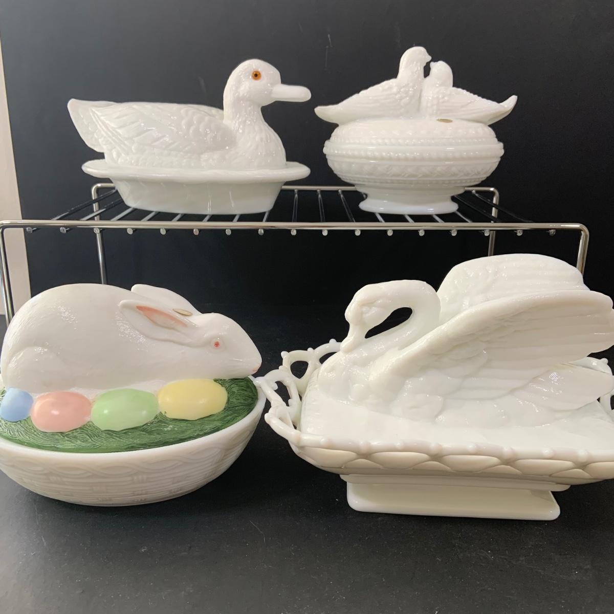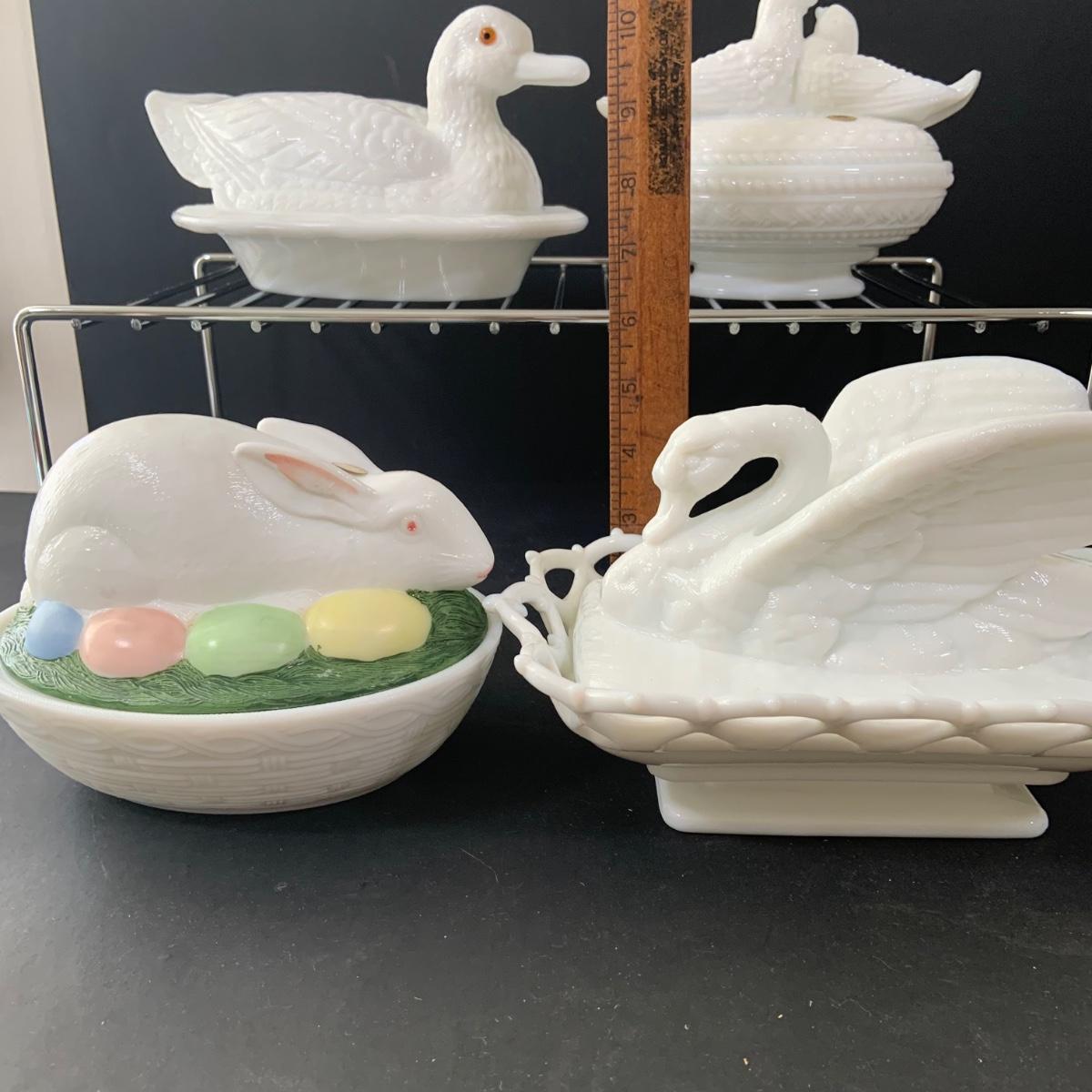 LOT:154: Westmoreland Milkglass Candy Dishes - Swan, Duck on a Nest, Doves and Easter Rabbit with Colored Eggs
