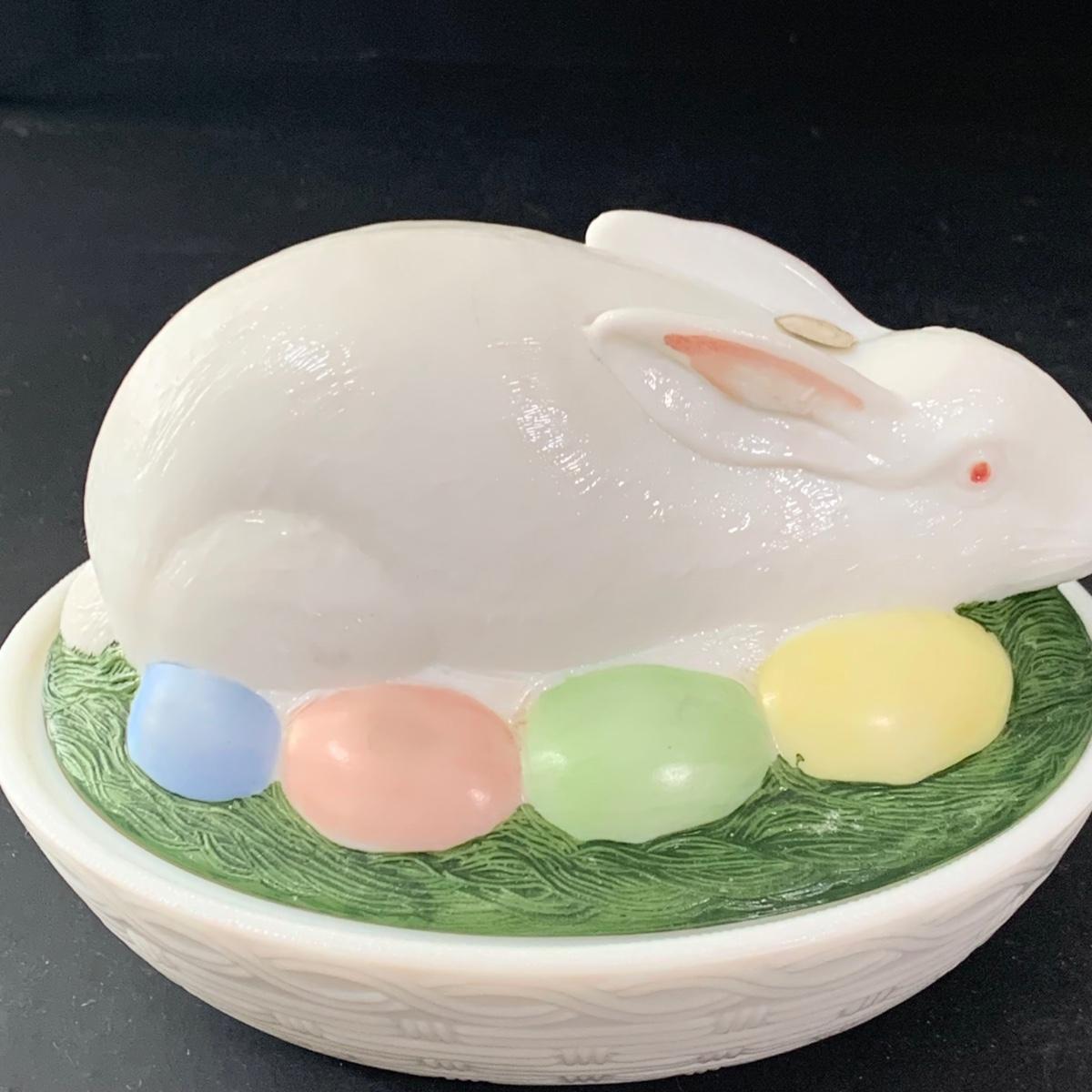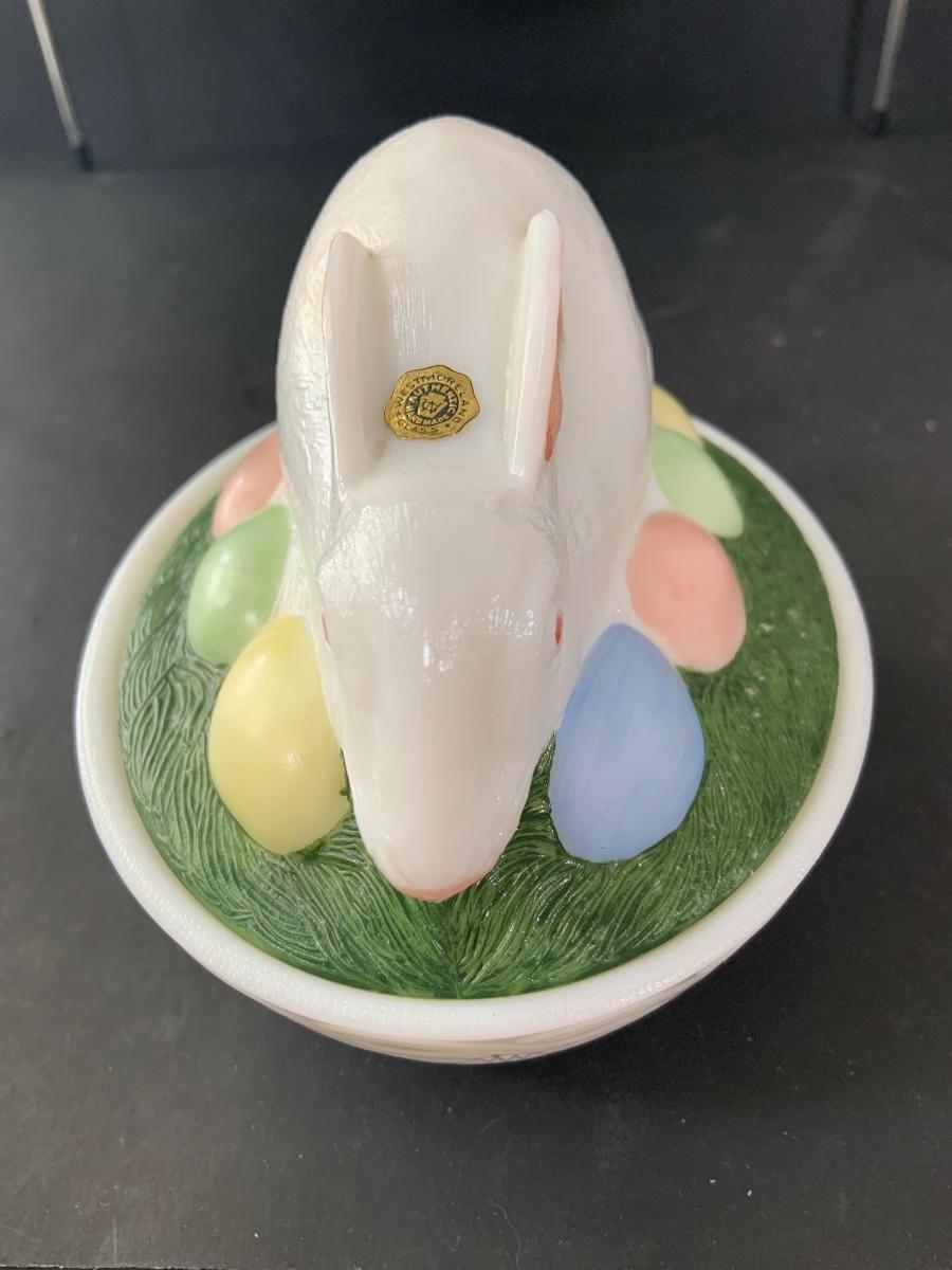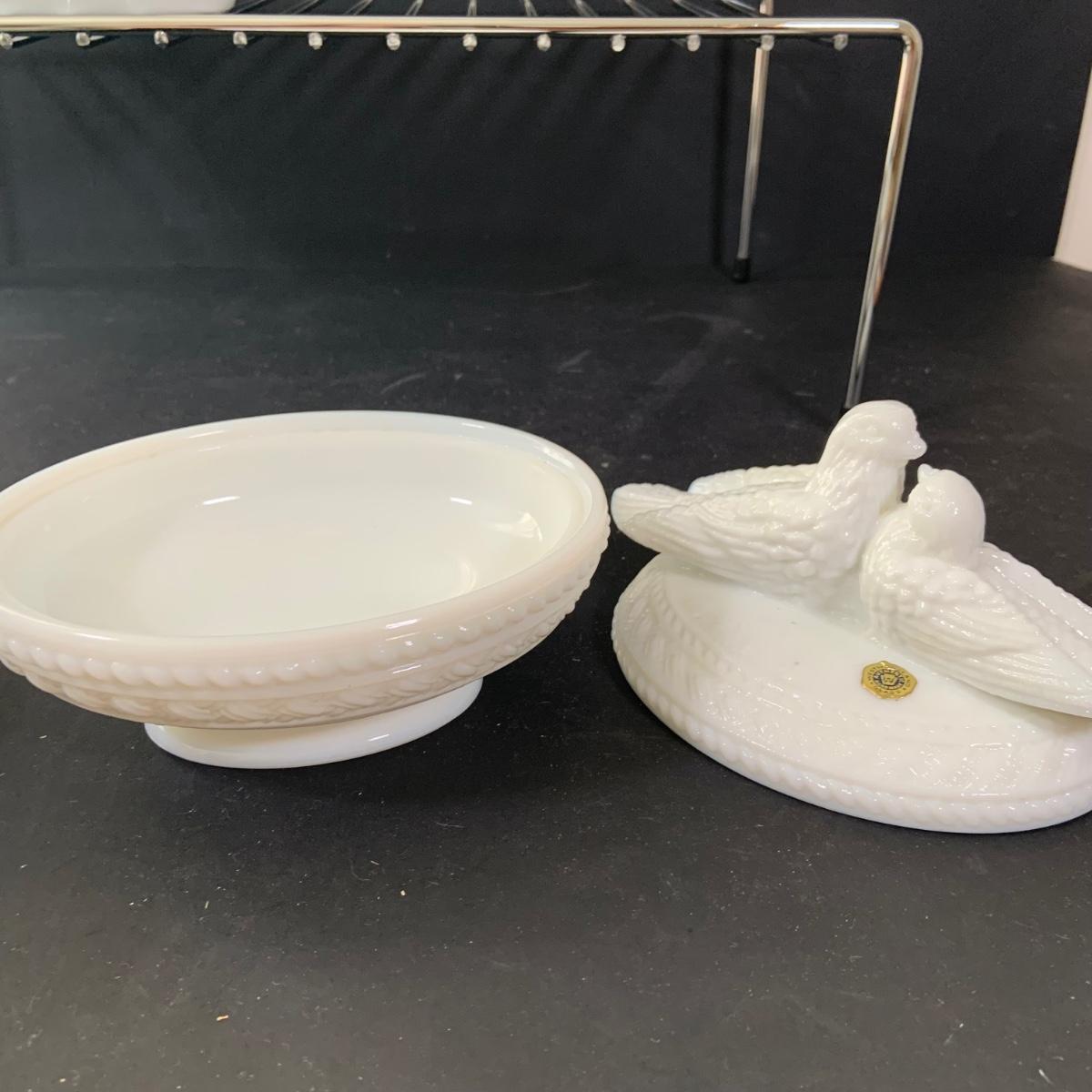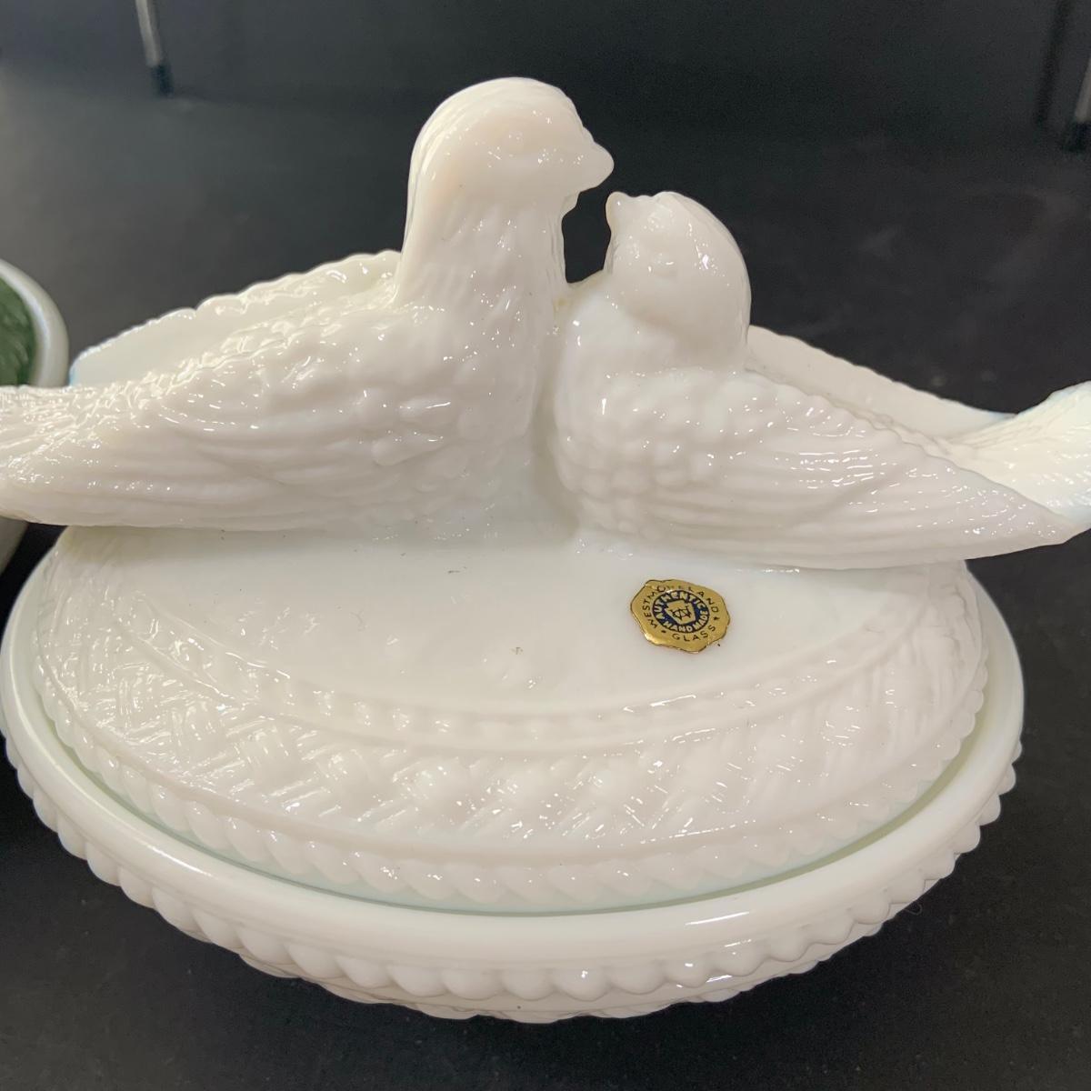 LOT:154: Westmoreland Milkglass Candy Dishes - Swan, Duck on a Nest, Doves and Easter Rabbit with Colored Eggs