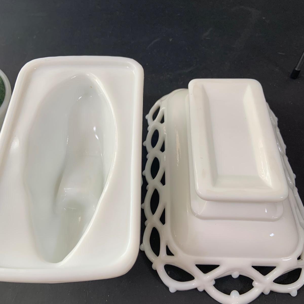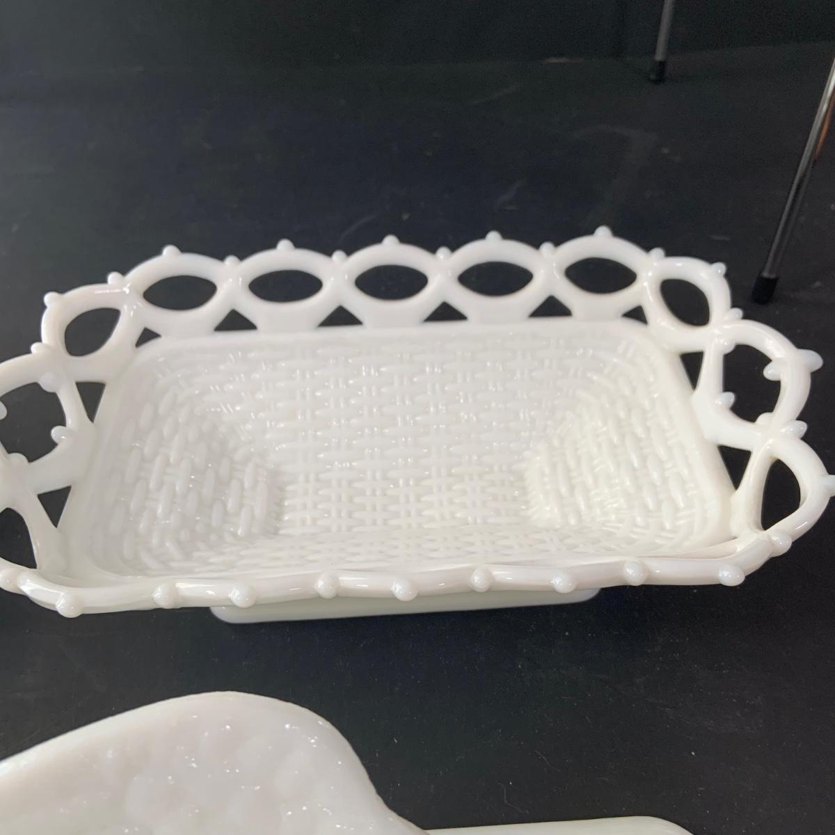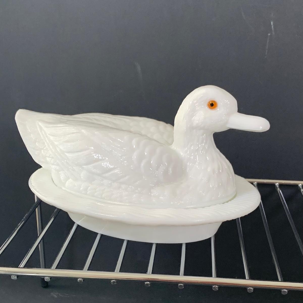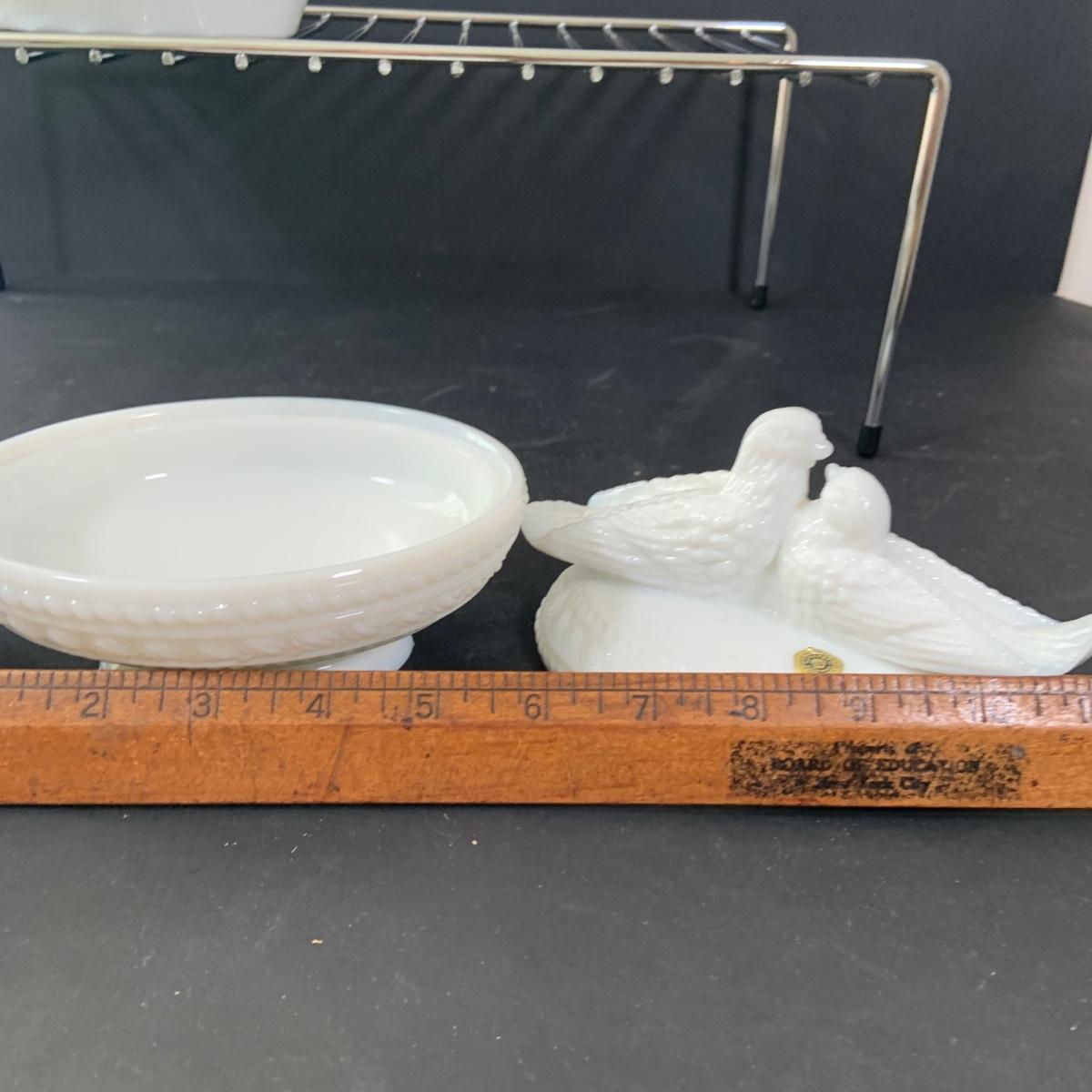 LOT:154: Westmoreland Milkglass Candy Dishes - Swan, Duck on a Nest, Doves and Easter Rabbit with Colored Eggs