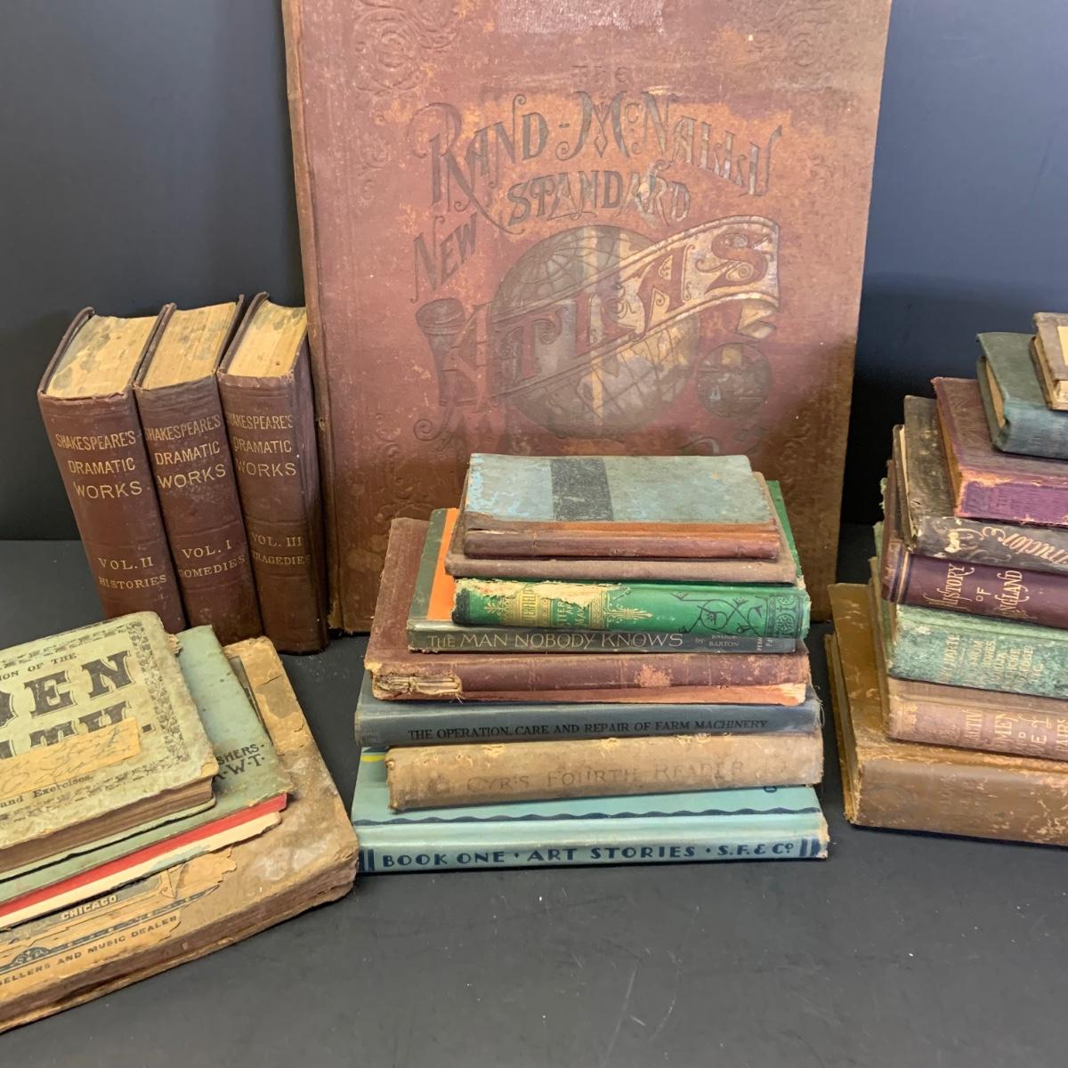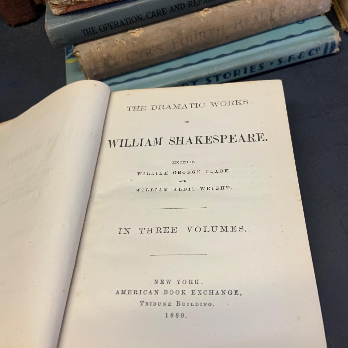 LOT:159: Large Collection of Antique Books Including William Shakespeare In 3 Volumes 1880 and Many Other From the Late 19th and Early 20th Century.