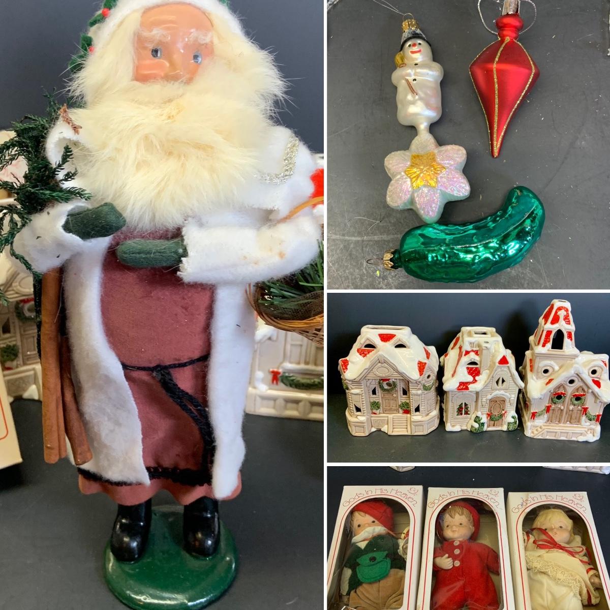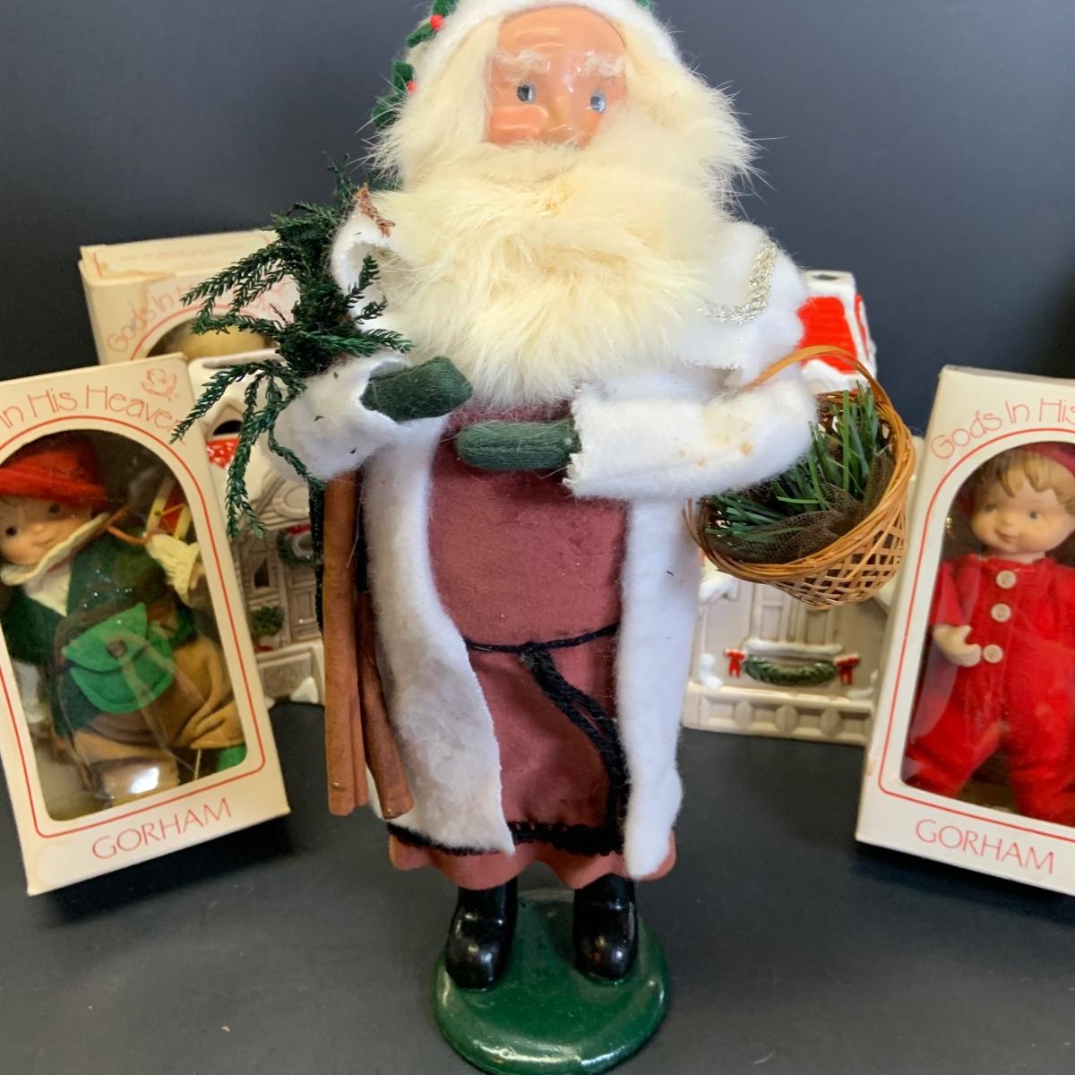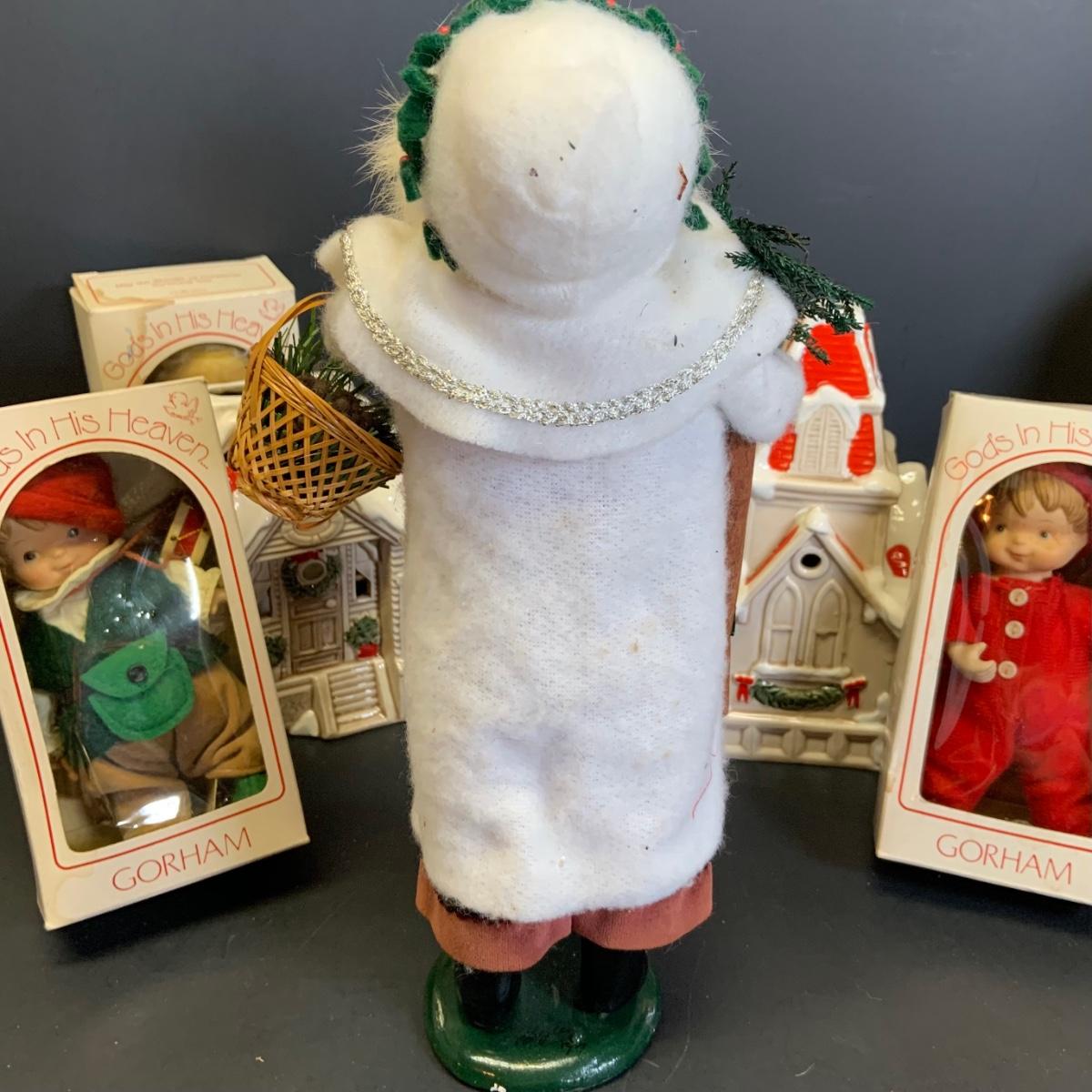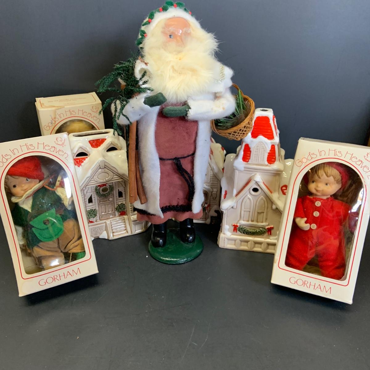 LOT:161: Byers Choice Santa Caroler, Fitz and Floyd Christmas House Candle Holder with Original Boxes, Gorham God in His Heaven Dolls Boxed Ornaments,and Mercury Glass Style Ornaments