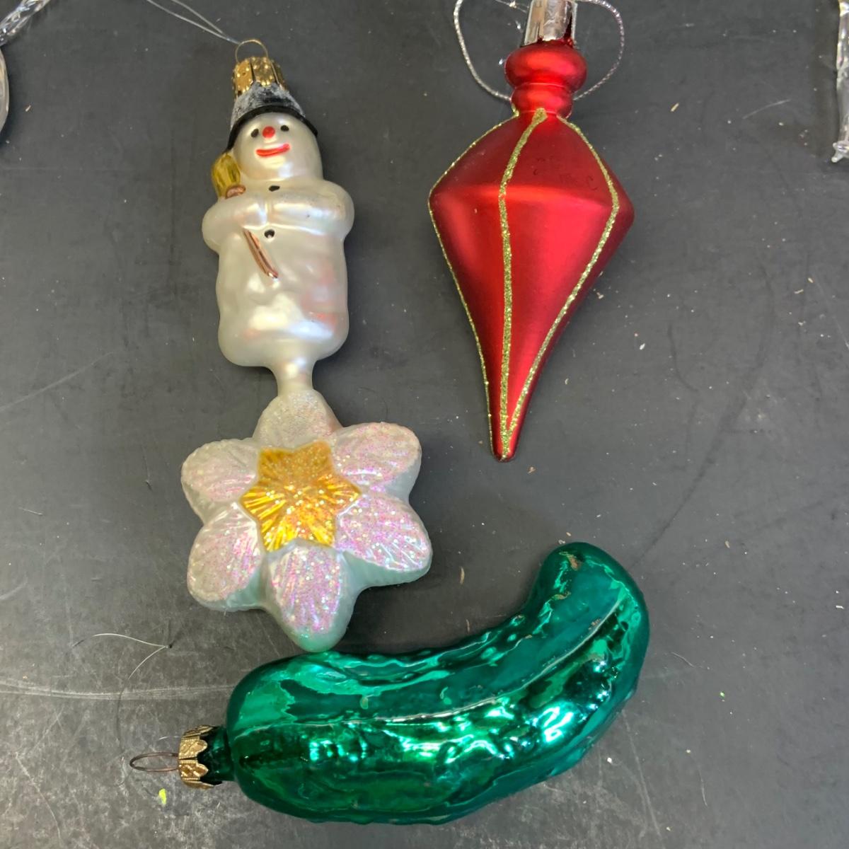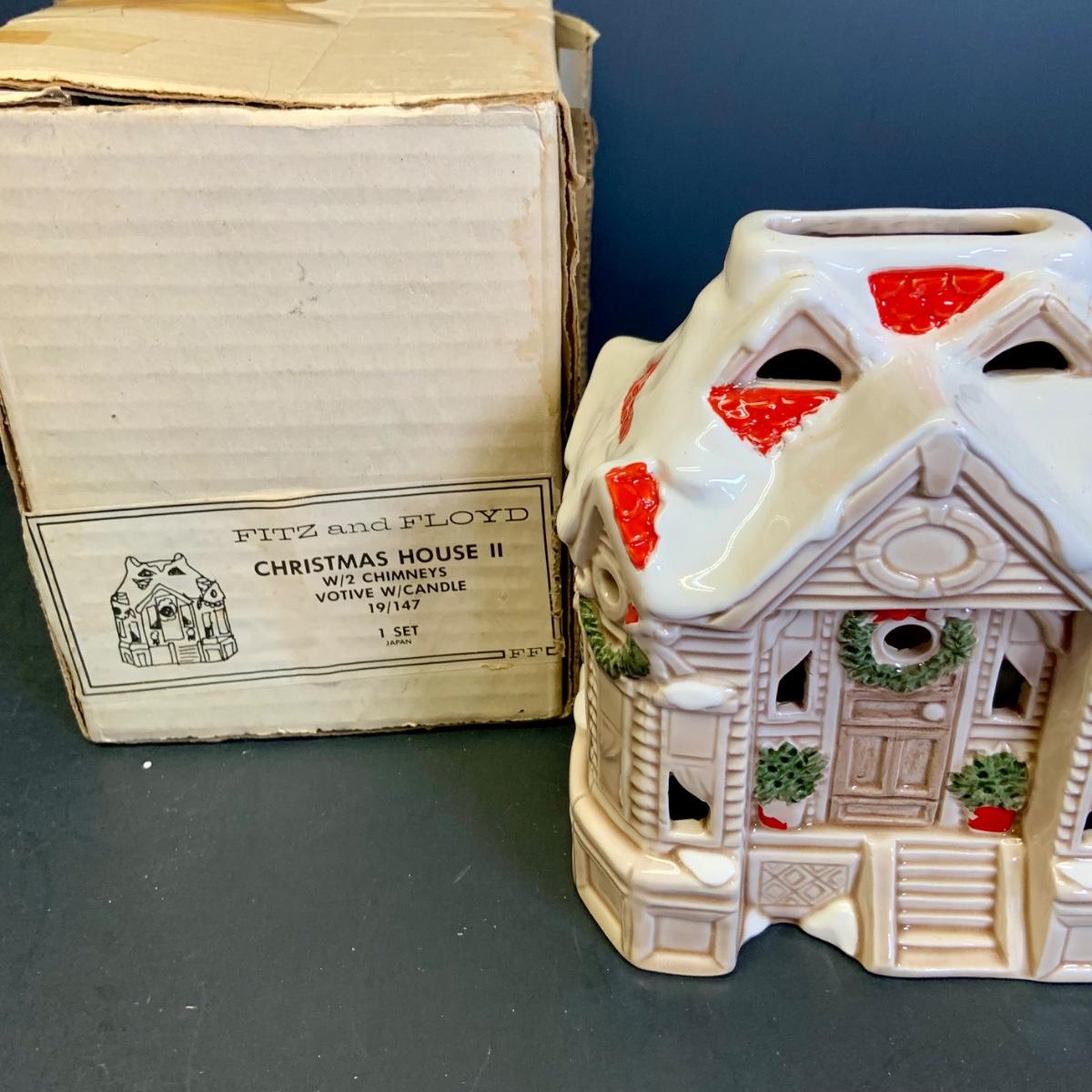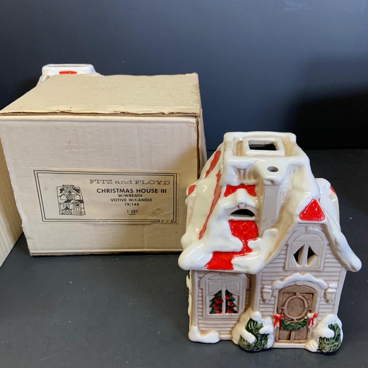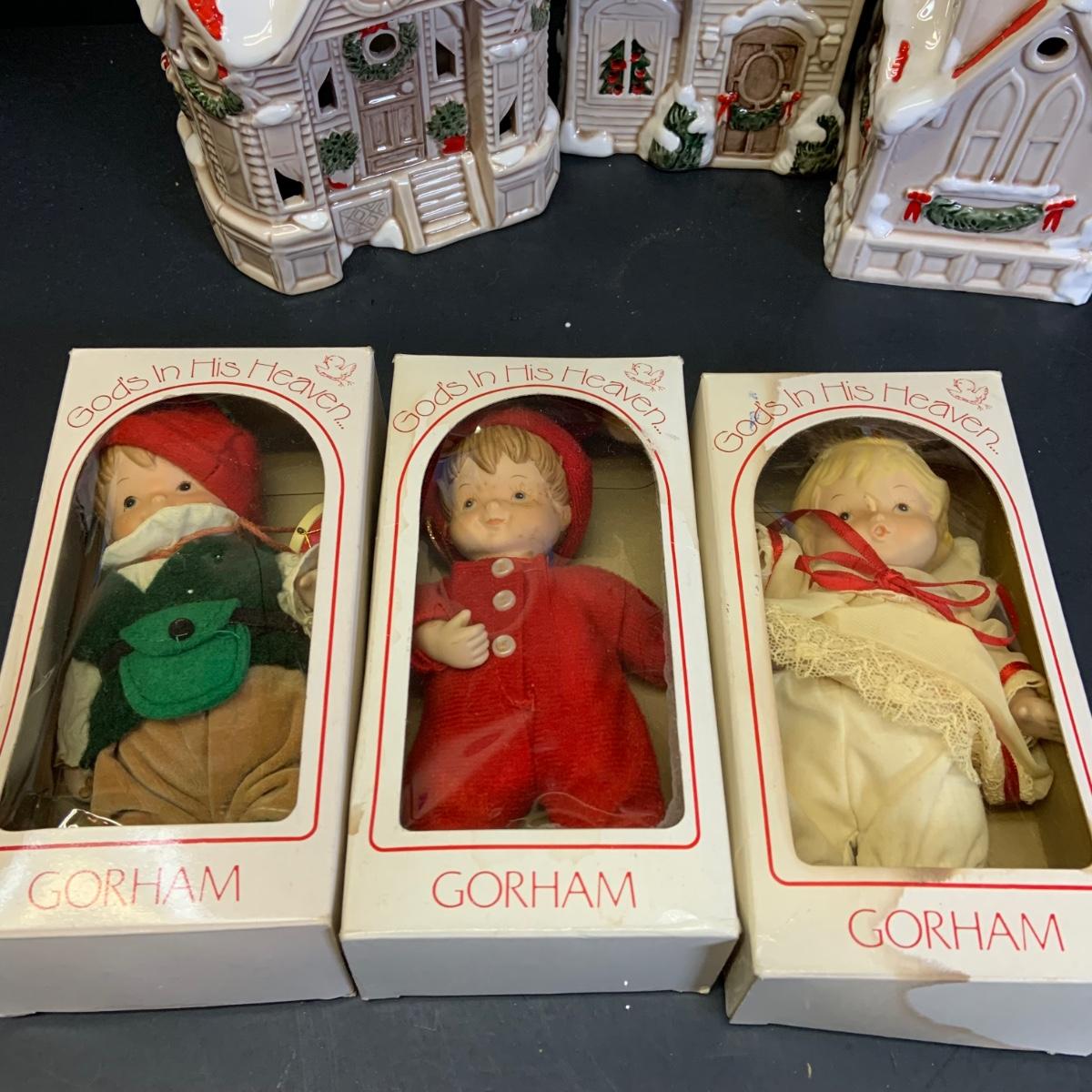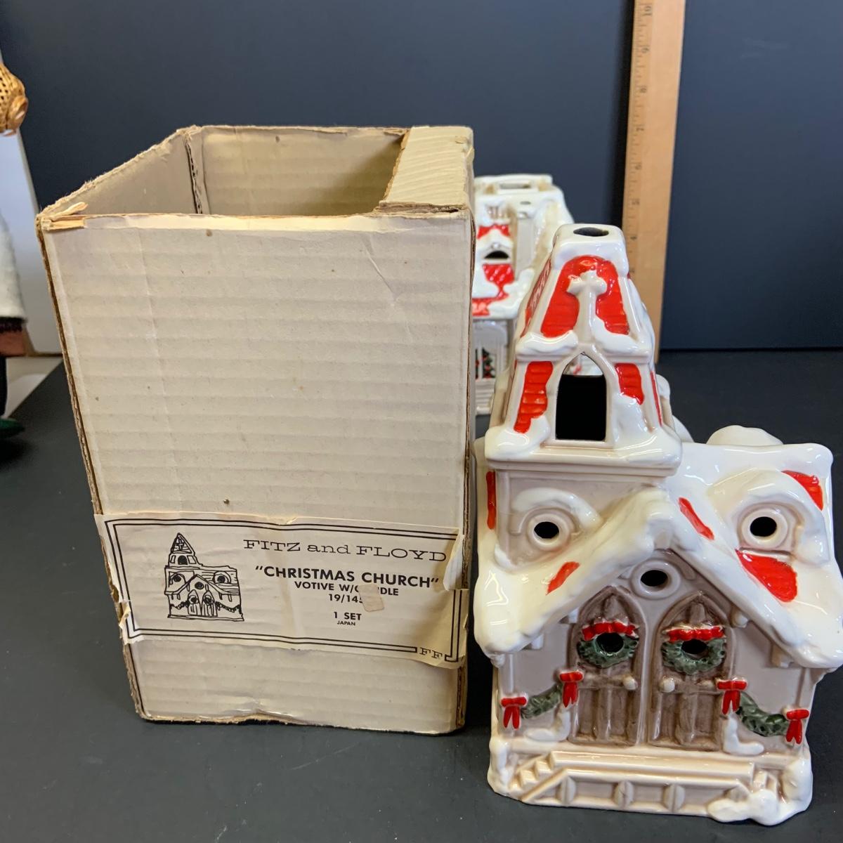 LOT:161: Byers Choice Santa Caroler, Fitz and Floyd Christmas House Candle Holder with Original Boxes, Gorham God in His Heaven Dolls Boxed Ornaments,and Mercury Glass Style Ornaments