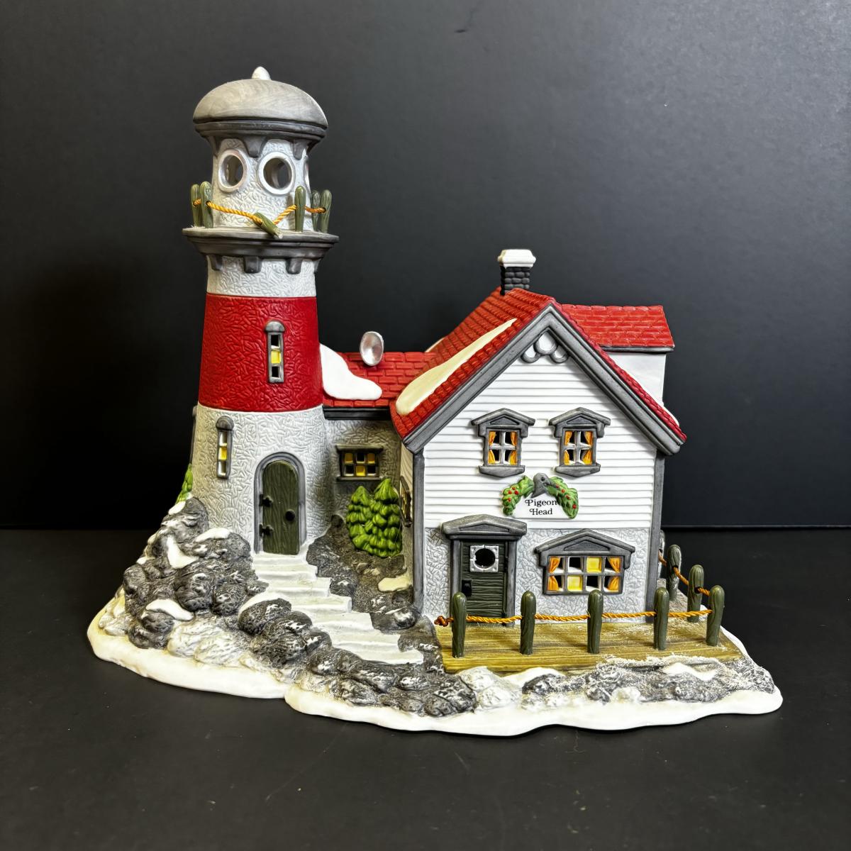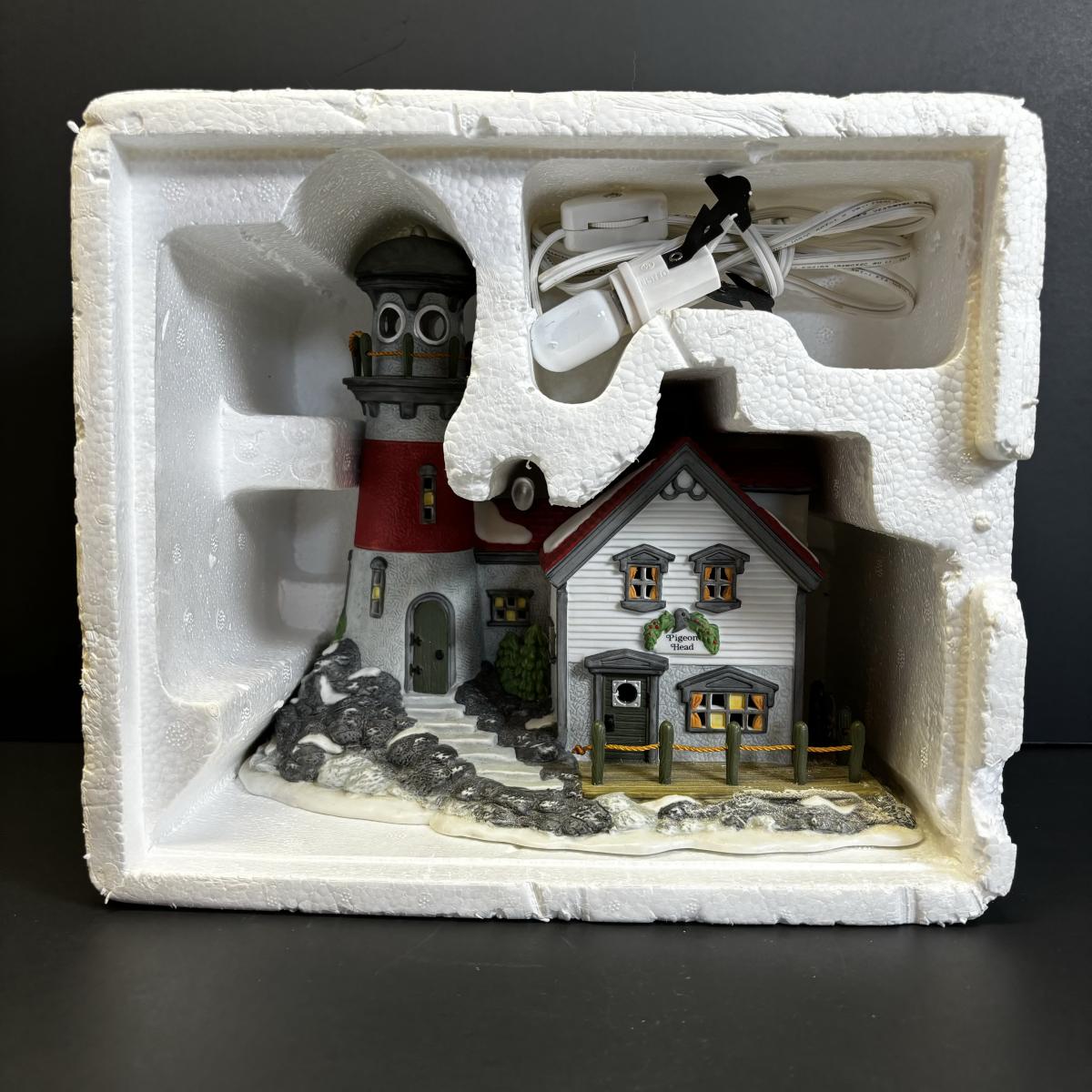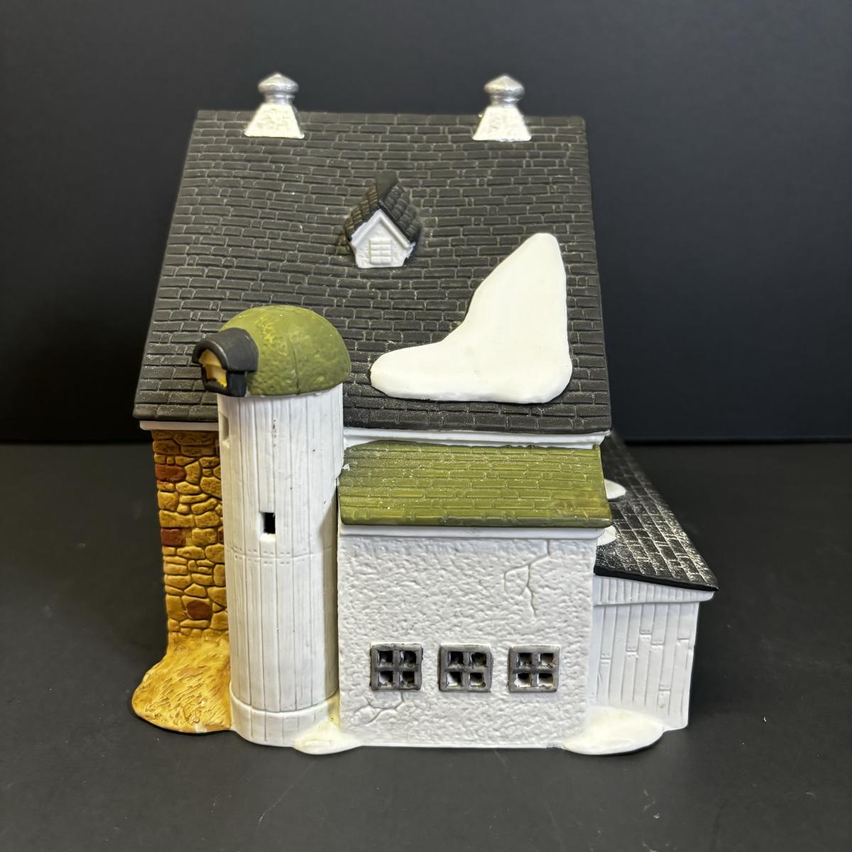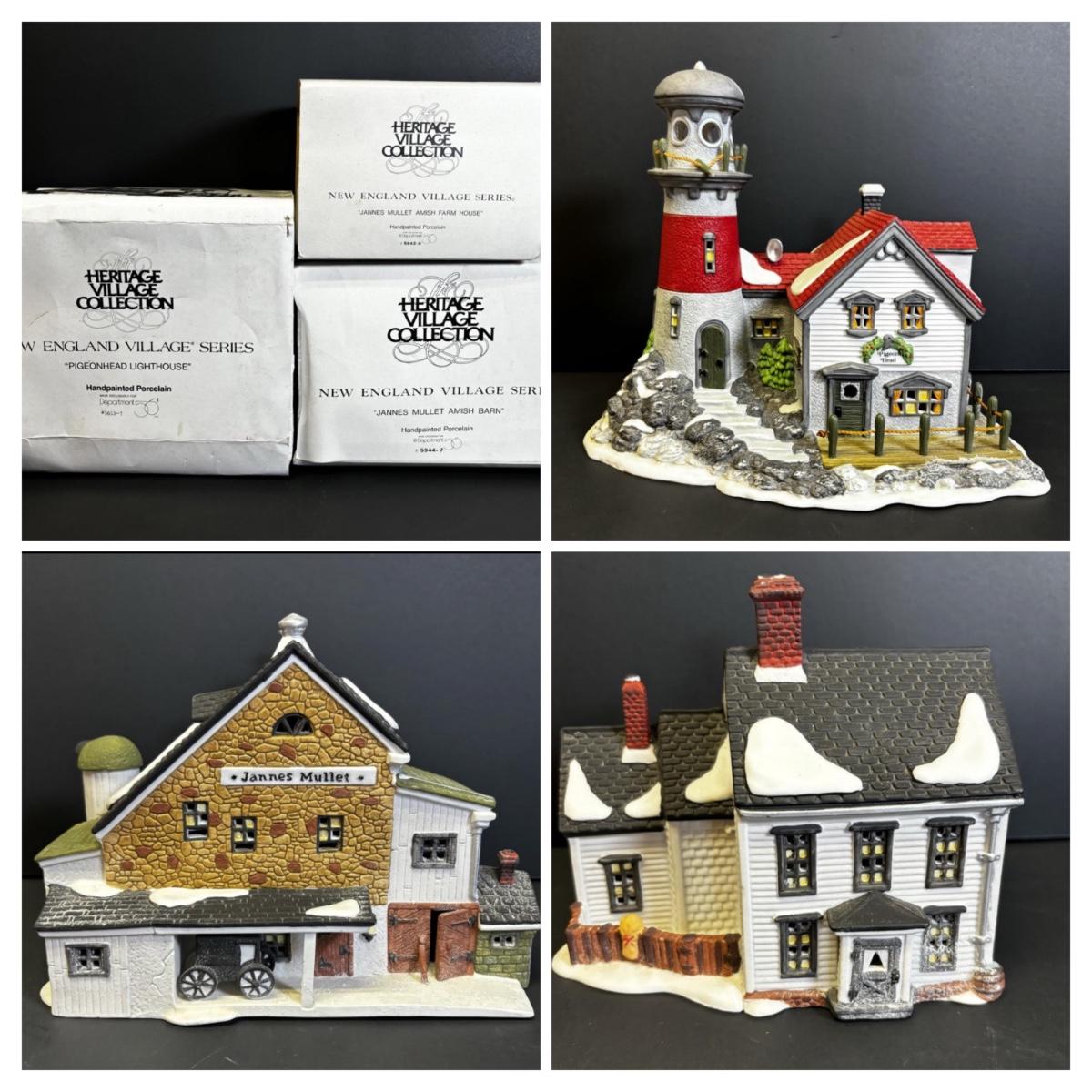 LOT 169: Vintage Department 56 New England Village Series Pigeonhead Lighthouse w/ Jannes Mullet Amish Farm House & Barn