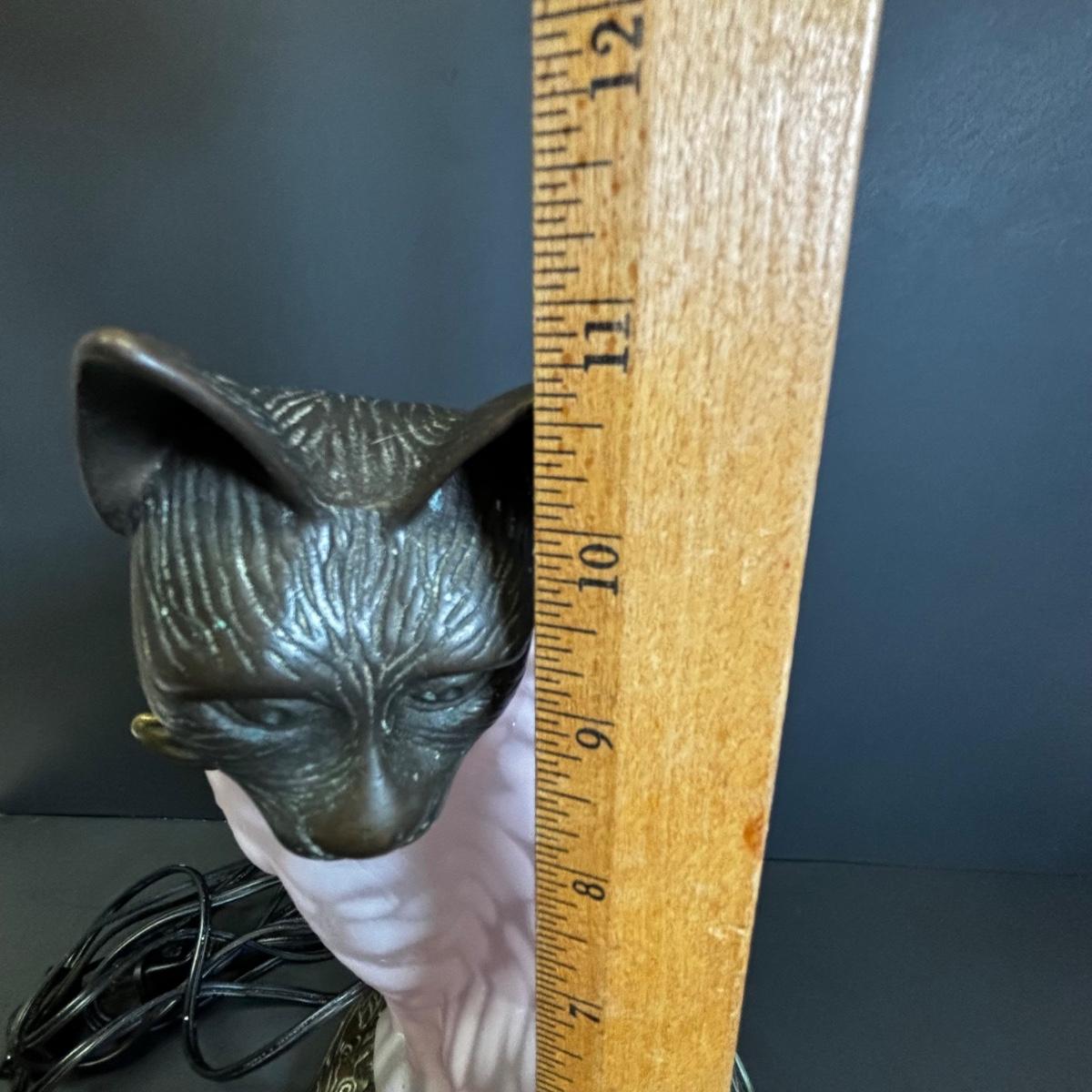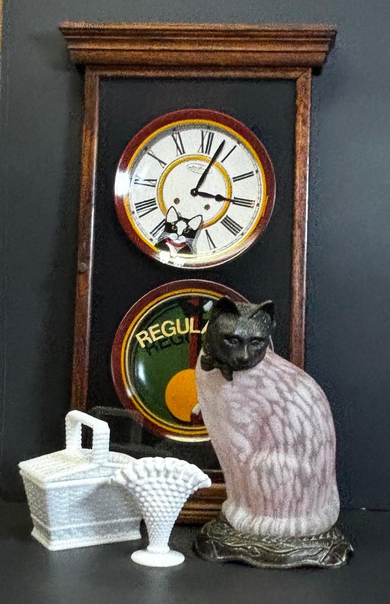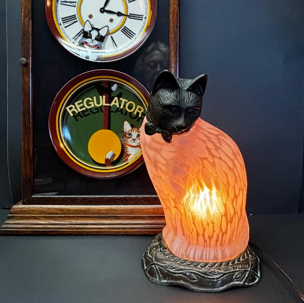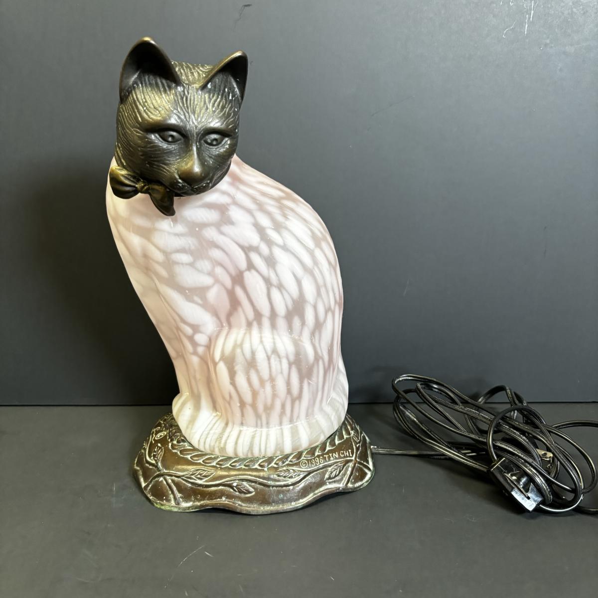 LOT 173: Vintage Andrea by Sadek 1996 Tin Chi Cat Lamp, Anna Perenna 'Dickory' and 'Tick Tock Clock' Set & Milk Glass Basket and Vase