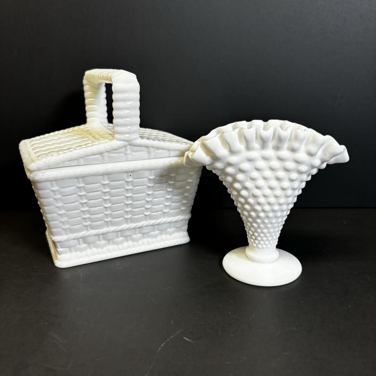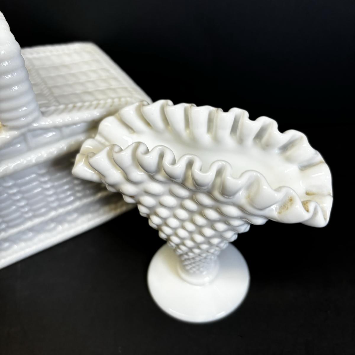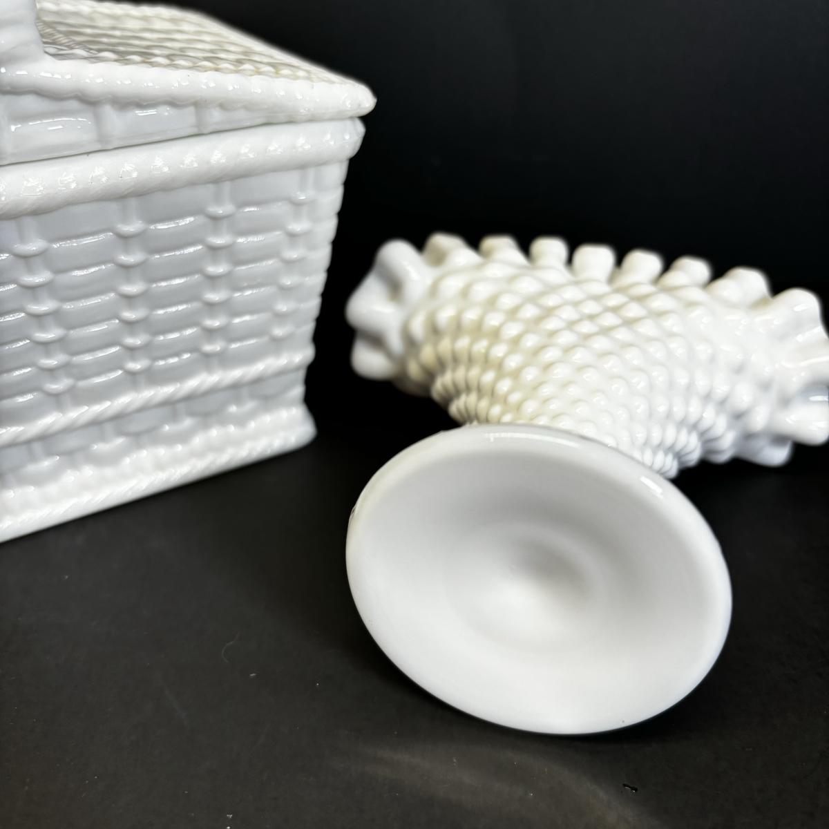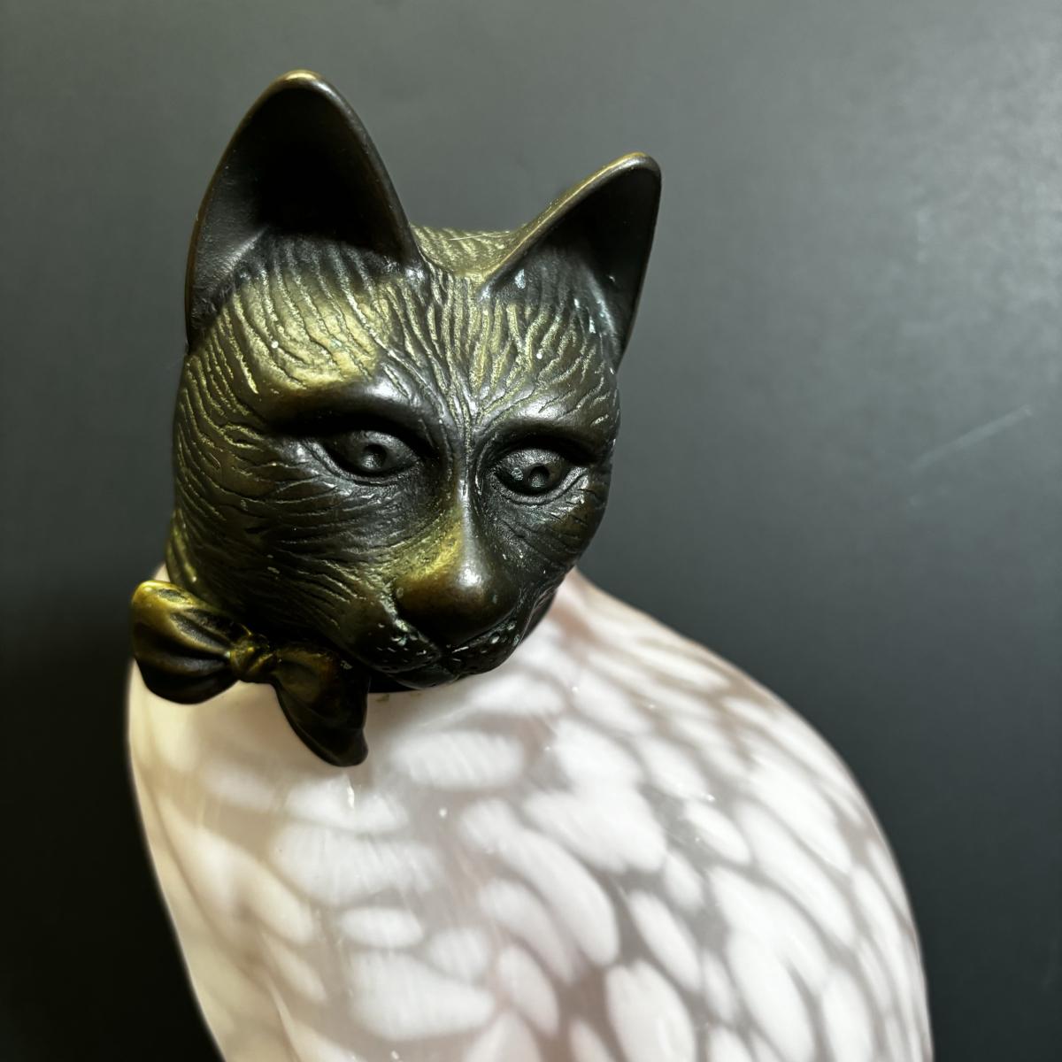 LOT 173: Vintage Andrea by Sadek 1996 Tin Chi Cat Lamp, Anna Perenna 'Dickory' and 'Tick Tock Clock' Set & Milk Glass Basket and Vase