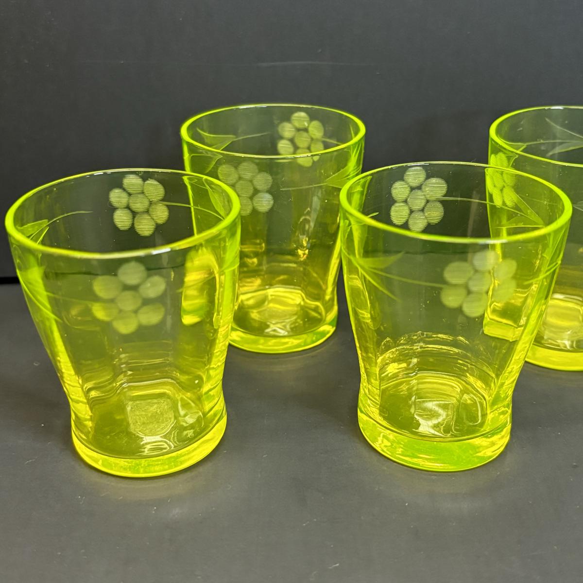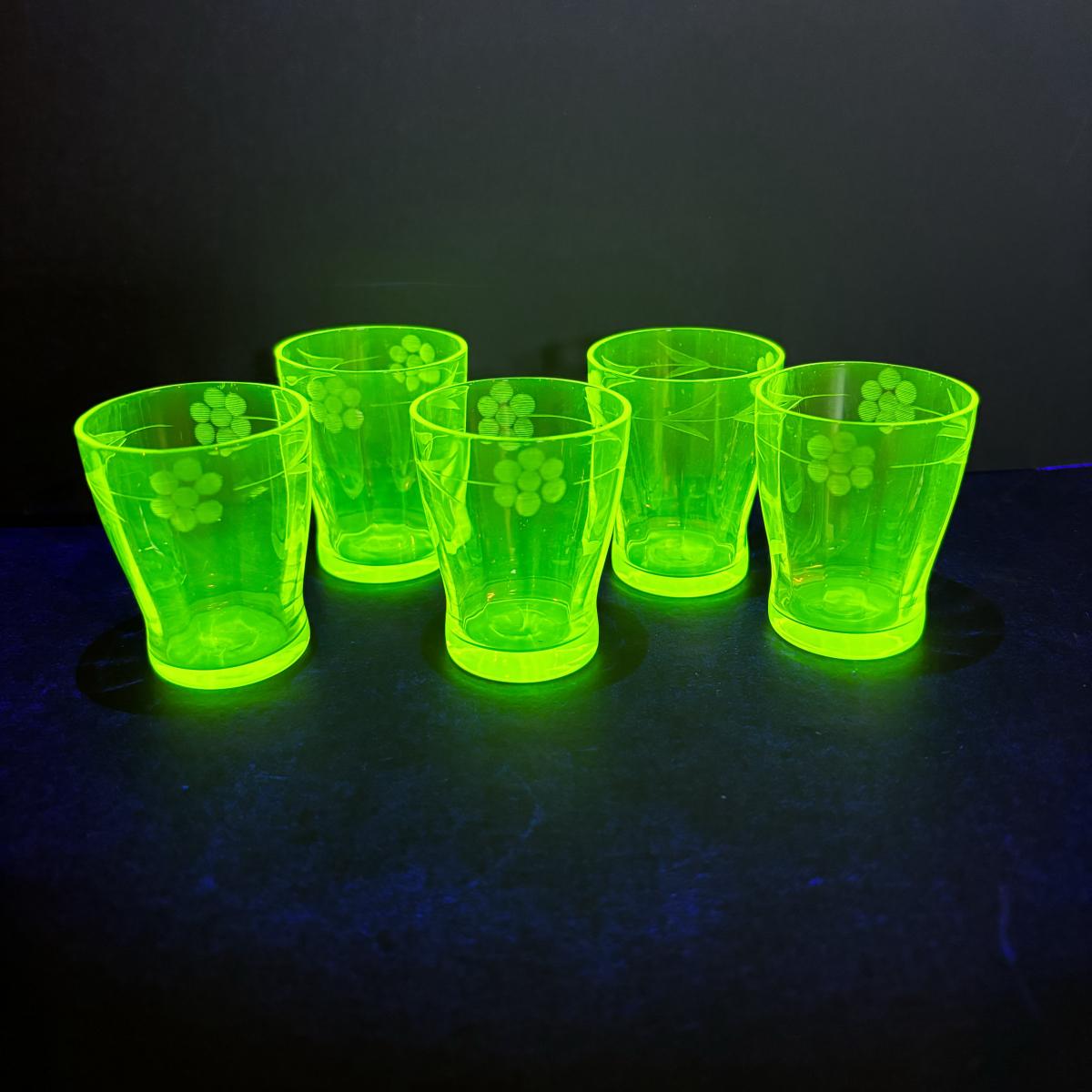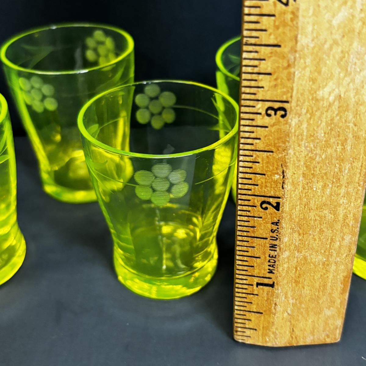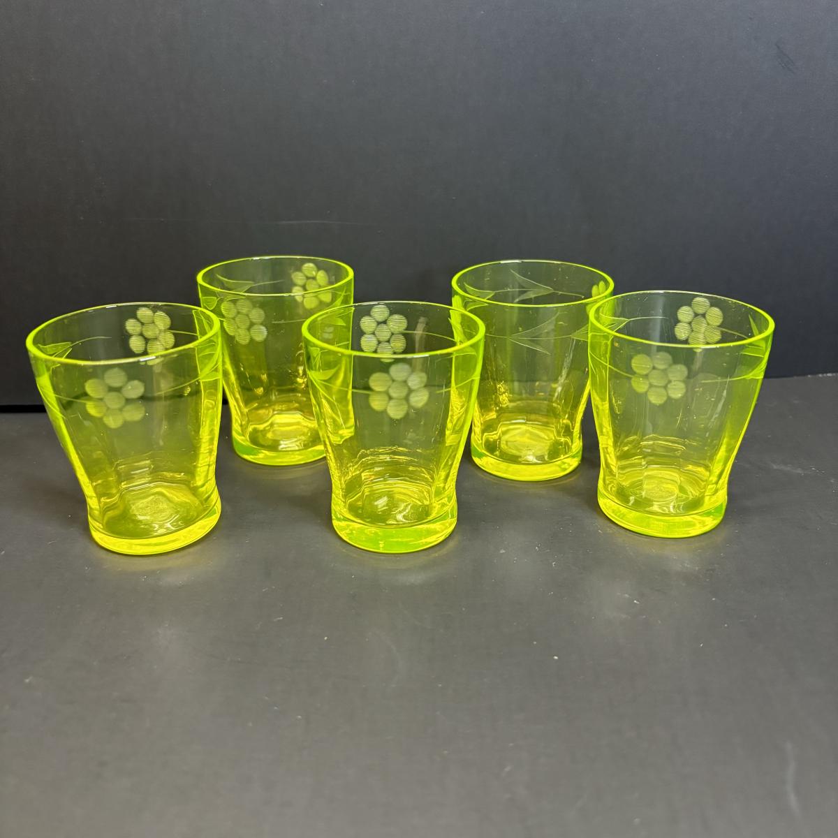 LOT 179: Set of 5 Vintage Etched Vaseline/Uranium After Dinner Cordial Glasses