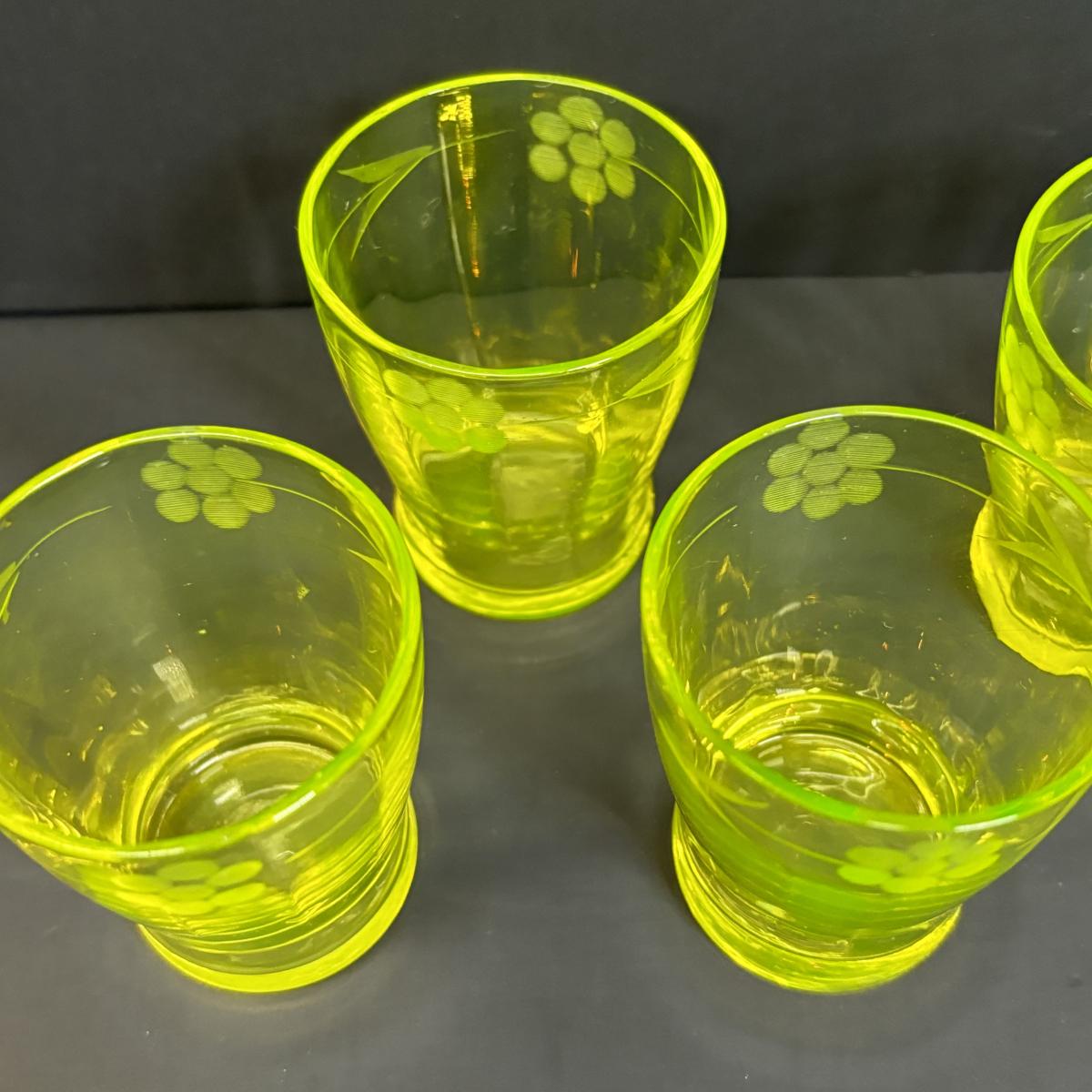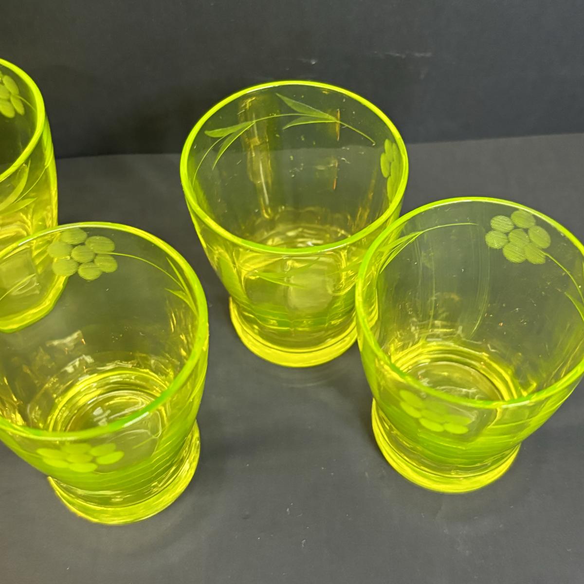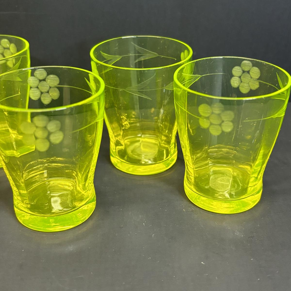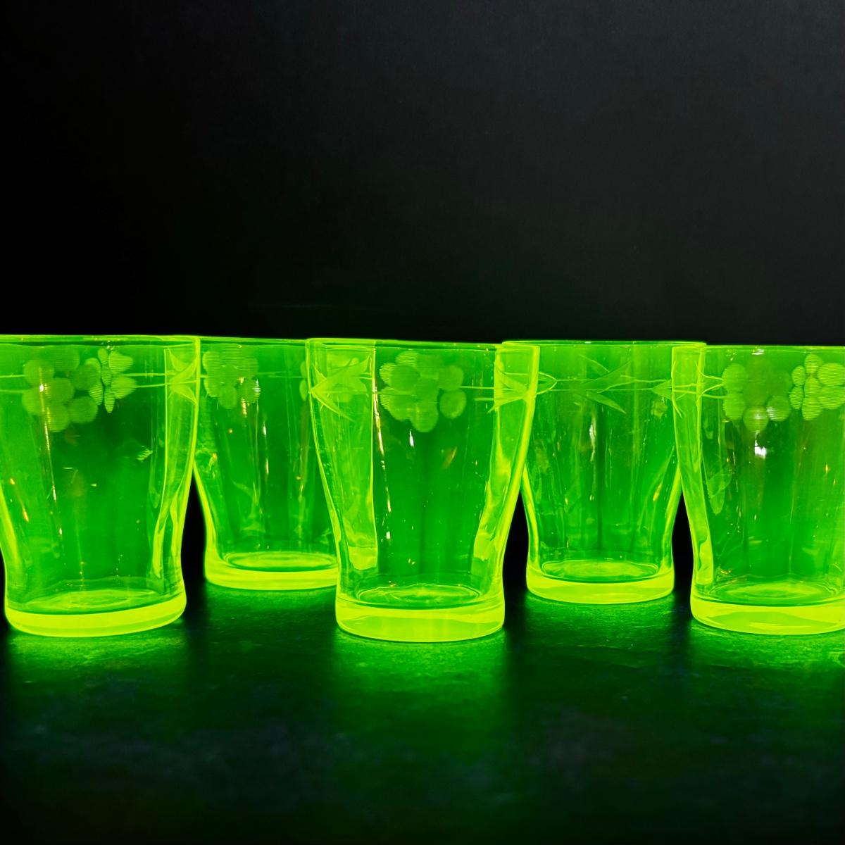 LOT 179: Set of 5 Vintage Etched Vaseline/Uranium After Dinner Cordial Glasses