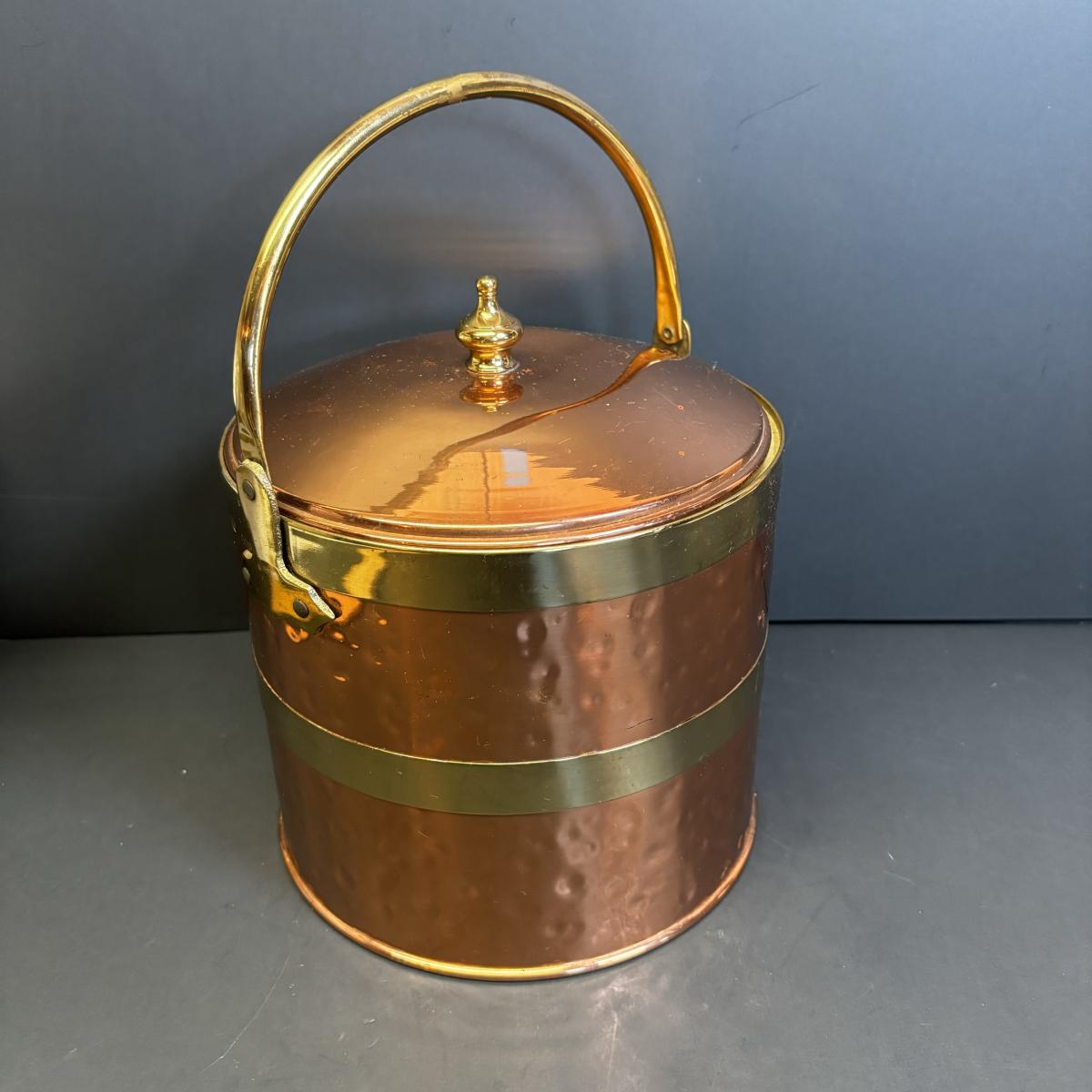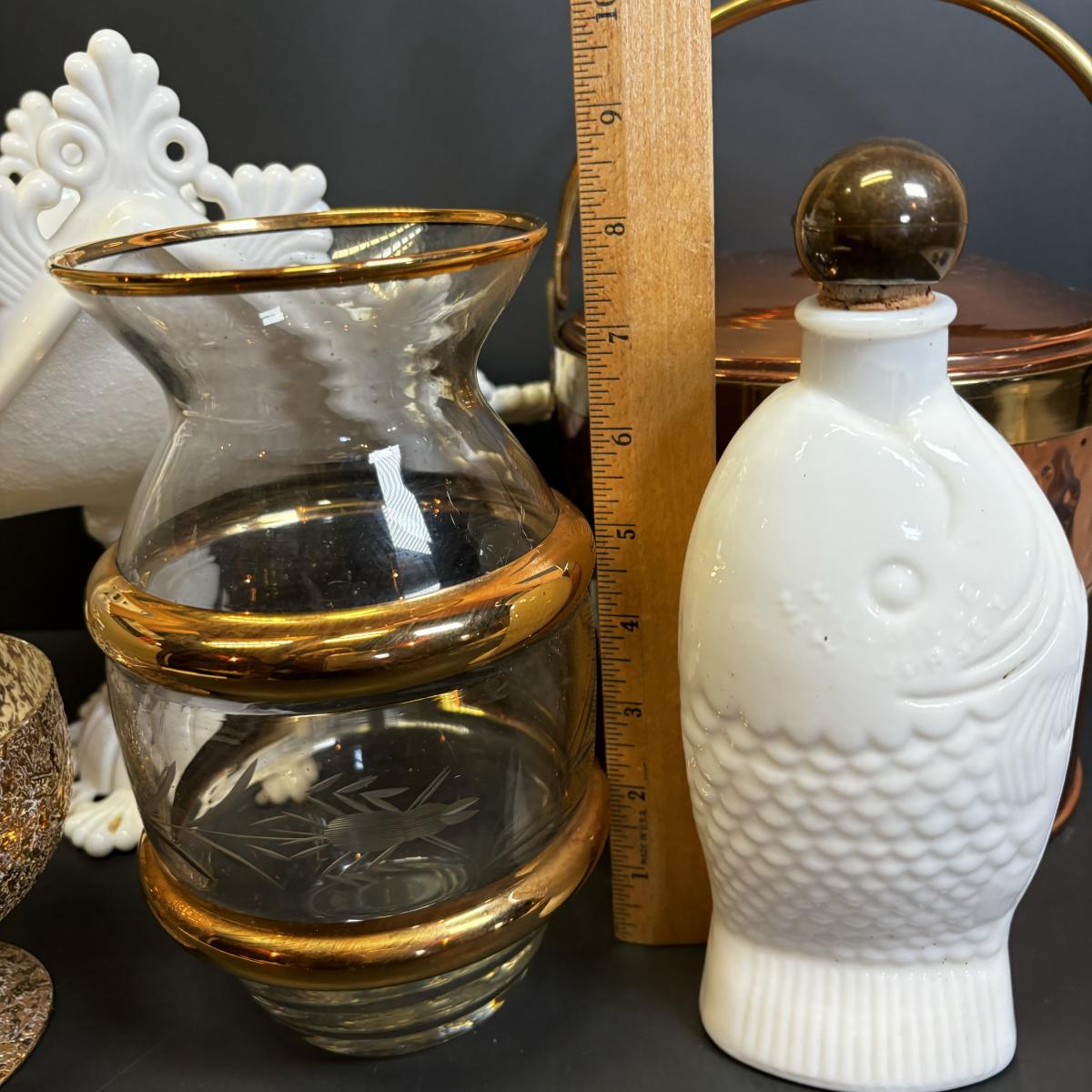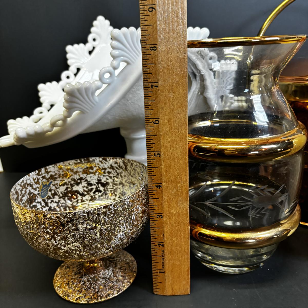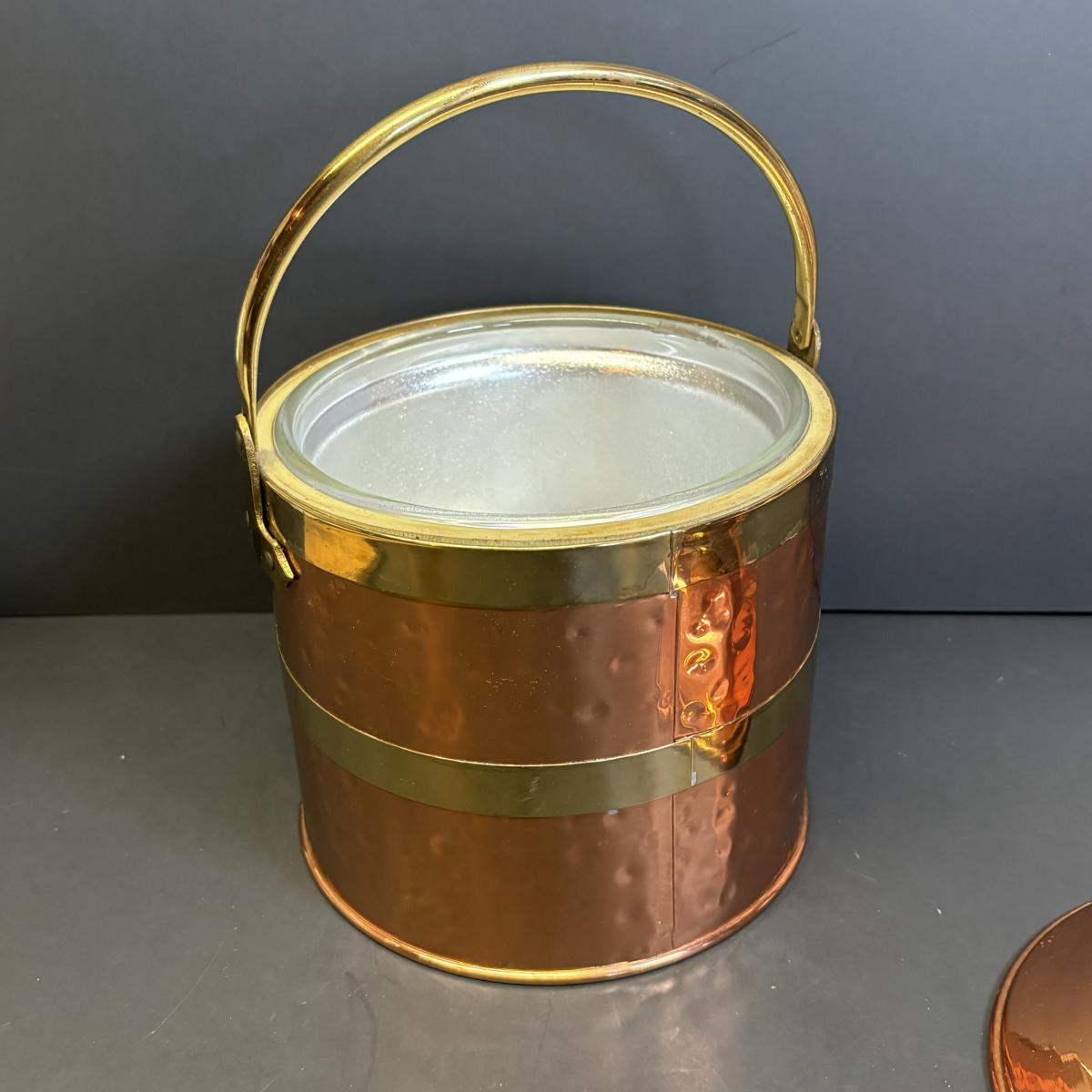LOT 182: Handcrafted Copper Ice Bucket w/Pyrex Liner, Westmoreland Milk Glass Dessert Dish, West Virginia Art Glass Dish & More