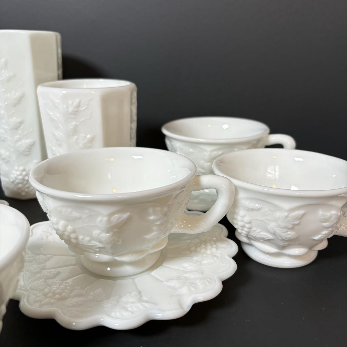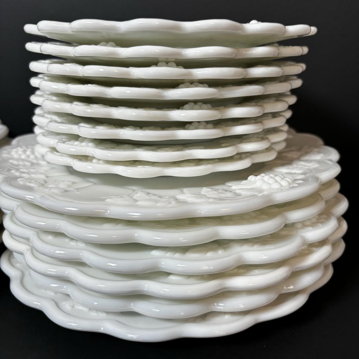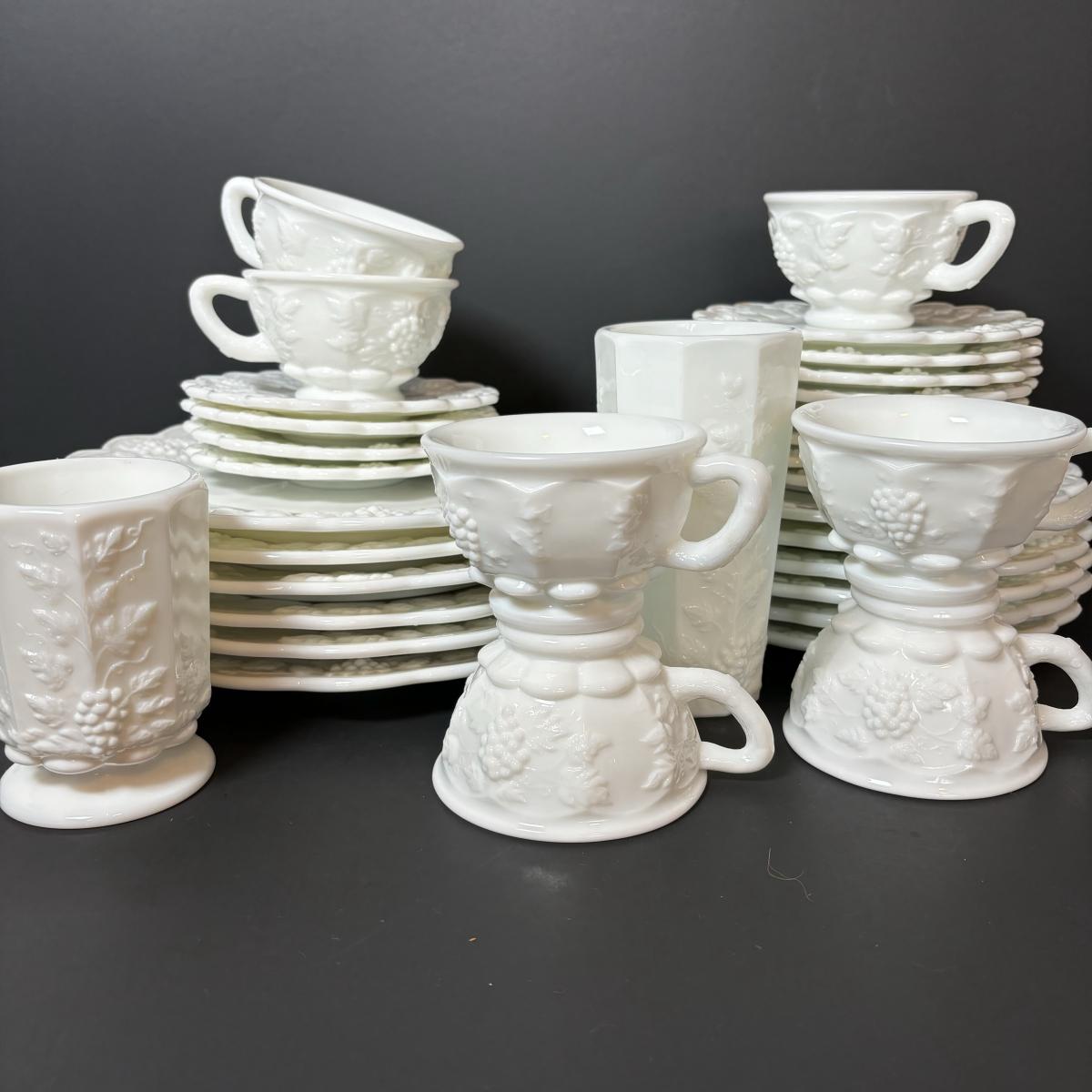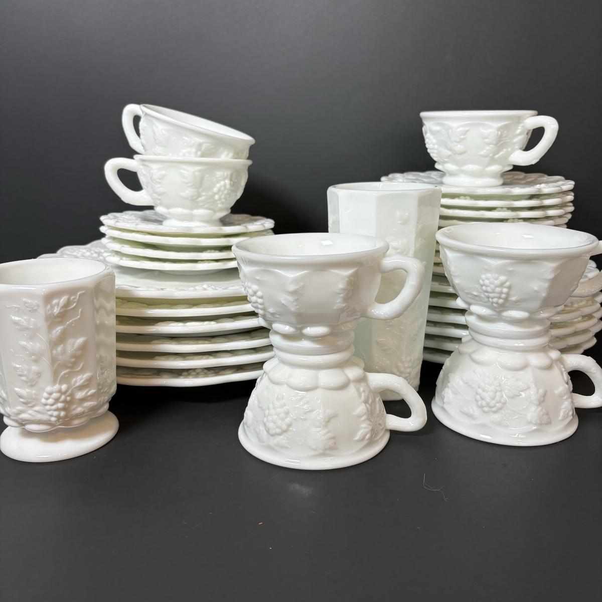 LOT 189: Westmoreland Grape Pattern Dish Set: Dinner, Salad, & Dessert Plates, Cups w/Saucers