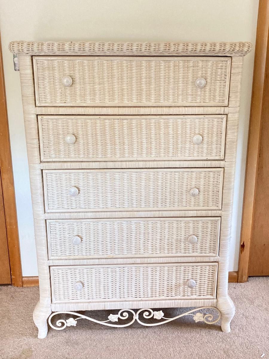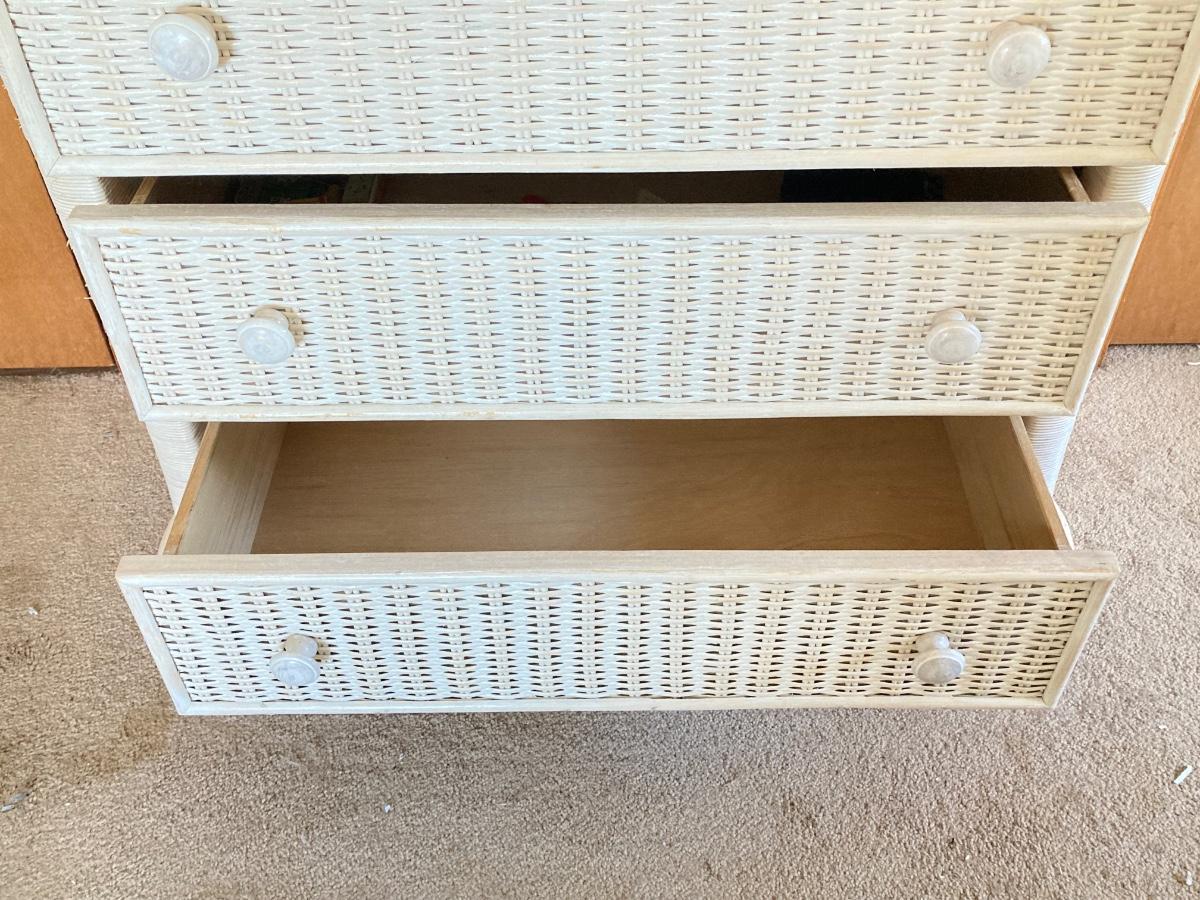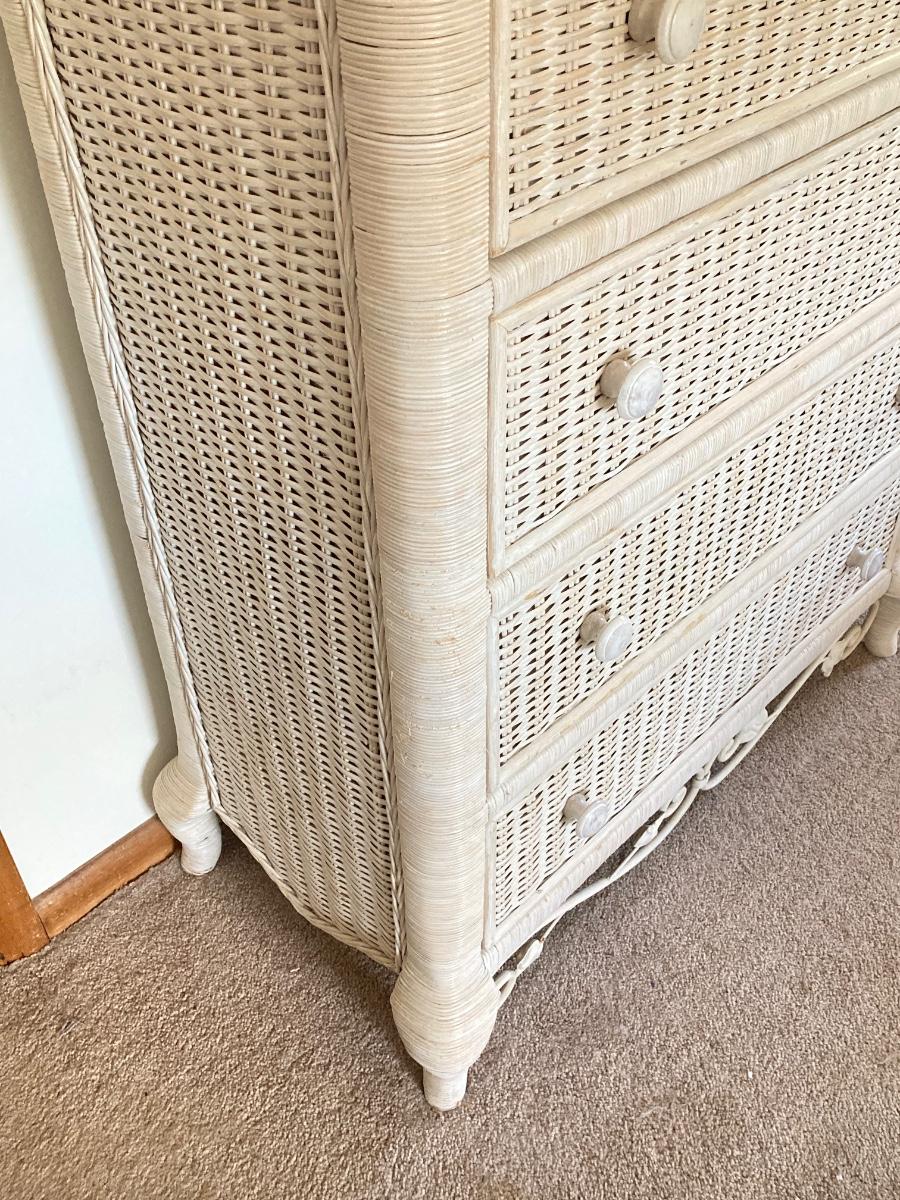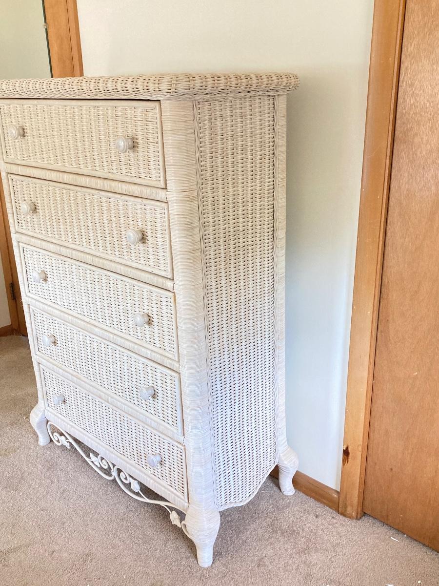 LOT 217: Boho / Shabby Chic-Style 5 Drawer Wicker Highboy Dresser