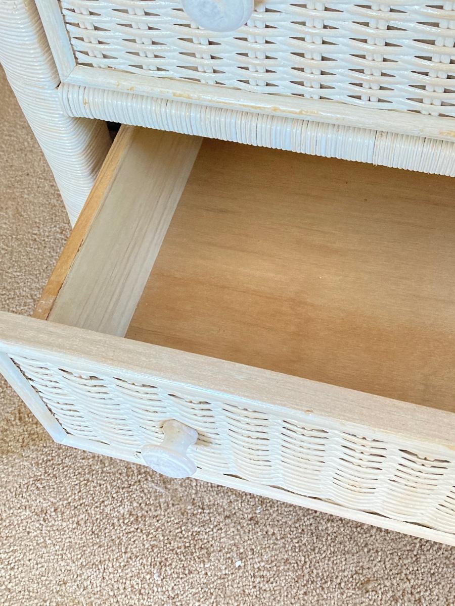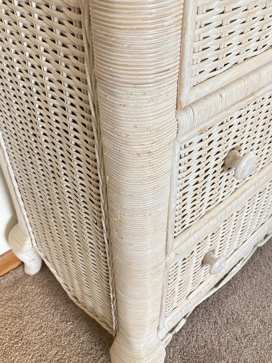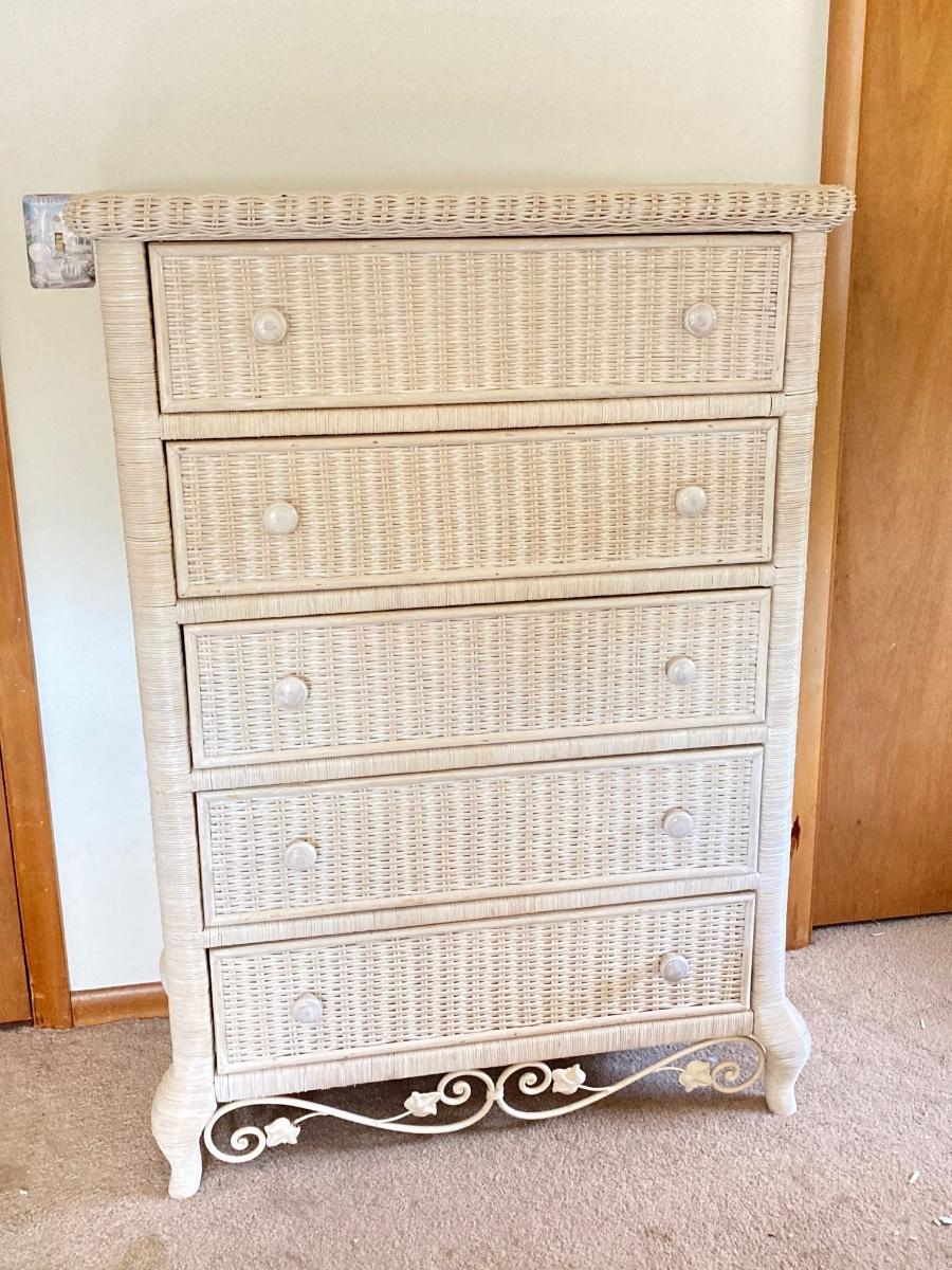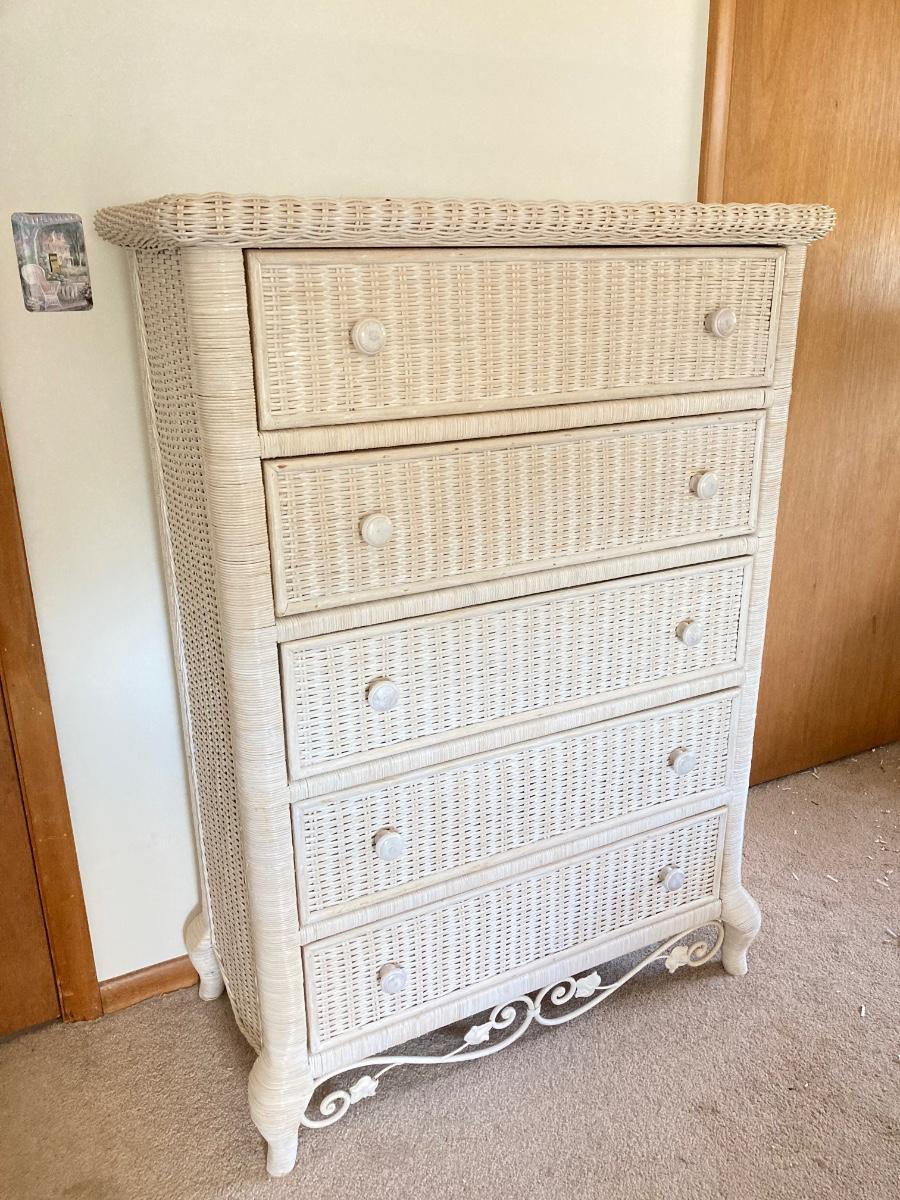 LOT 217: Boho / Shabby Chic-Style 5 Drawer Wicker Highboy Dresser