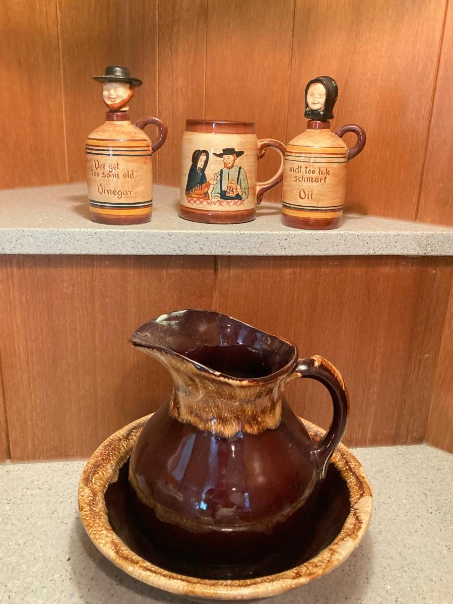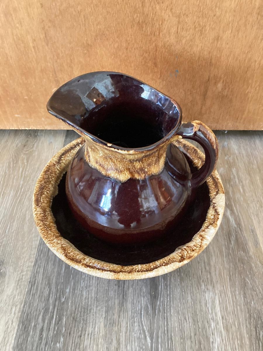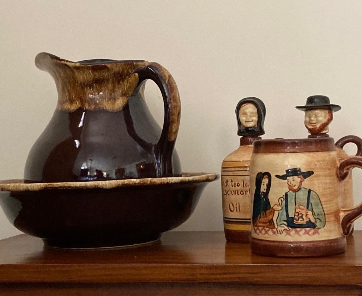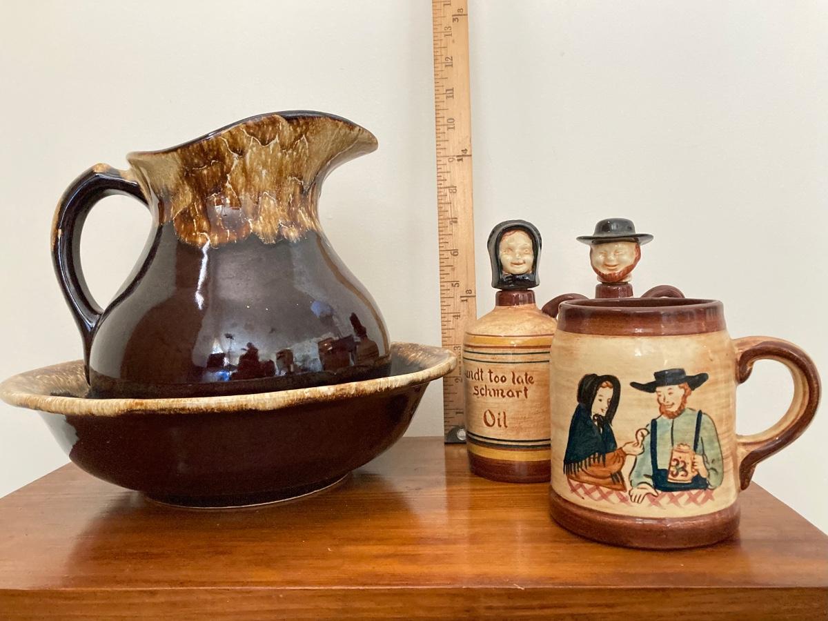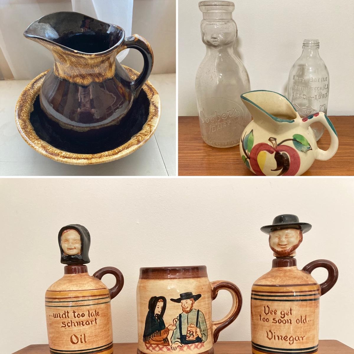 LOT 228: Vintage Roseville Bowl with Brown Drip Pitcher, Pennsbury Pottery Cruets and Mug, Cop the Cream Milk Bottle & More