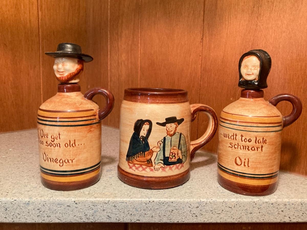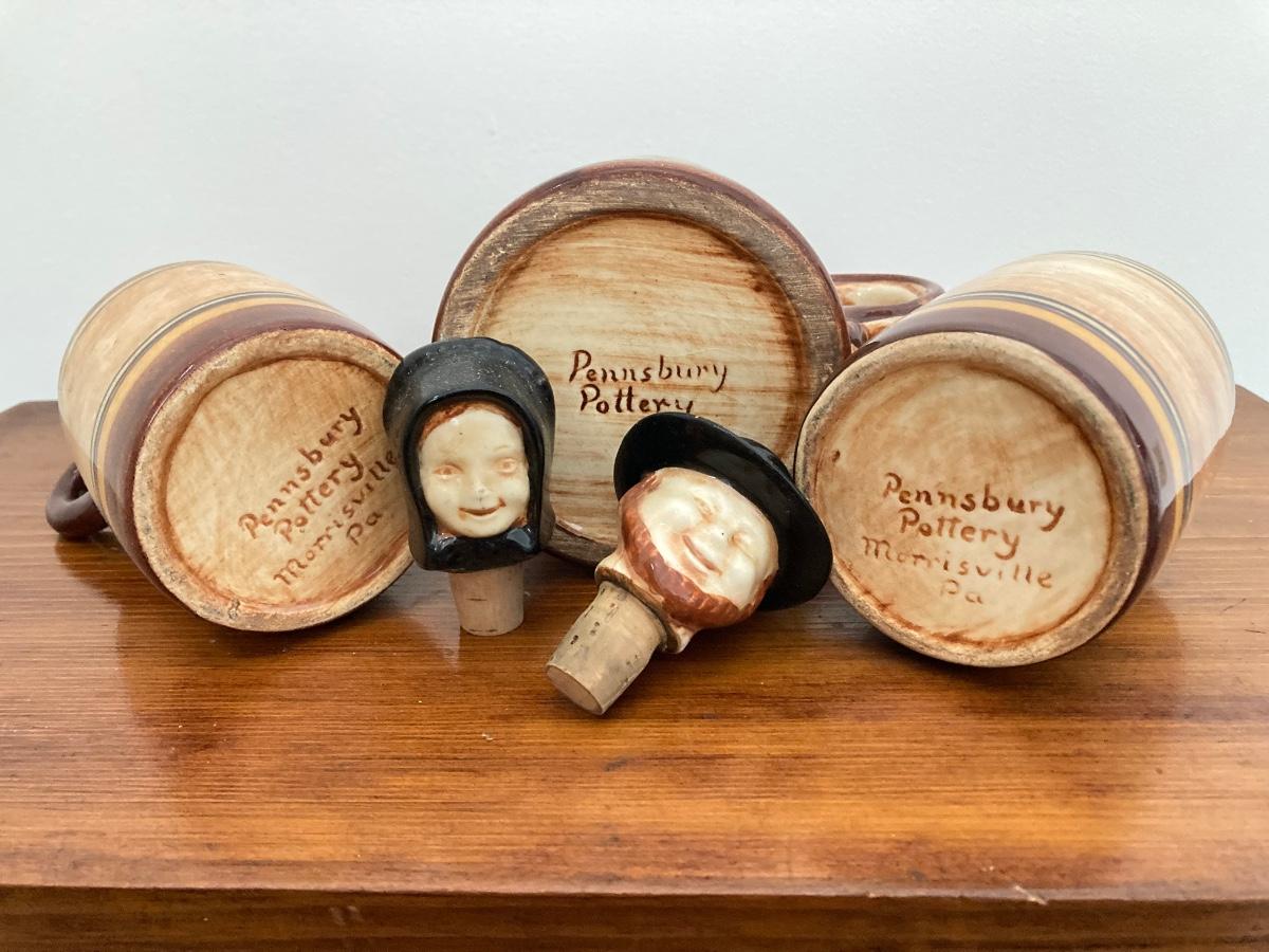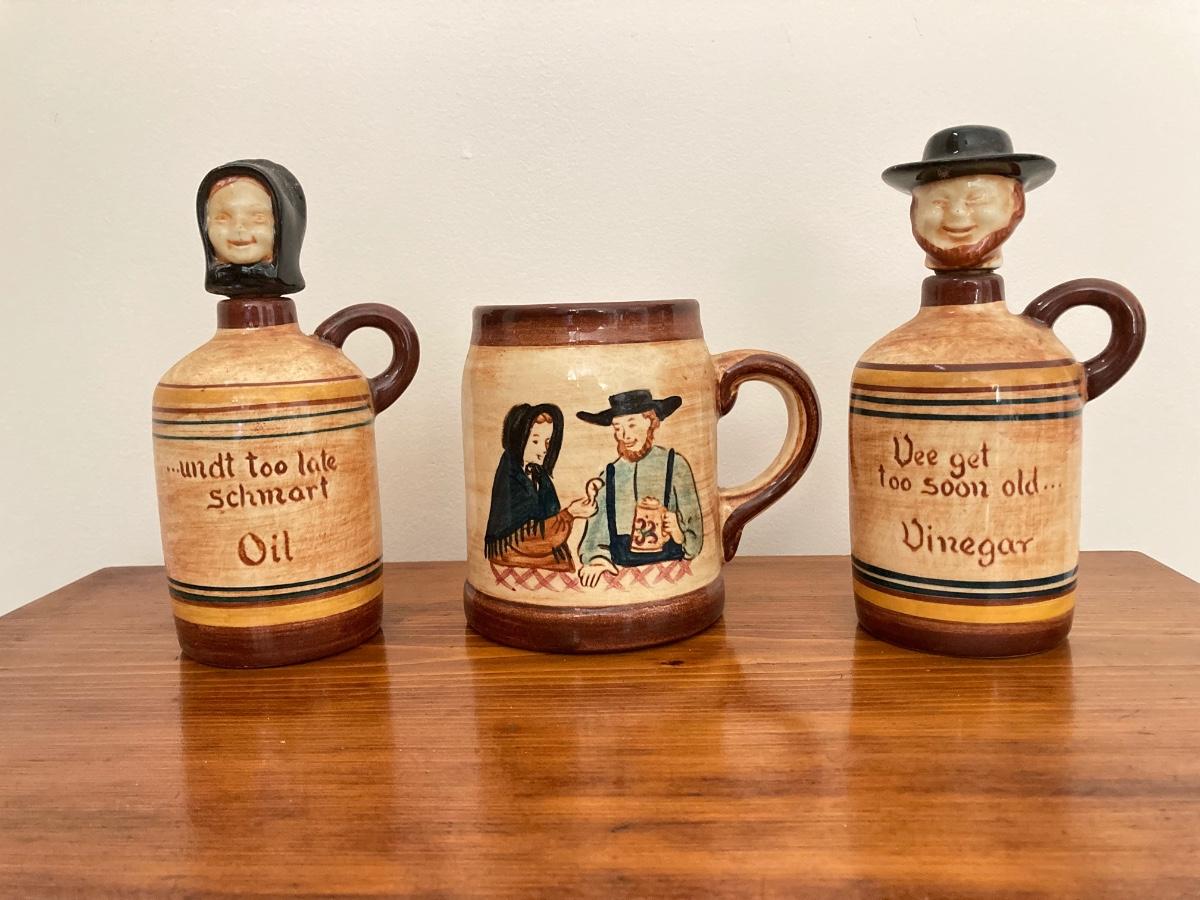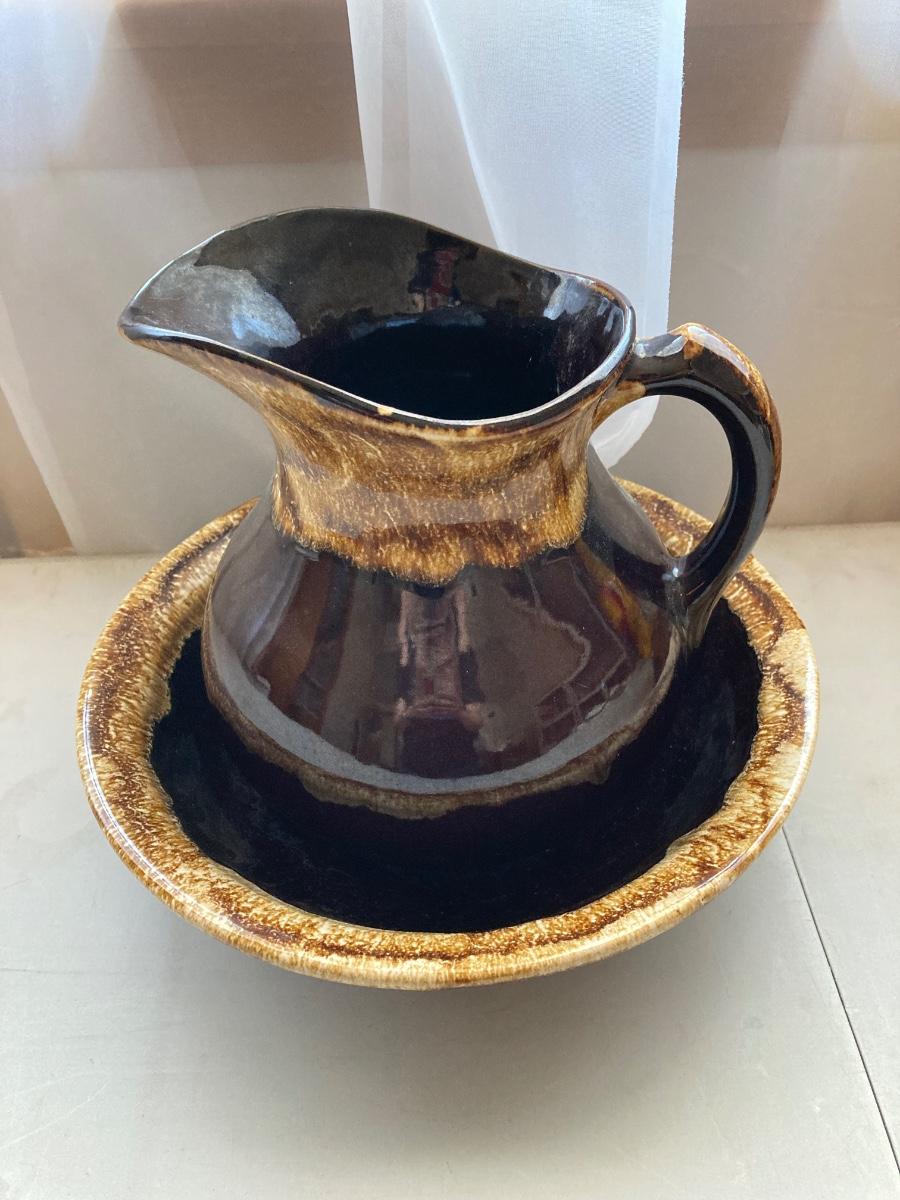 LOT 228: Vintage Roseville Bowl with Brown Drip Pitcher, Pennsbury Pottery Cruets and Mug, Cop the Cream Milk Bottle & More