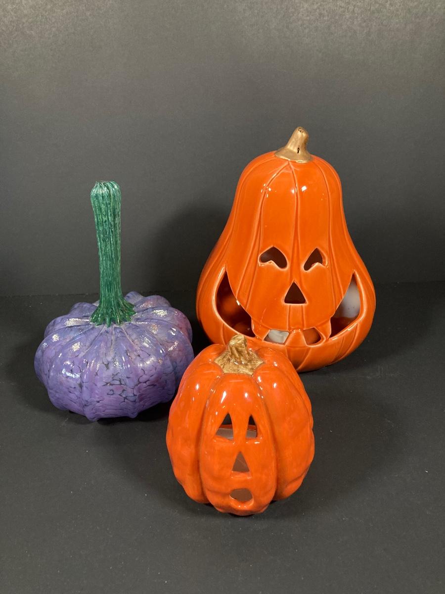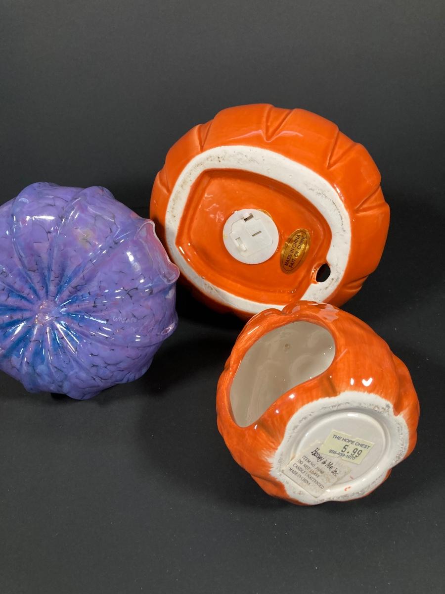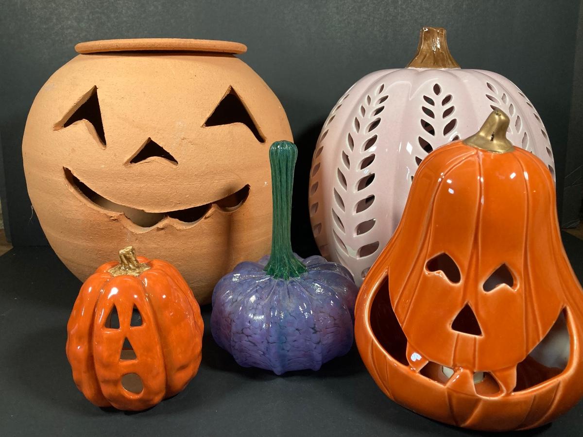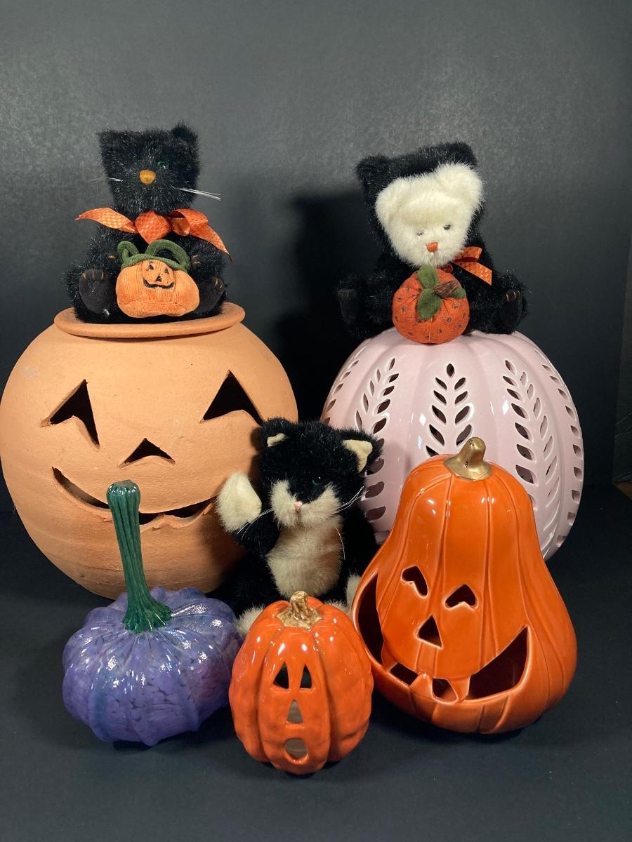 LOT 233: Wheaton Art Glass Pumpkin, Boyd's Bears Halloween Plush, Terra Cotta Jack'O'Lantern Jar & More