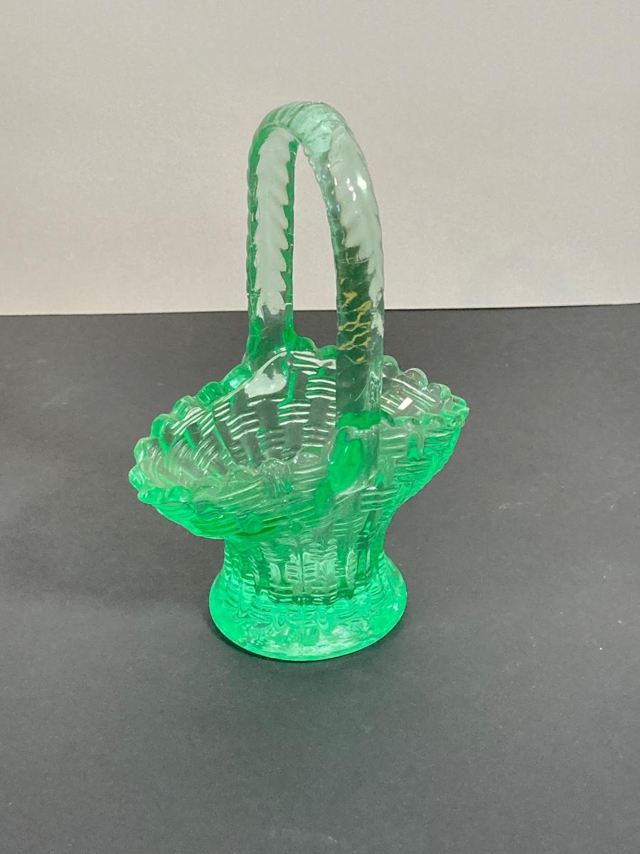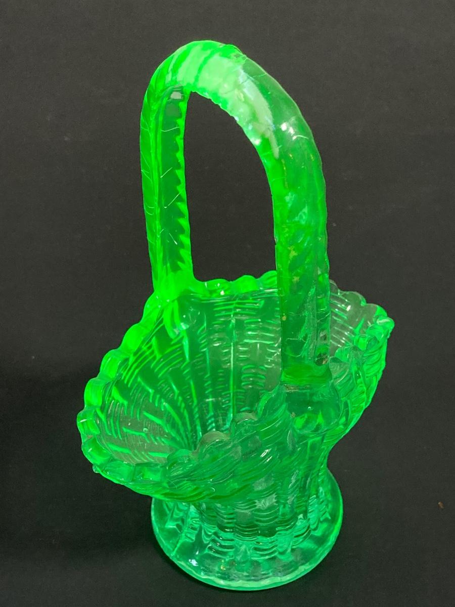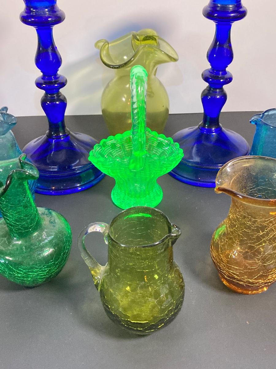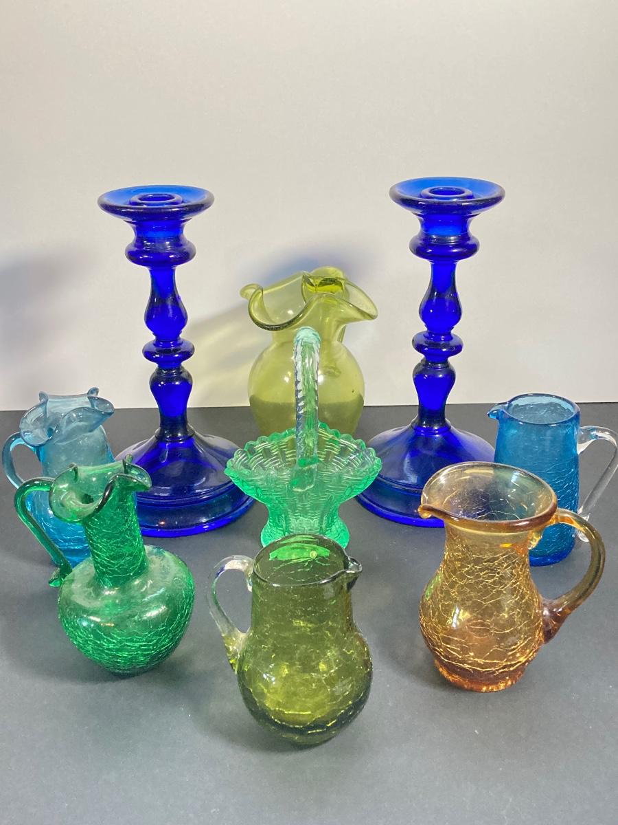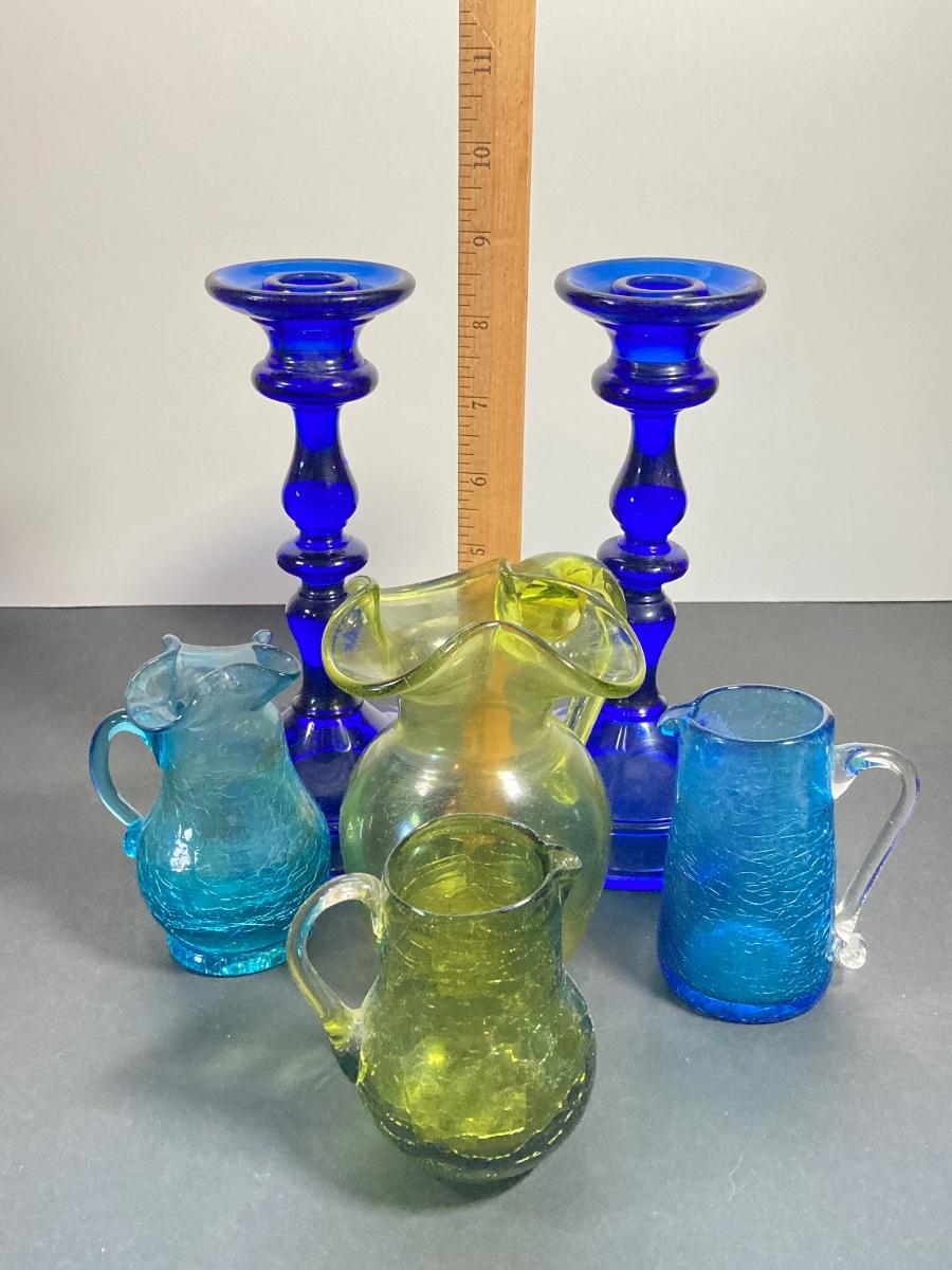 LOT 236: Uranium Glass Basket w/ Crackle Art Glass, Cobalt Blue Candlestick Holders & More