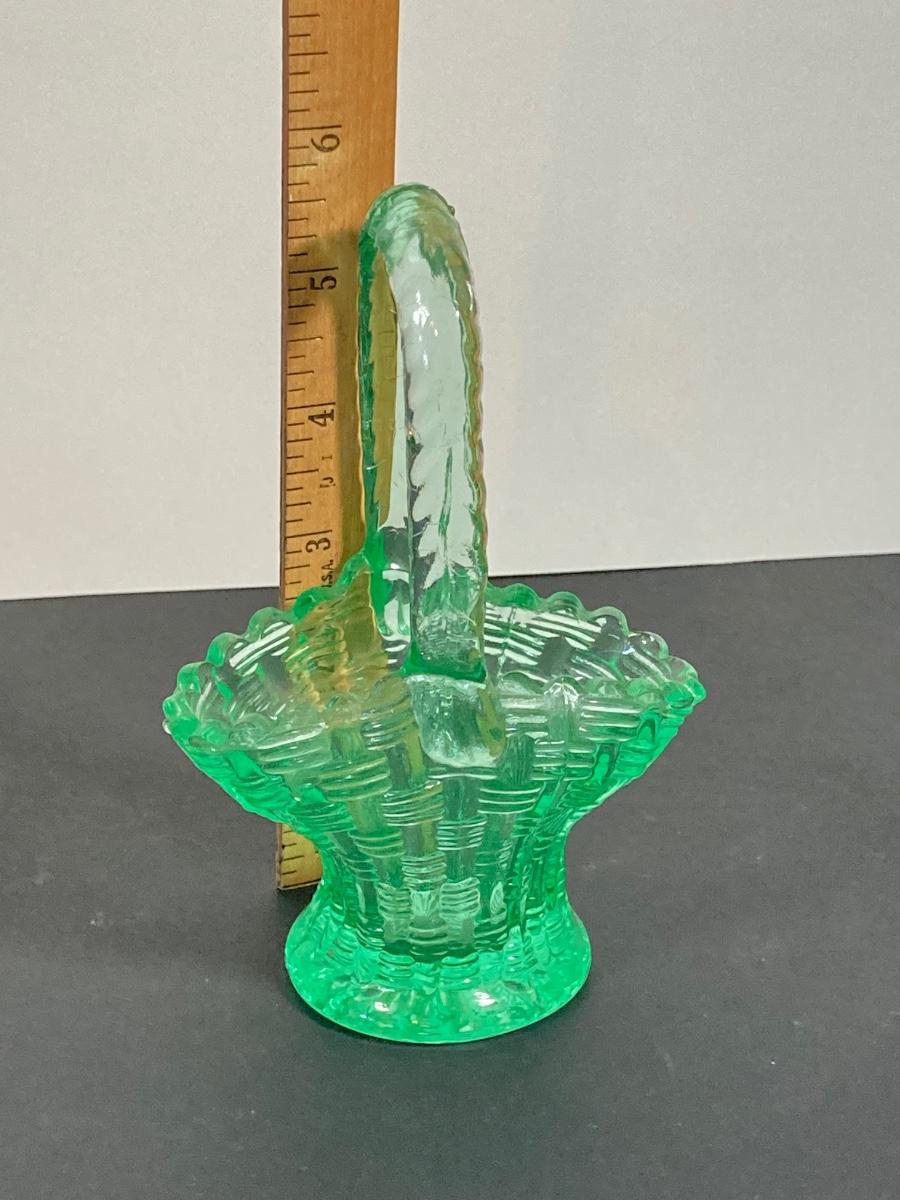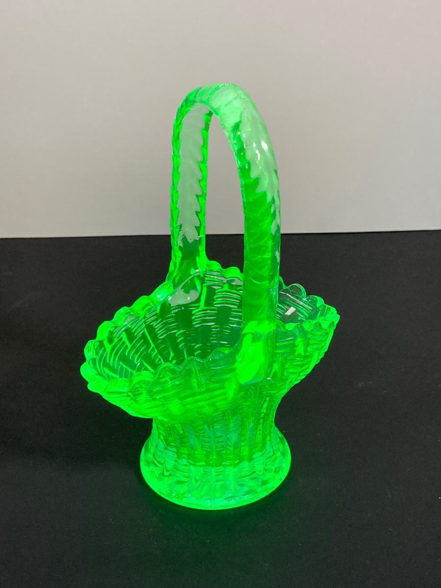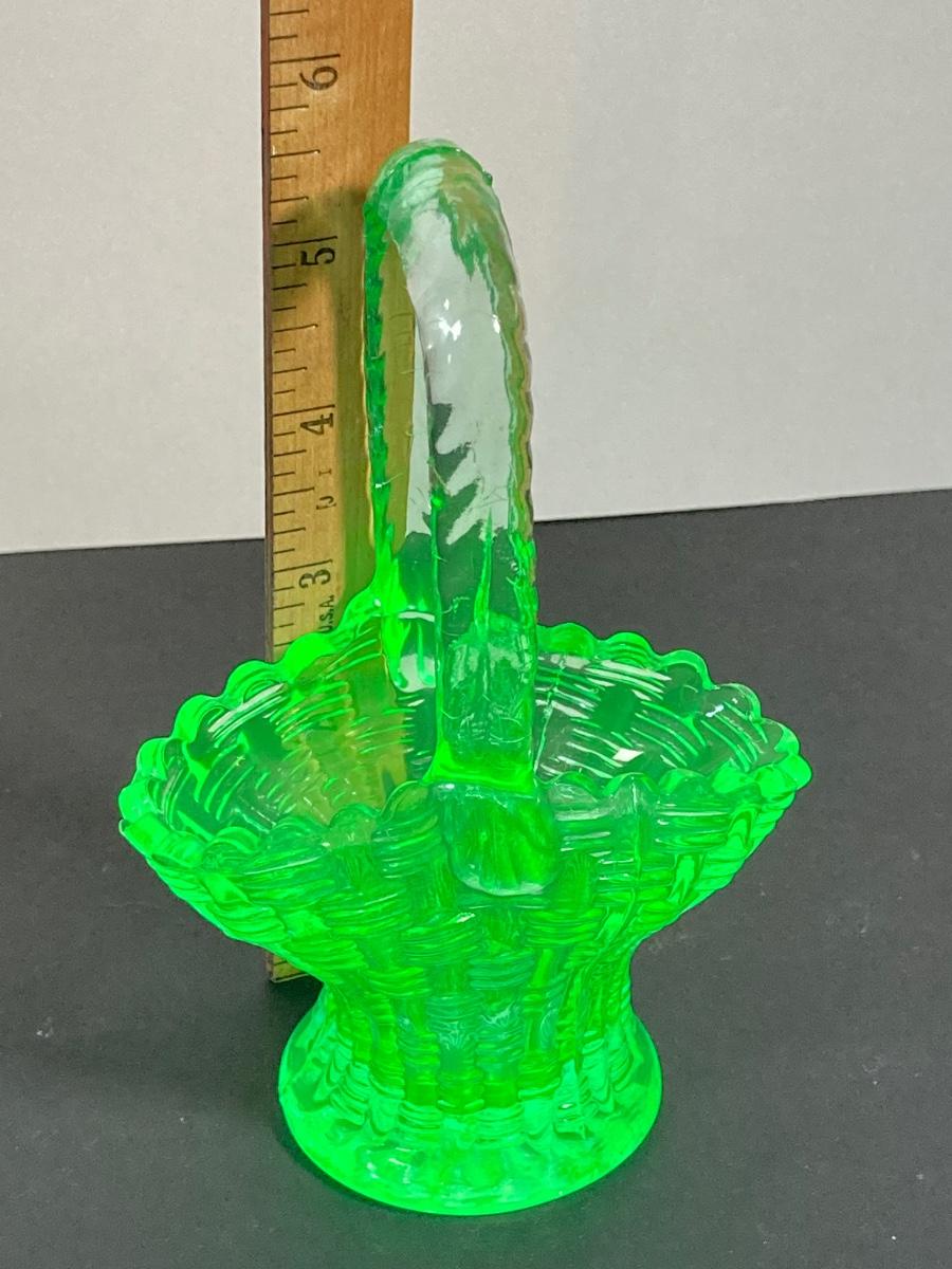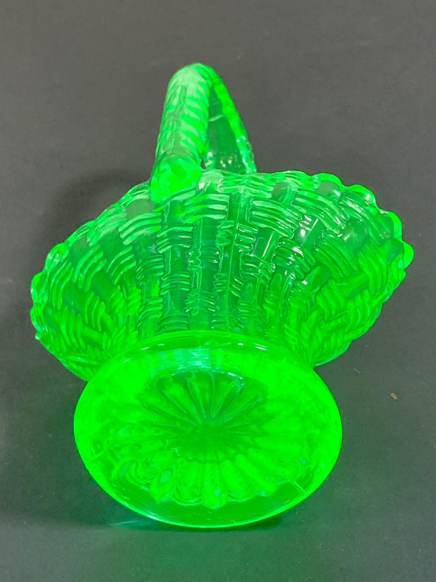 LOT 236: Uranium Glass Basket w/ Crackle Art Glass, Cobalt Blue Candlestick Holders & More