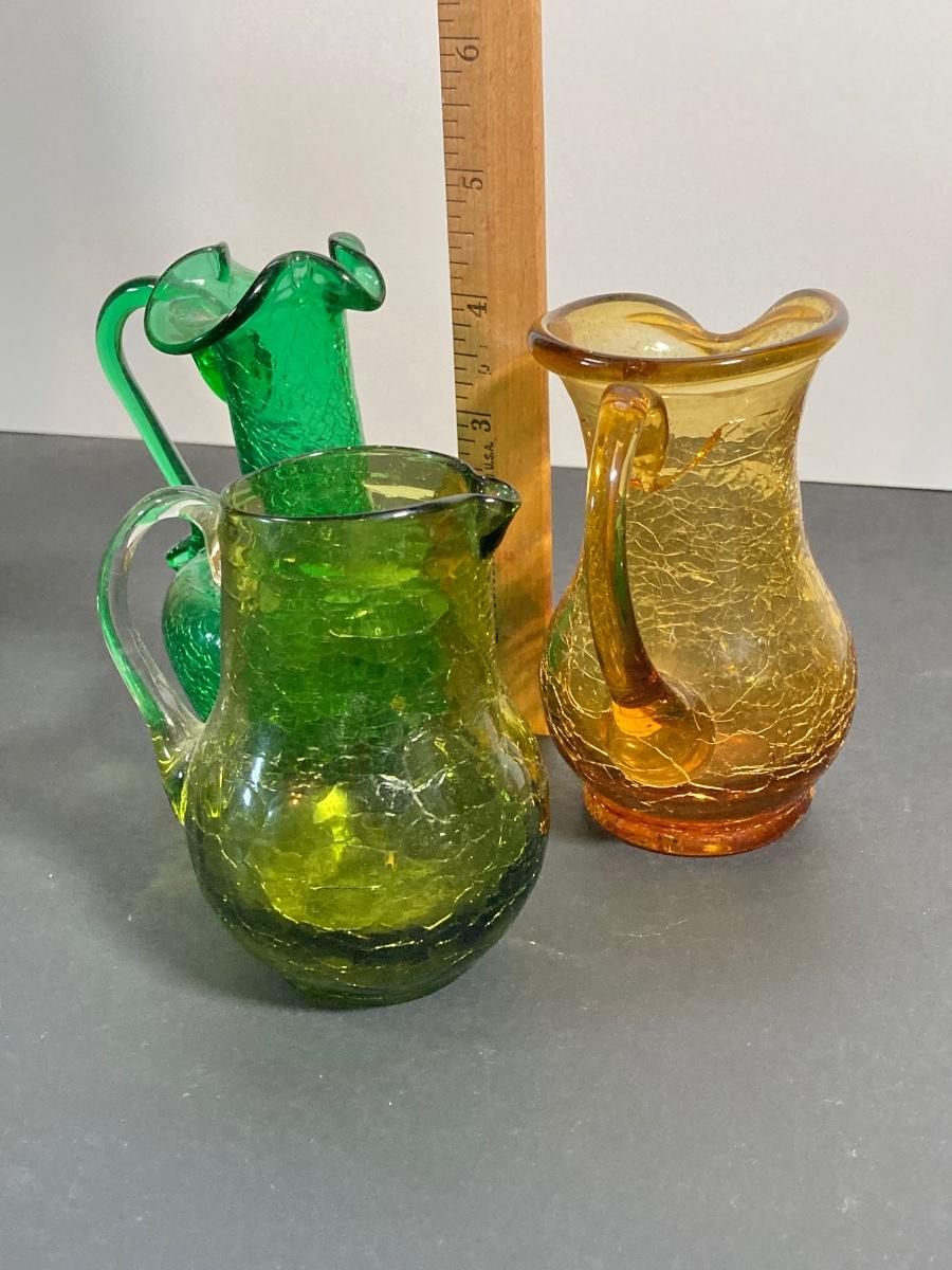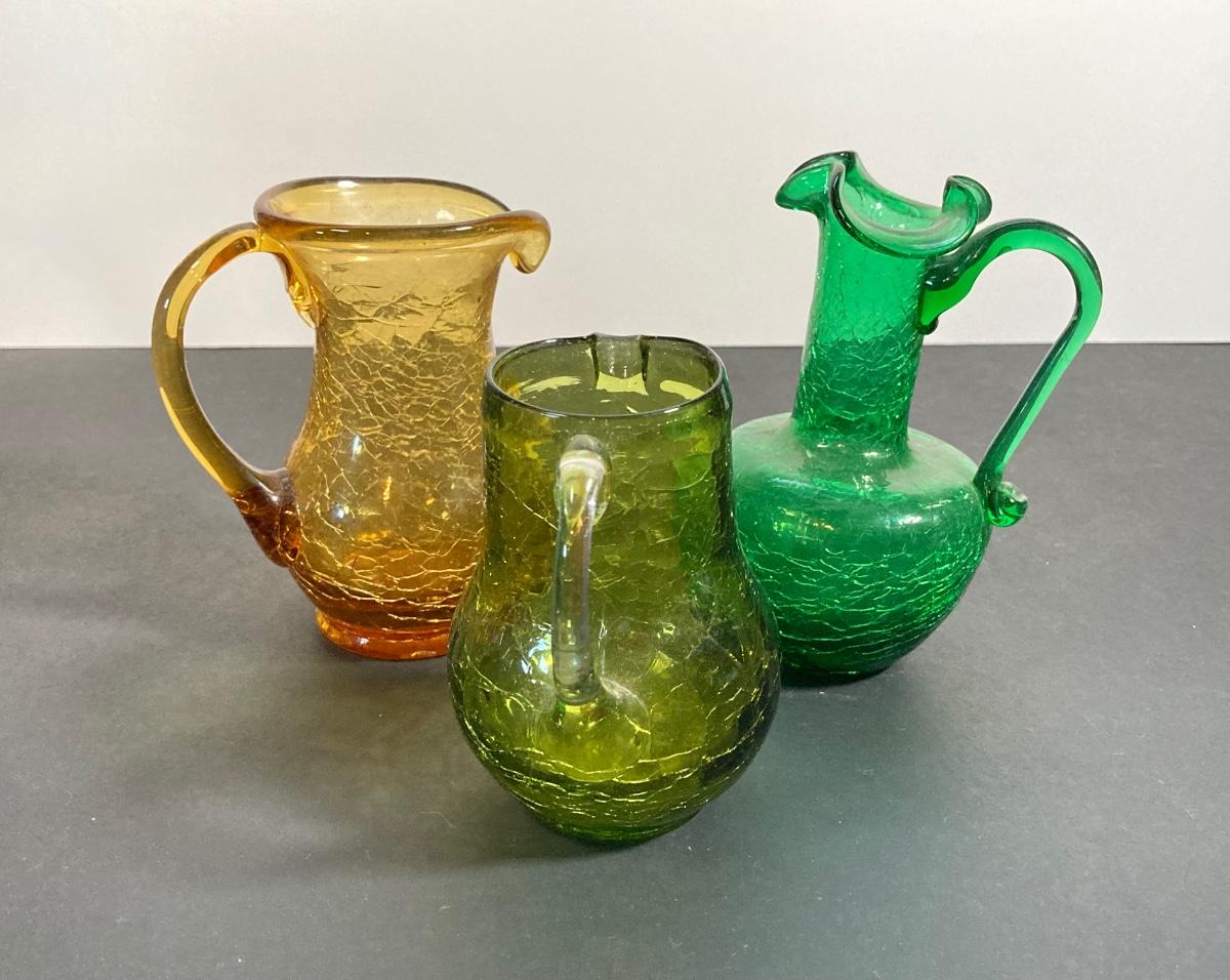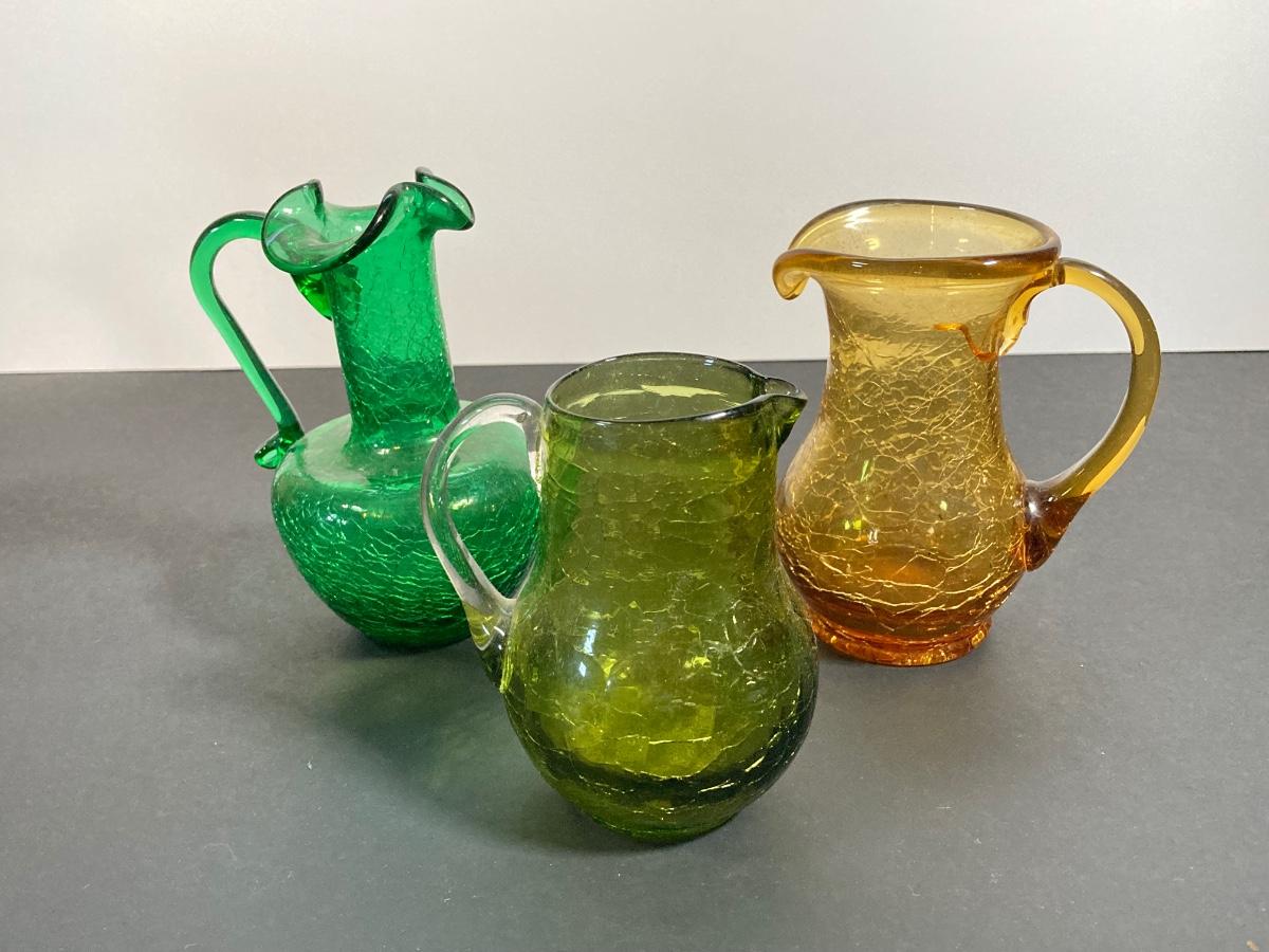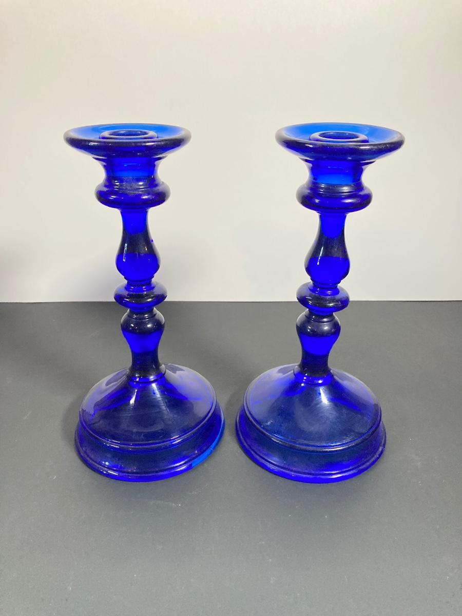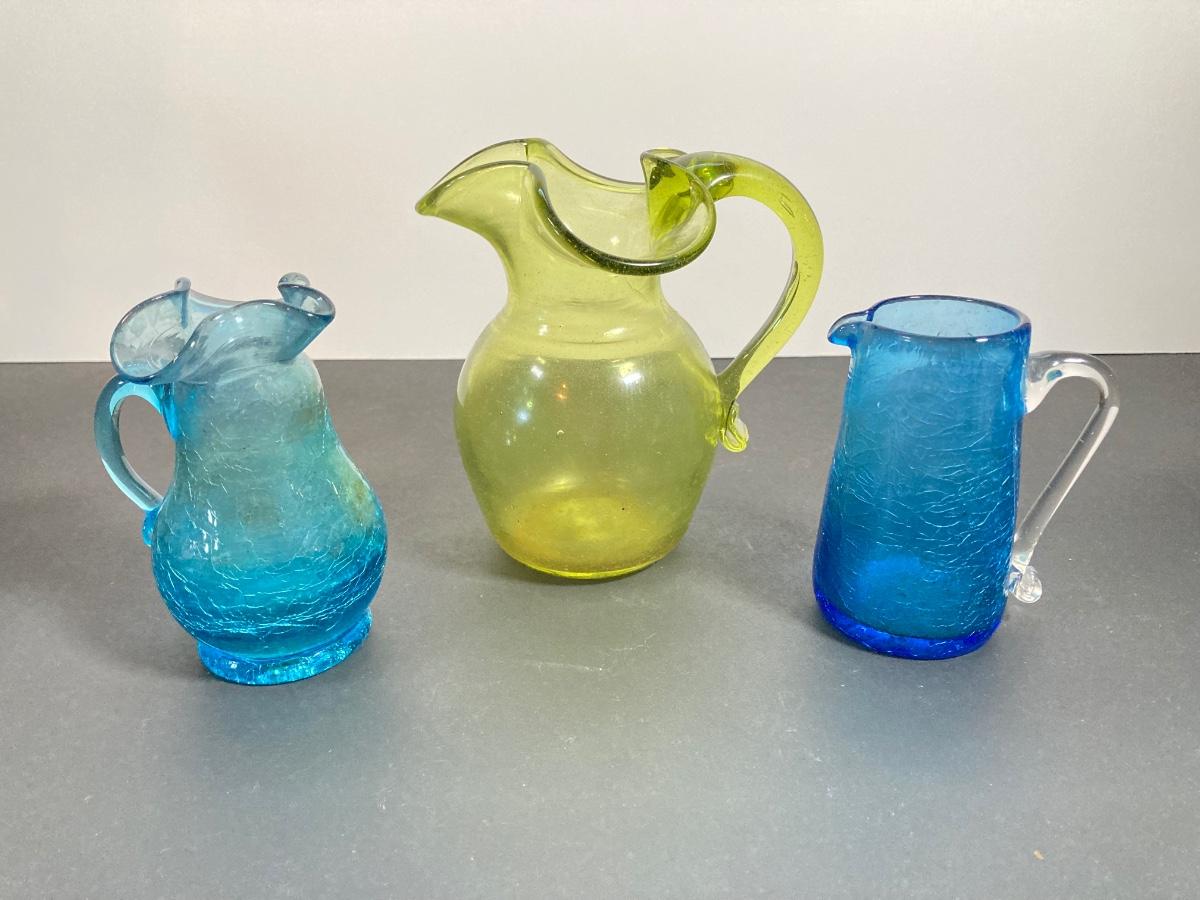 LOT 236: Uranium Glass Basket w/ Crackle Art Glass, Cobalt Blue Candlestick Holders & More