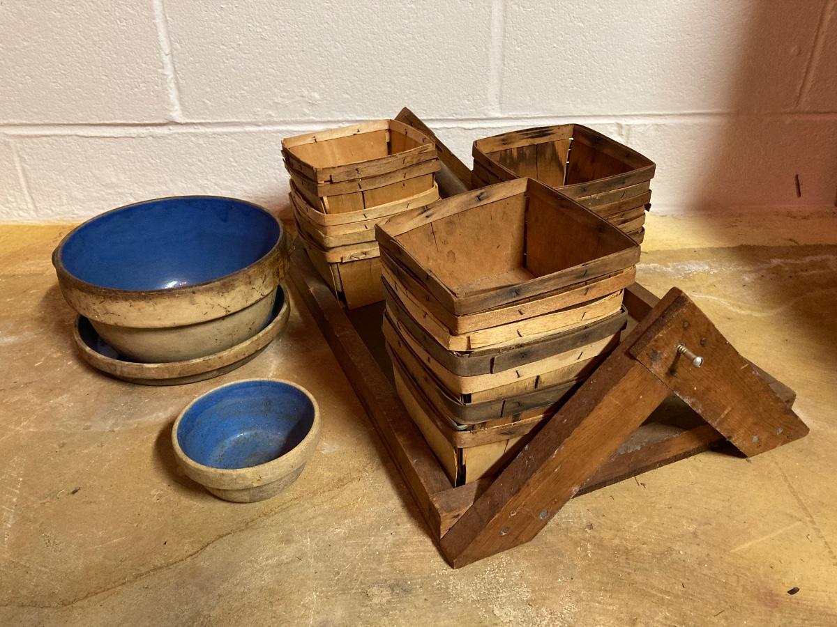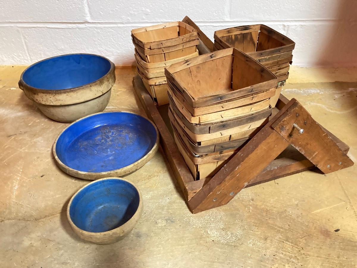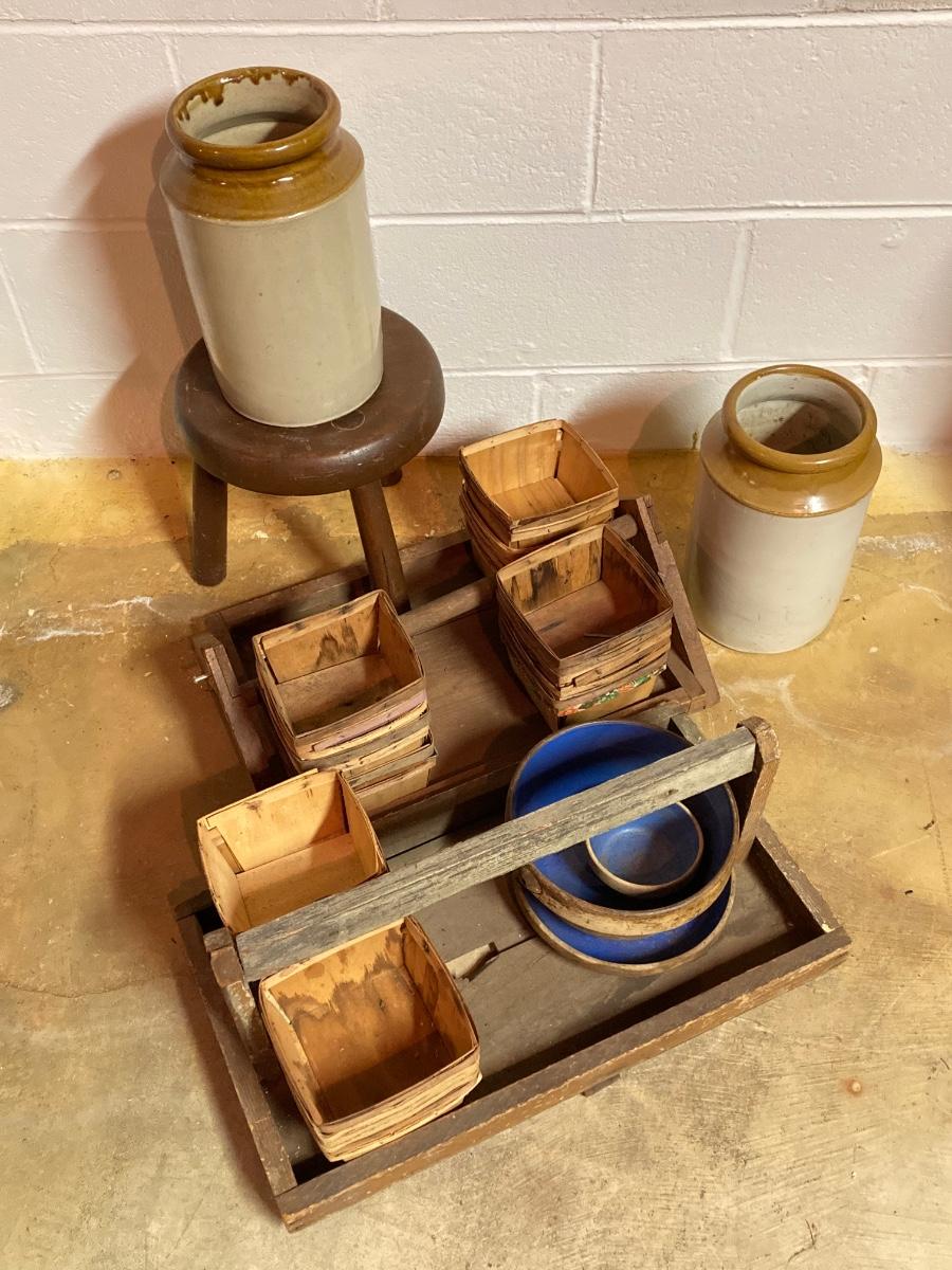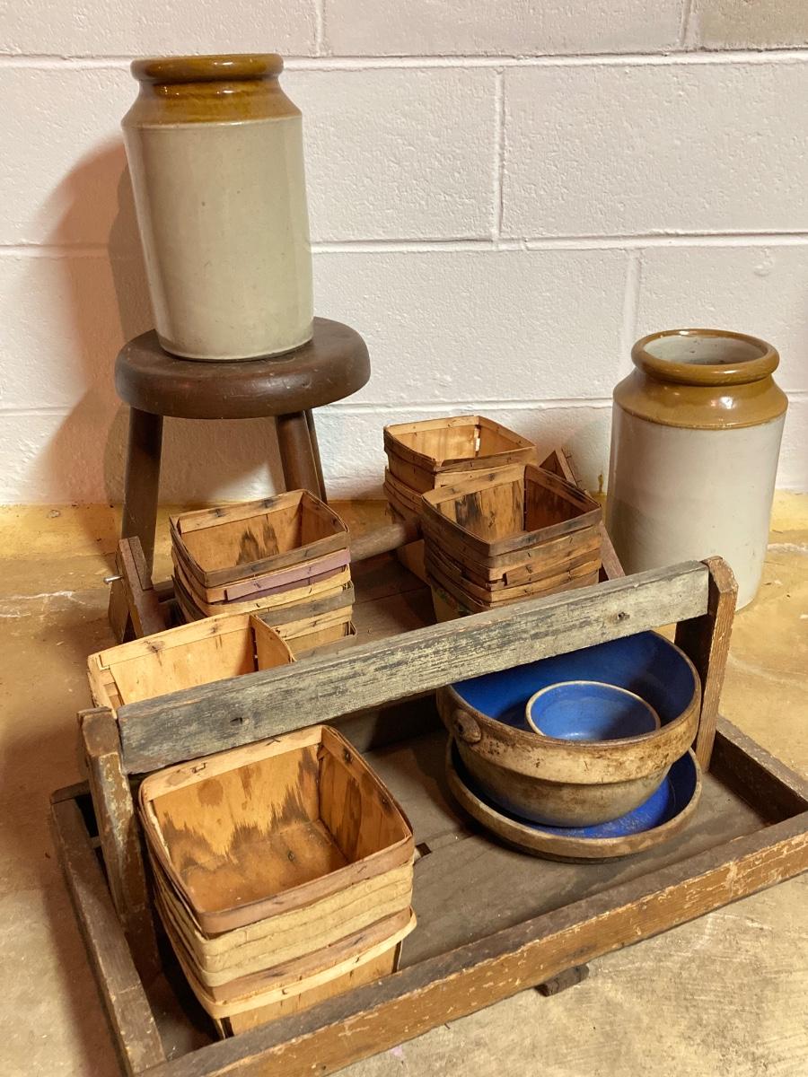 LOT 245: Vintage Farmhouse Collection - Cobalt Blue Ideal Pottery, Two Tone Stoneware, Wood Berry Crates and More