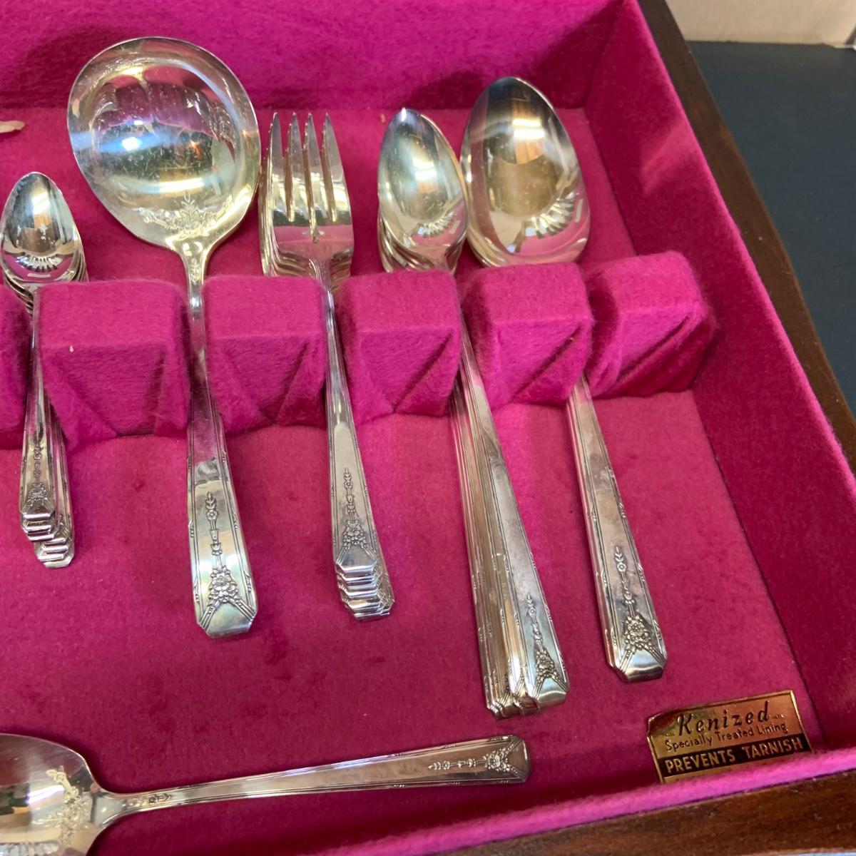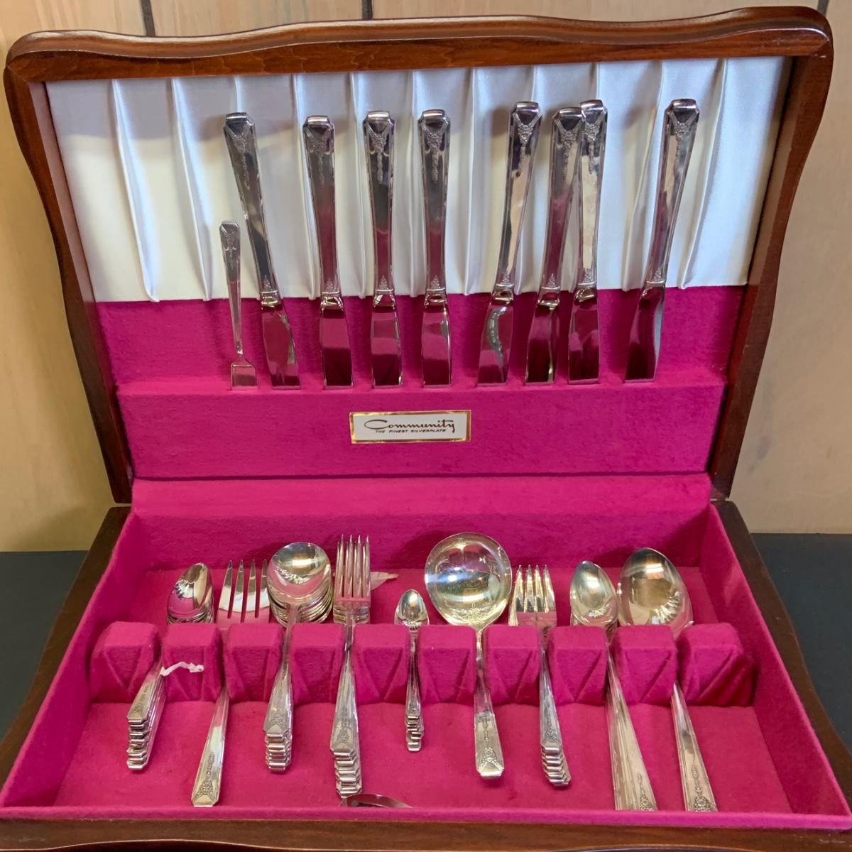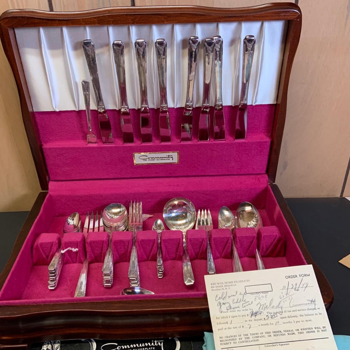 LOT272: Pristine Community Milady Silver Plated Flatware Set in Wooden Storage Box with Receipt from 1949 and Outer Box