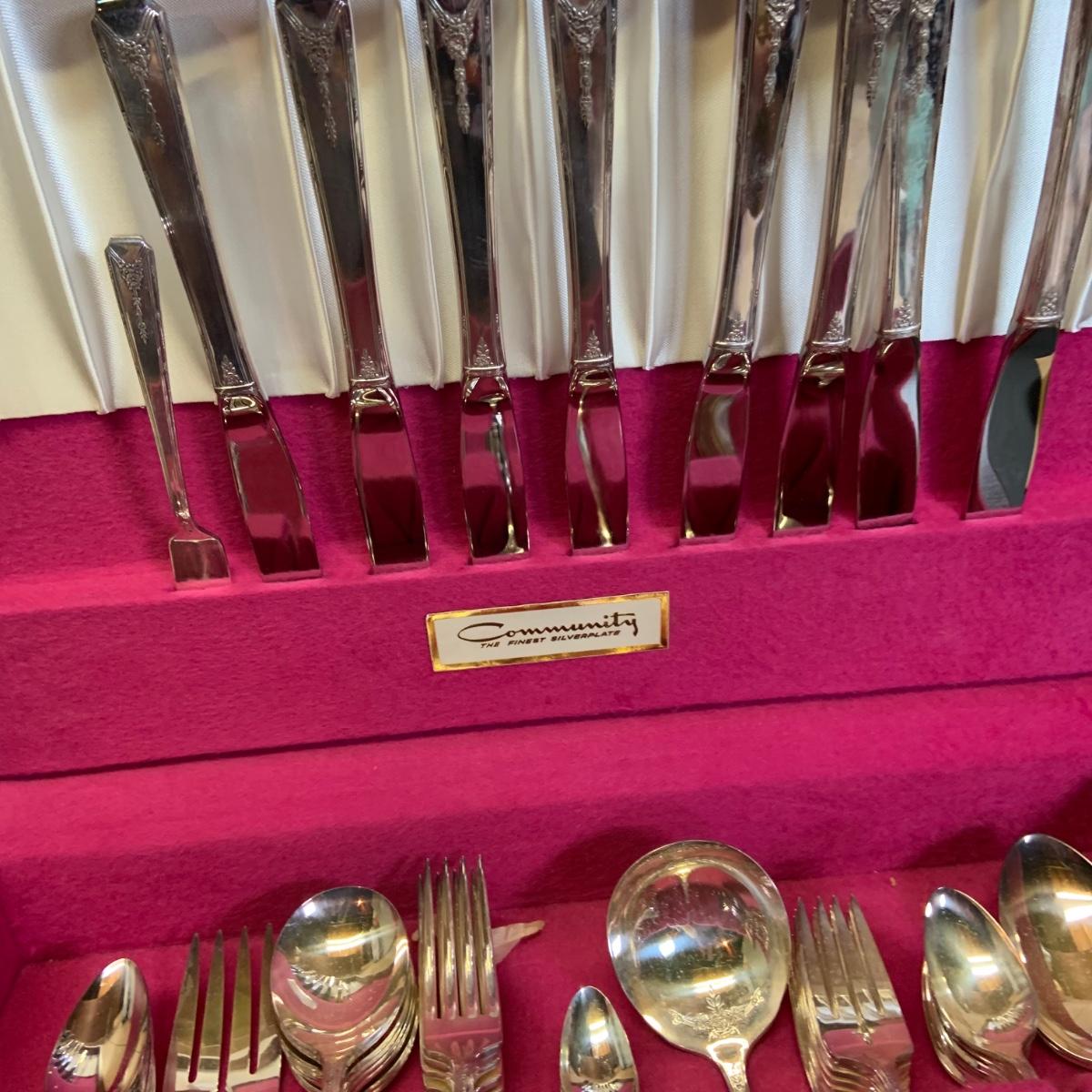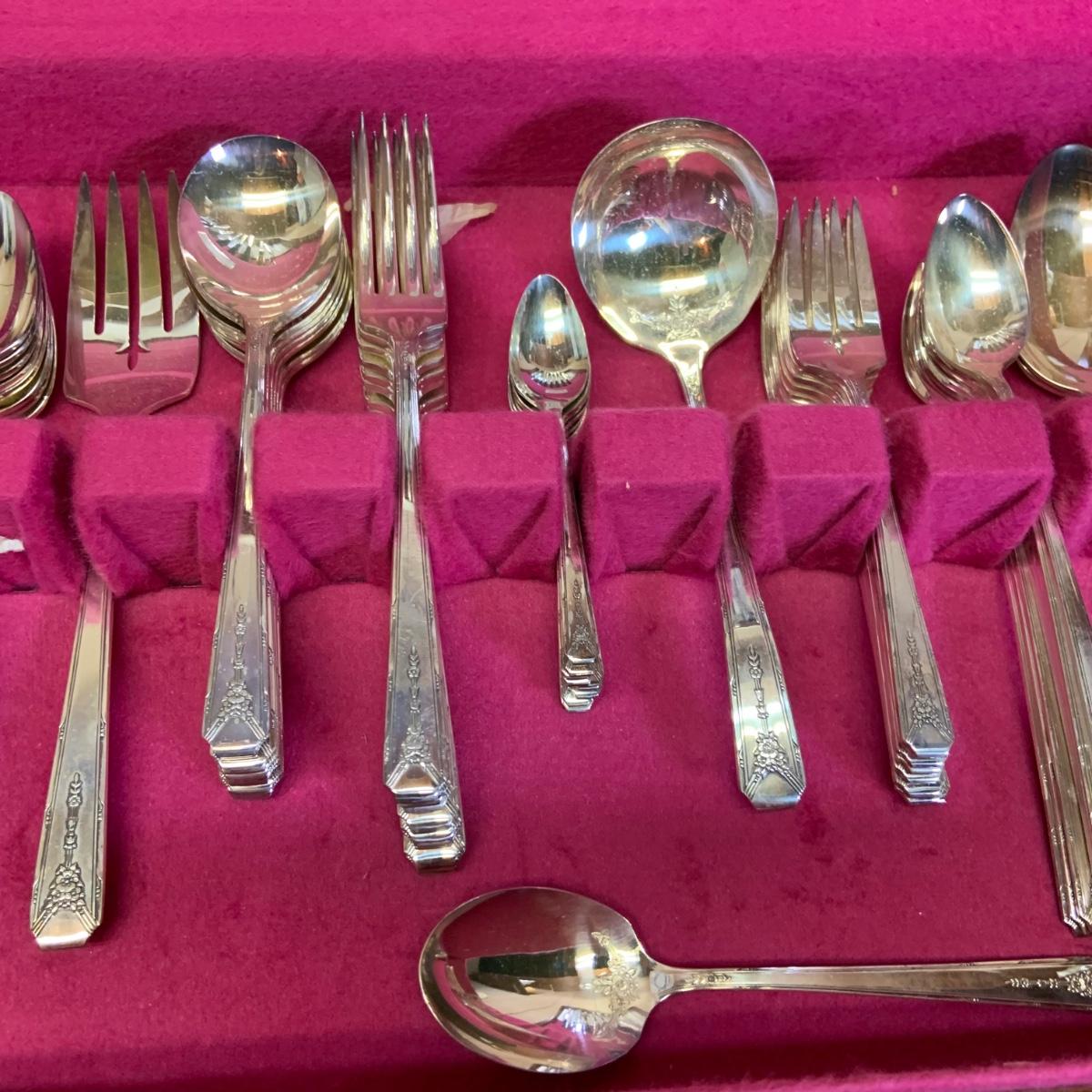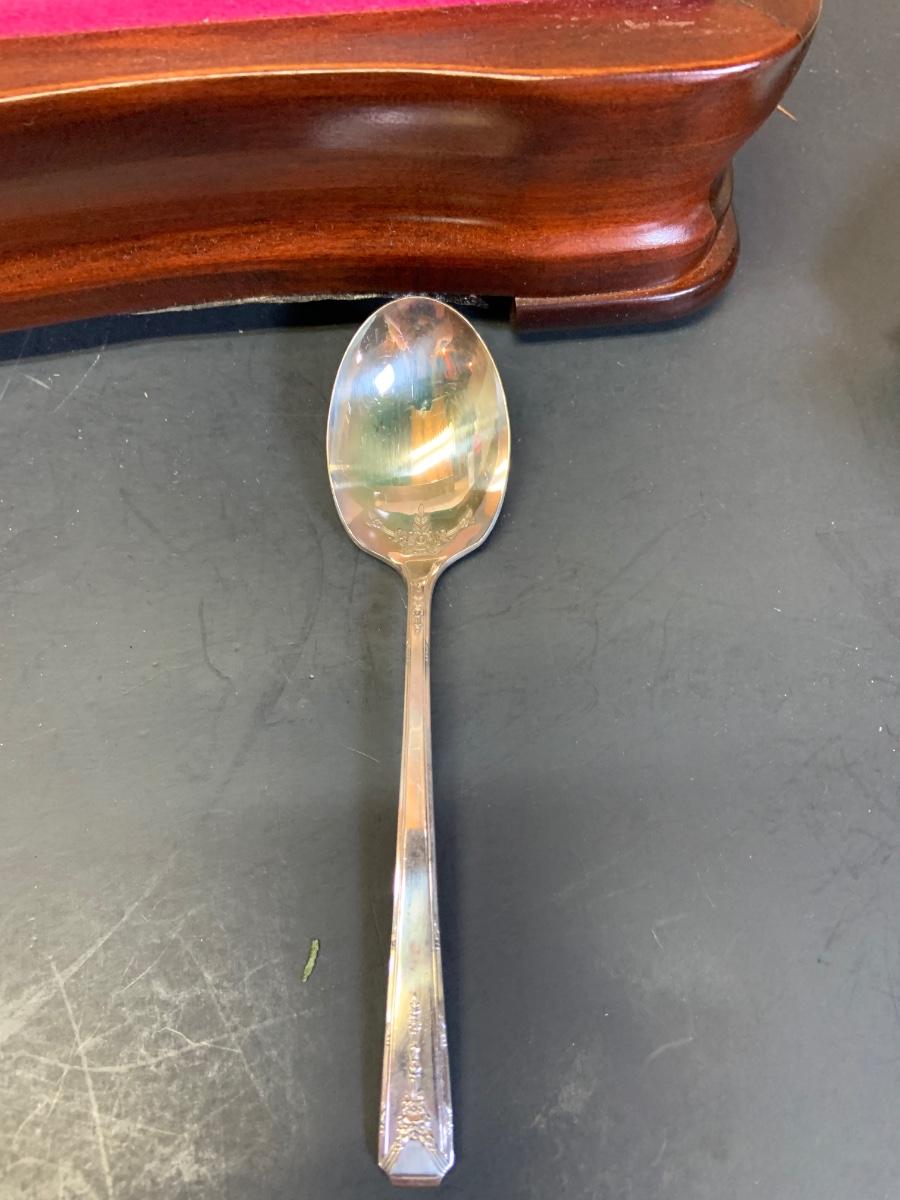 LOT272: Pristine Community Milady Silver Plated Flatware Set in Wooden Storage Box with Receipt from 1949 and Outer Box