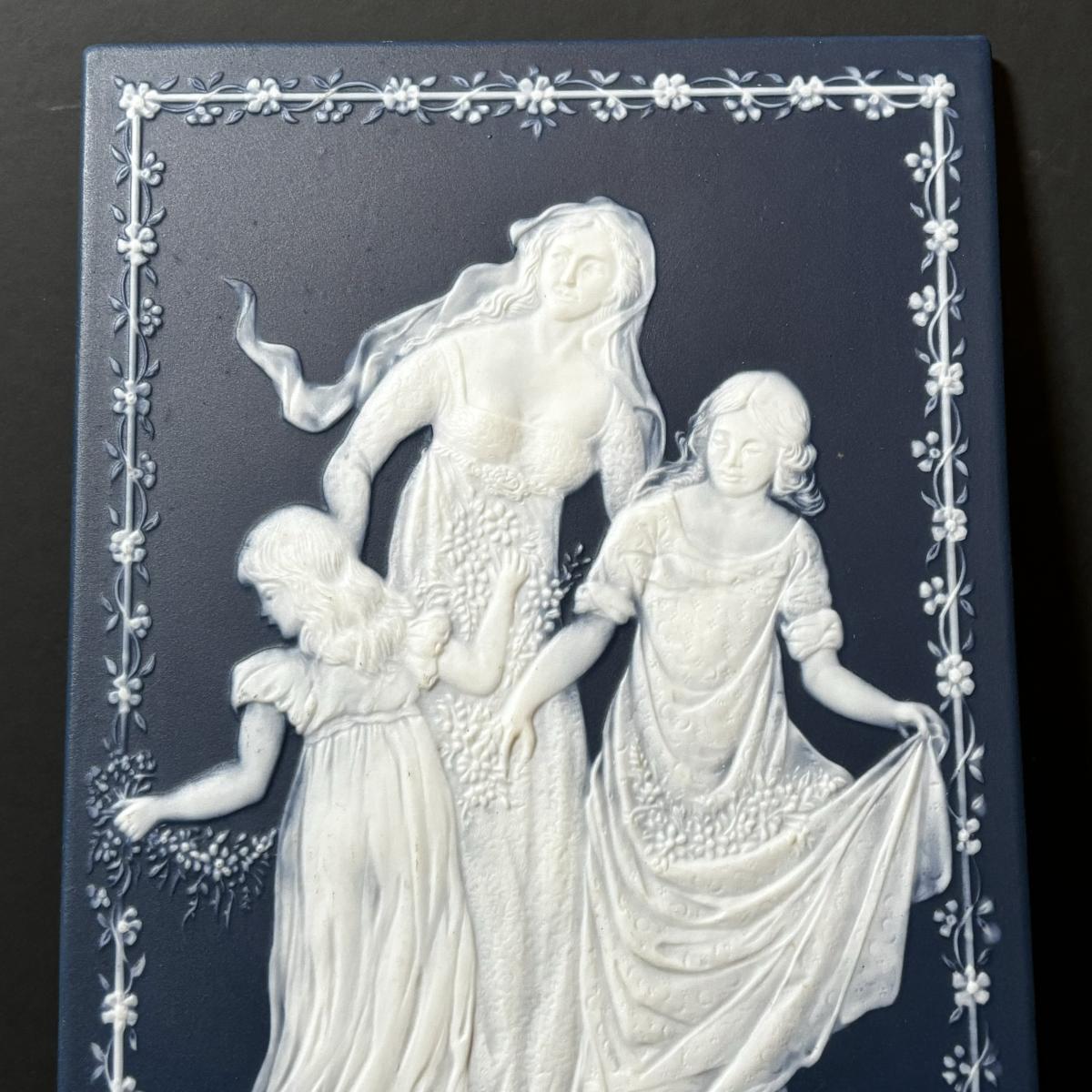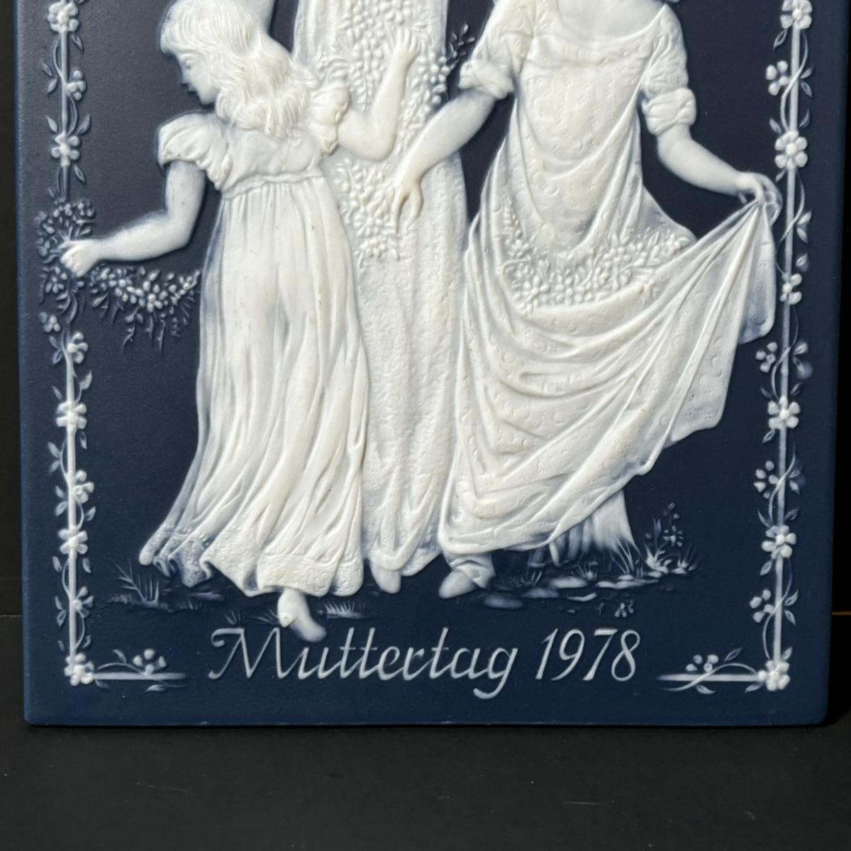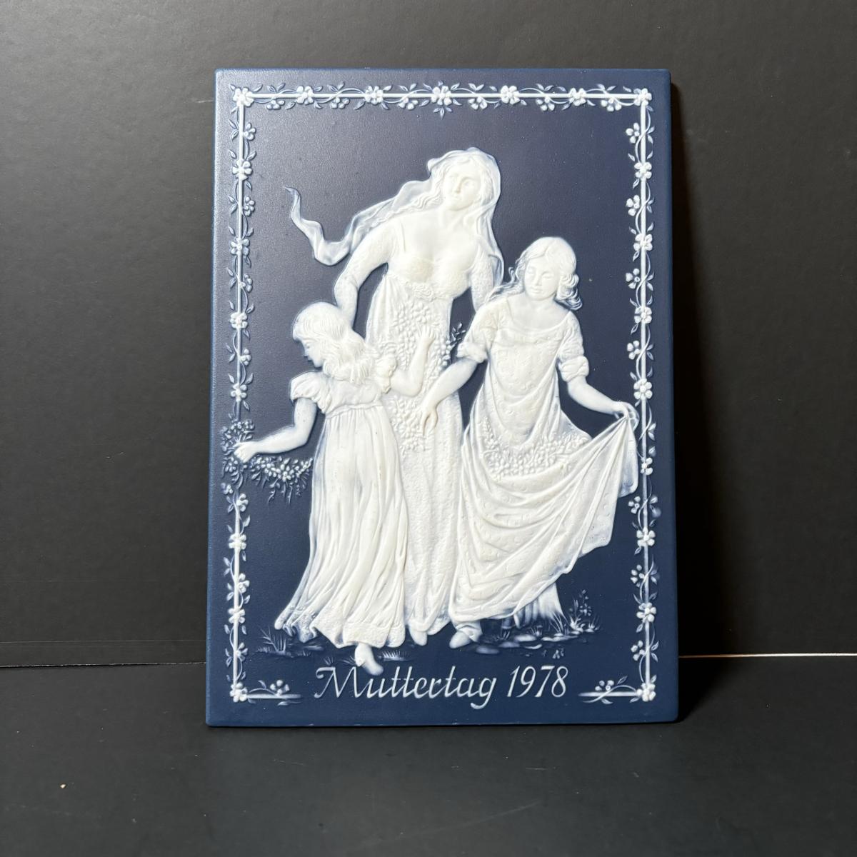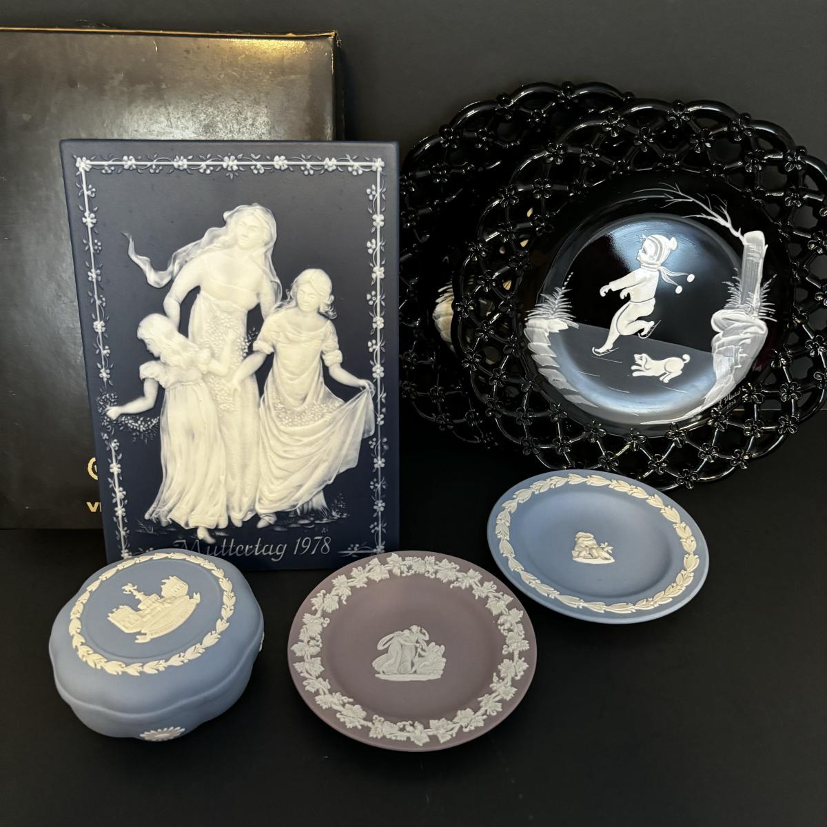 LOT 282: Westmoreland Mary Gregory Painted Skating Boy & Girl Black Glass Plates, Villeroy & Boch Mettlach Germany Wall Plaque Muttertag 1978w/Original Box, Wedgewood Trinket Box & Plaques