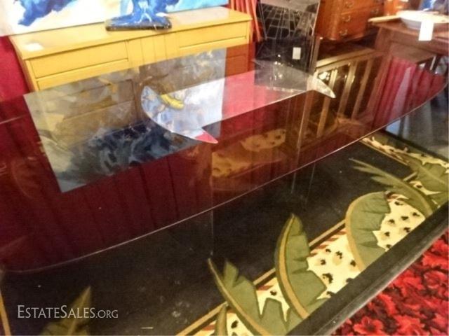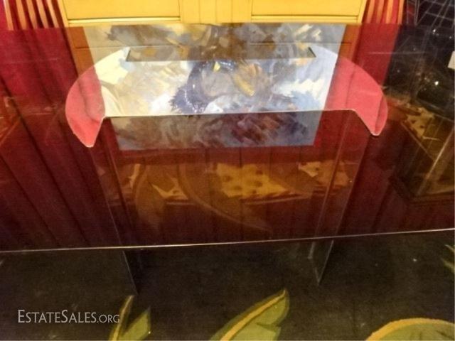 LOT 104C: 1970's MID CENTURY STEEL DINING TABLE, SMOKE GLASS TOP WITH FORMED STEEL INSET THAT FITS INTO BASE, 94"W X 49"D X 28.5"H, SKU3367.02