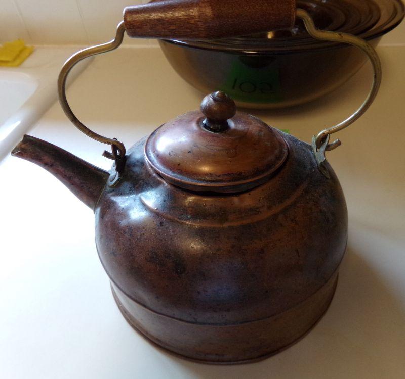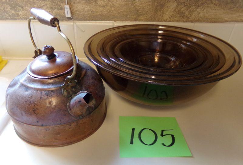 LOT 105  COPPER TEA KETTLE & NESTING GLASS BOWLS