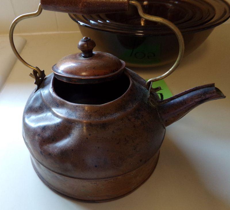 LOT 105 COPPER TEA KETTLE & NESTING GLASS BOWLS