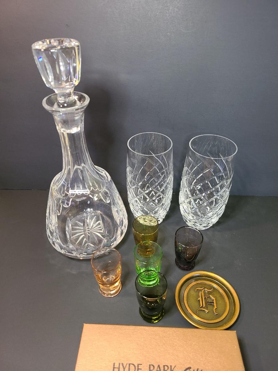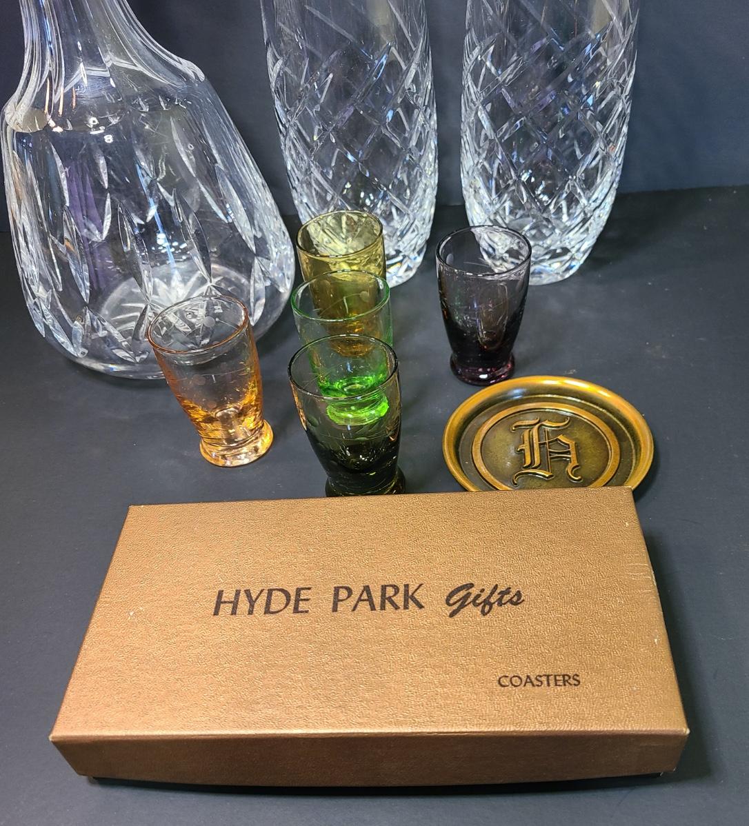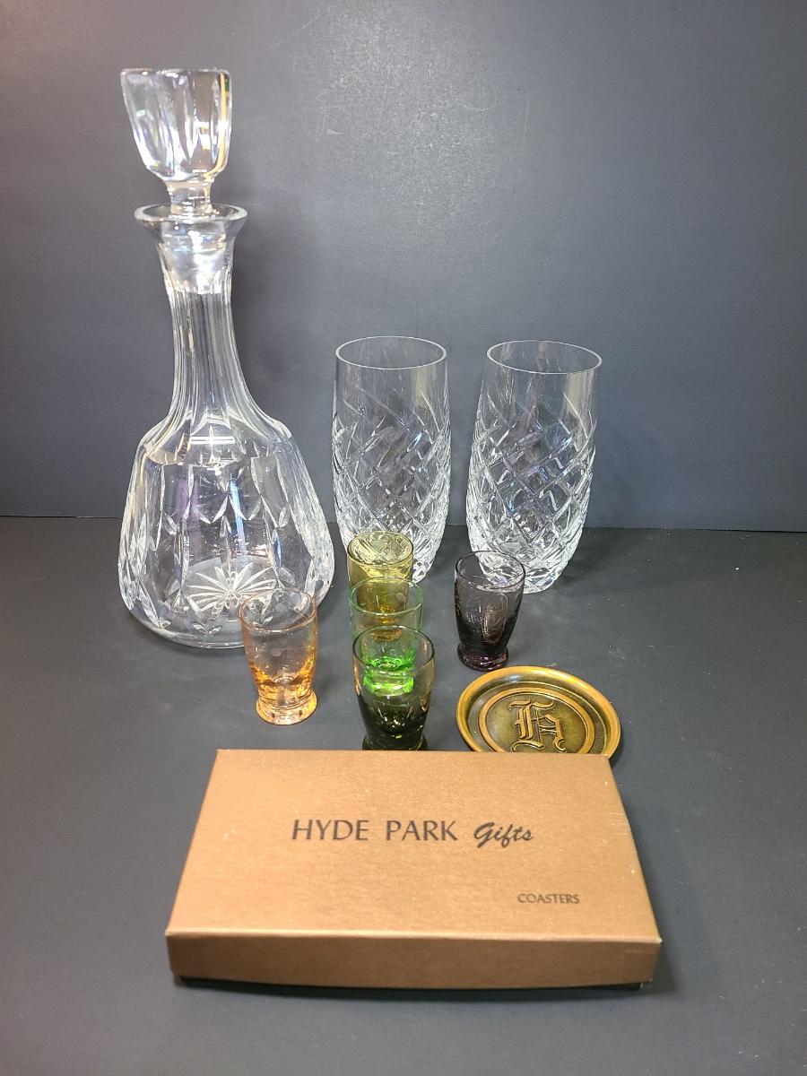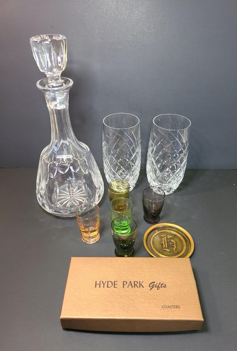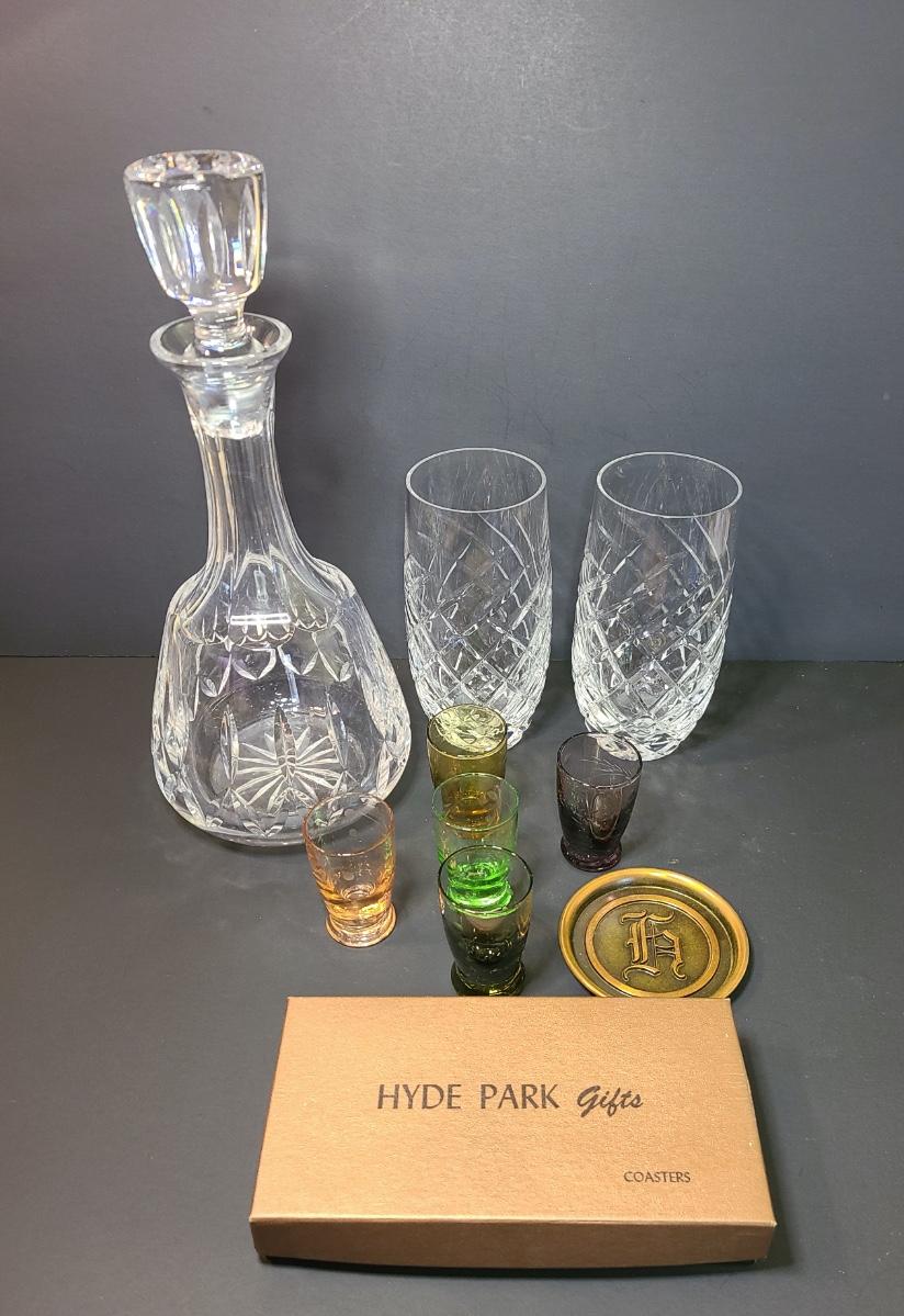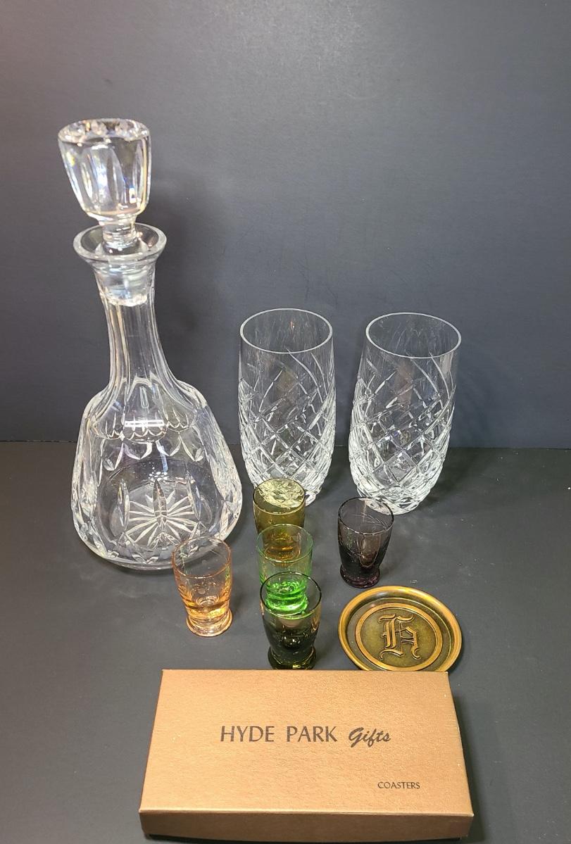 Lot 105S: Vintage Decanter, Wedgwood Drambuie Glasses, Hyde Park Coasters, and Napco Cordials.