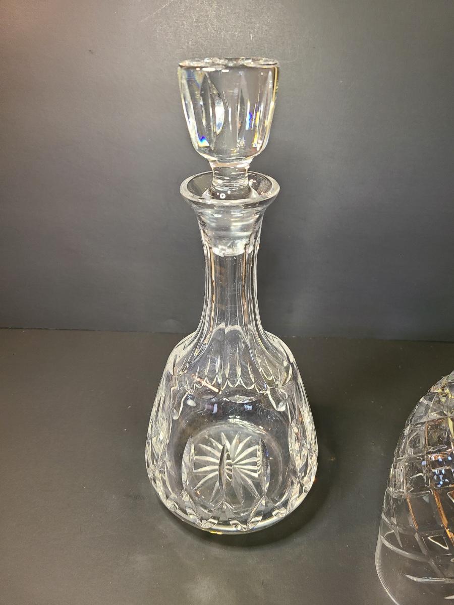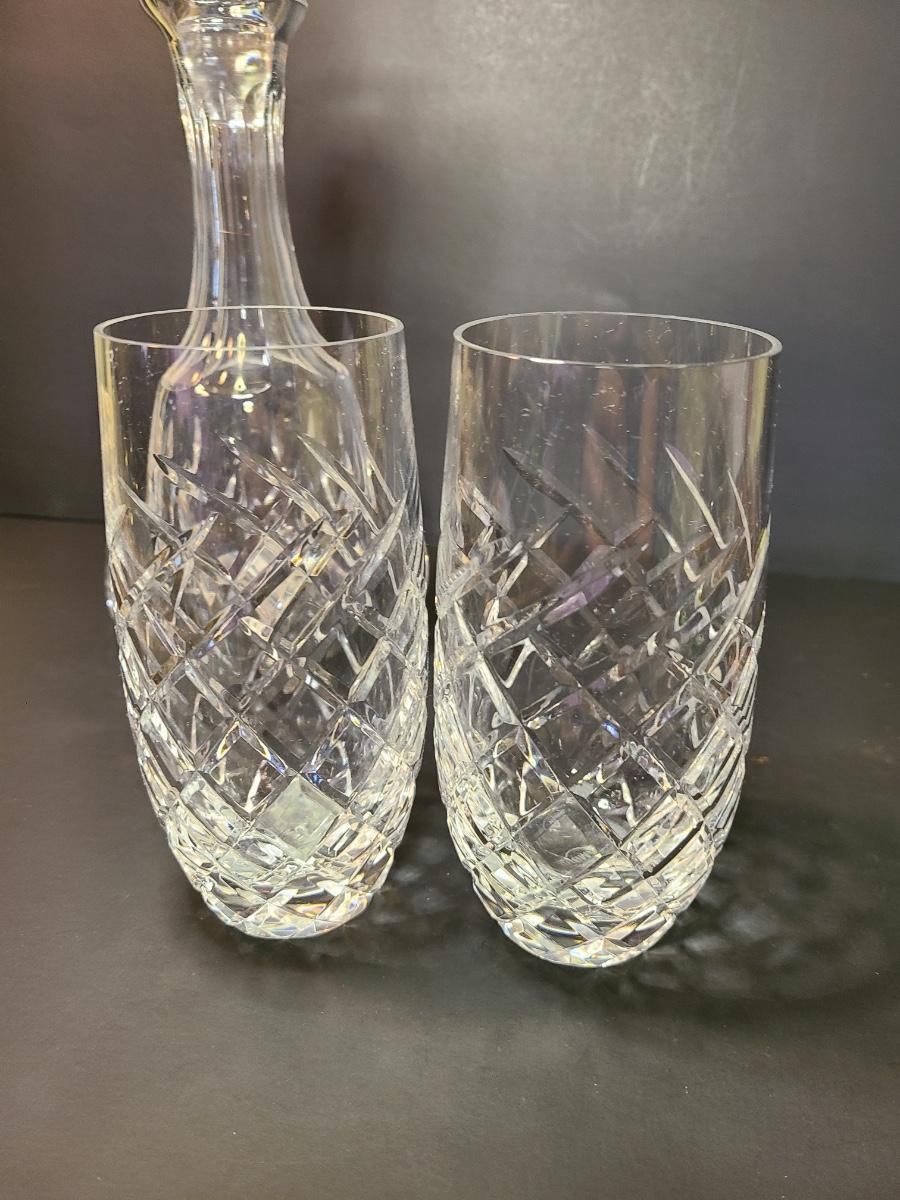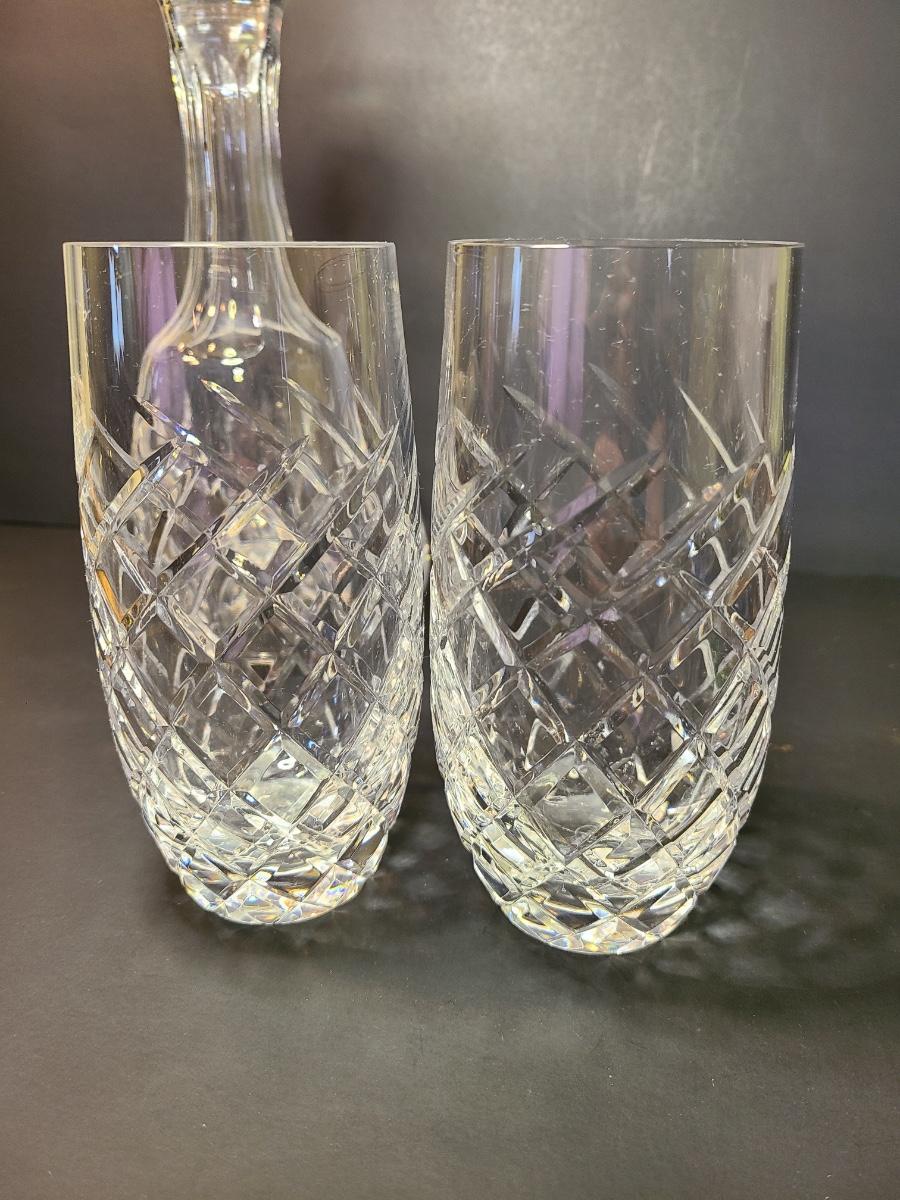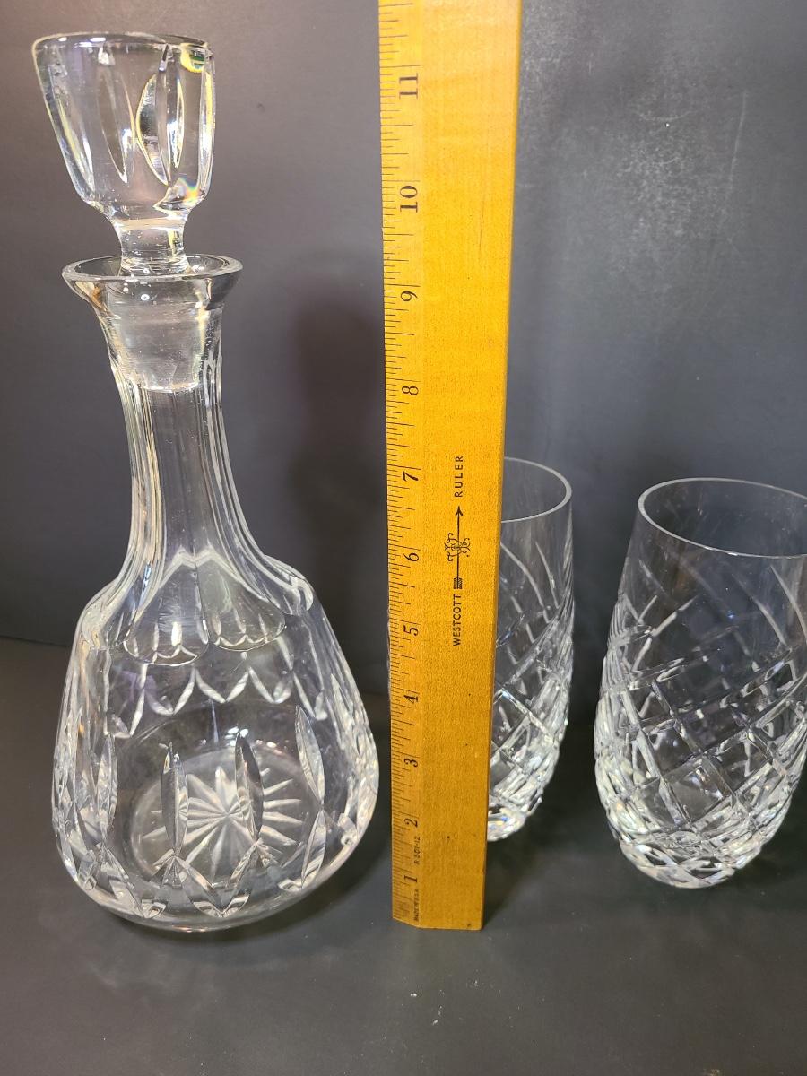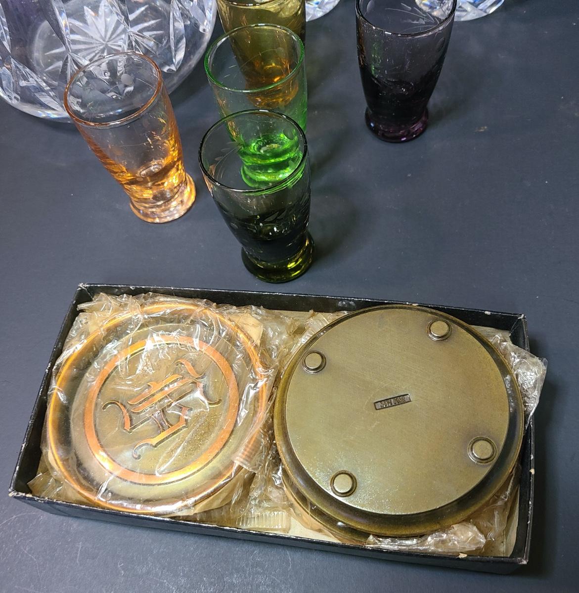 Lot 105S: Vintage Decanter, Wedgwood Drambuie Glasses, Hyde Park Coasters, and Napco Cordials.