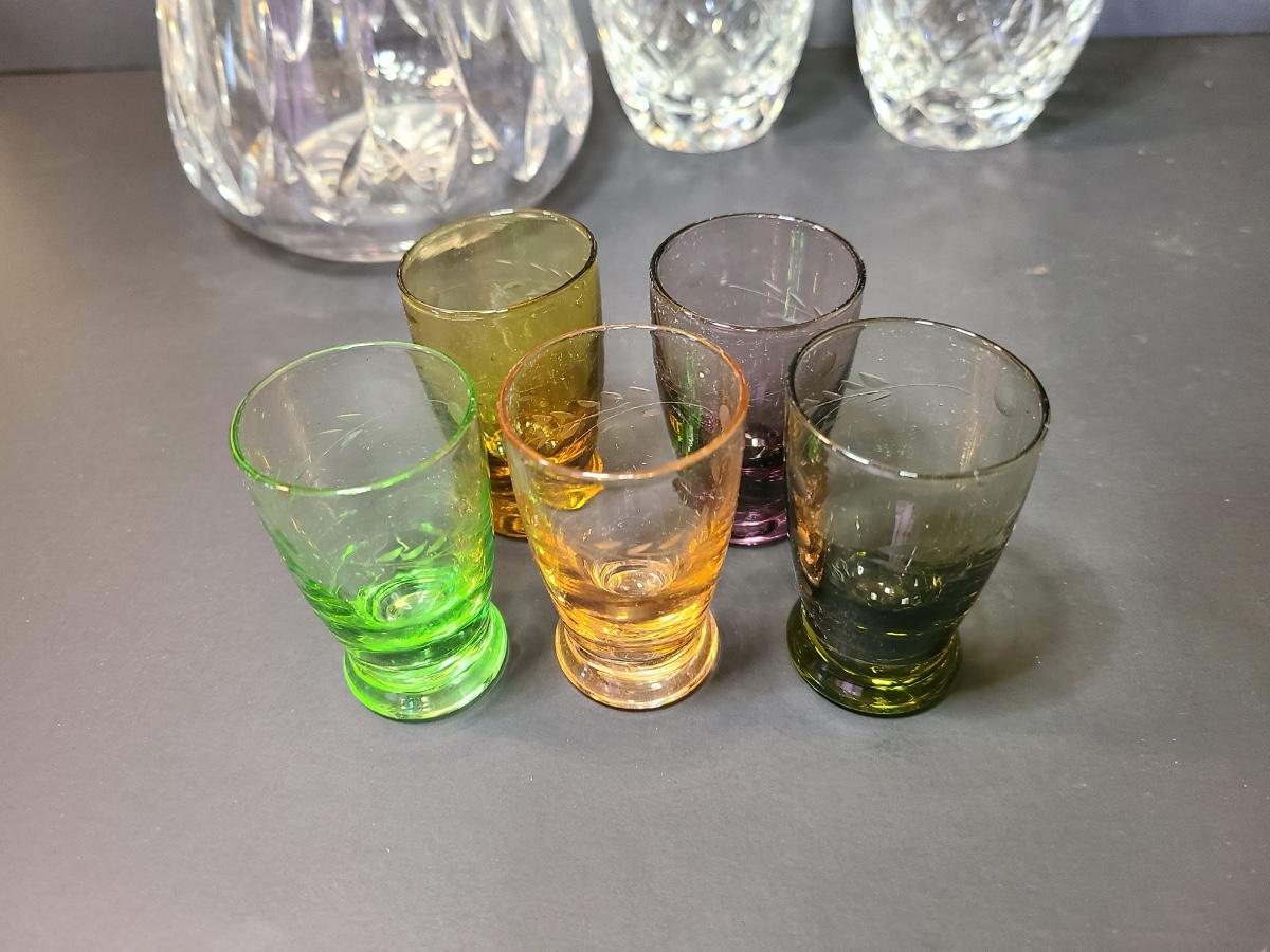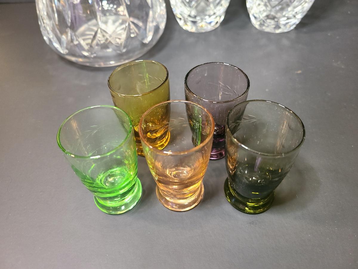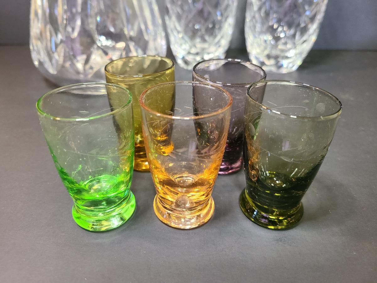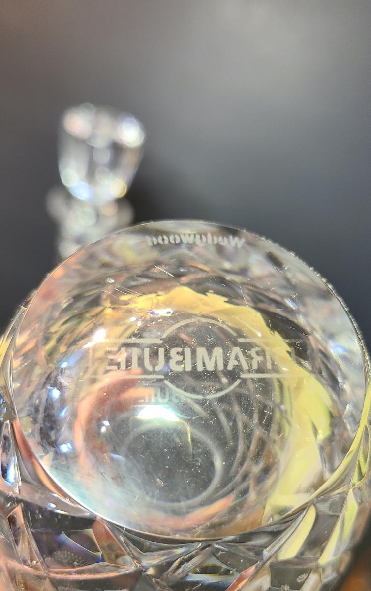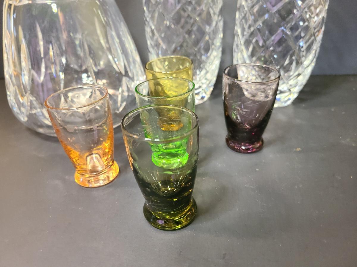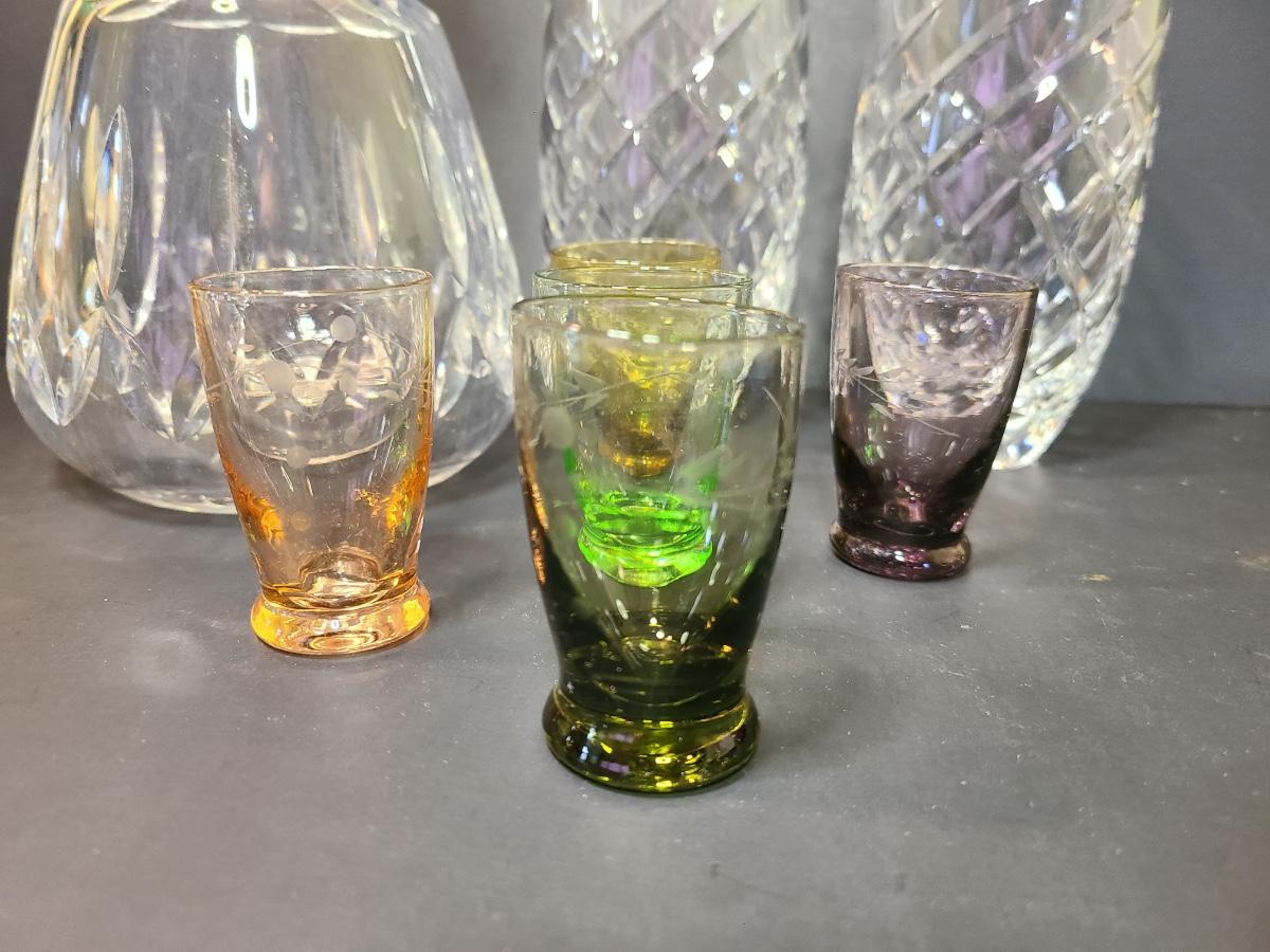 Lot 105S: Vintage Decanter, Wedgwood Drambuie Glasses, Hyde Park Coasters, and Napco Cordials.