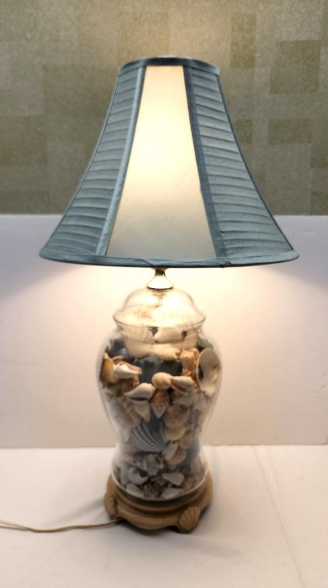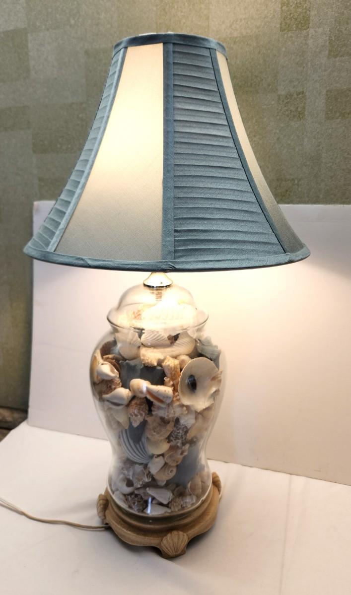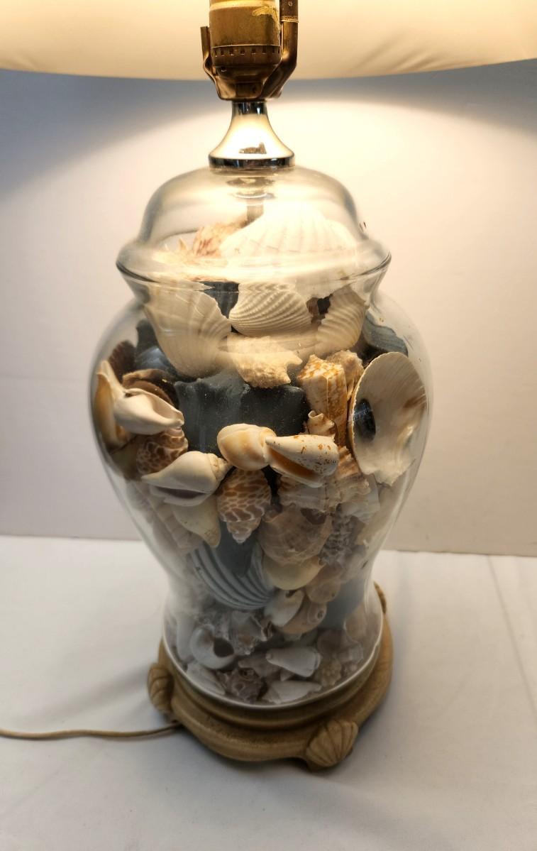 Perfect for your beach condo - 70's table lamp with clear base filled with sea shells. Works - 29" tall - good condition.
