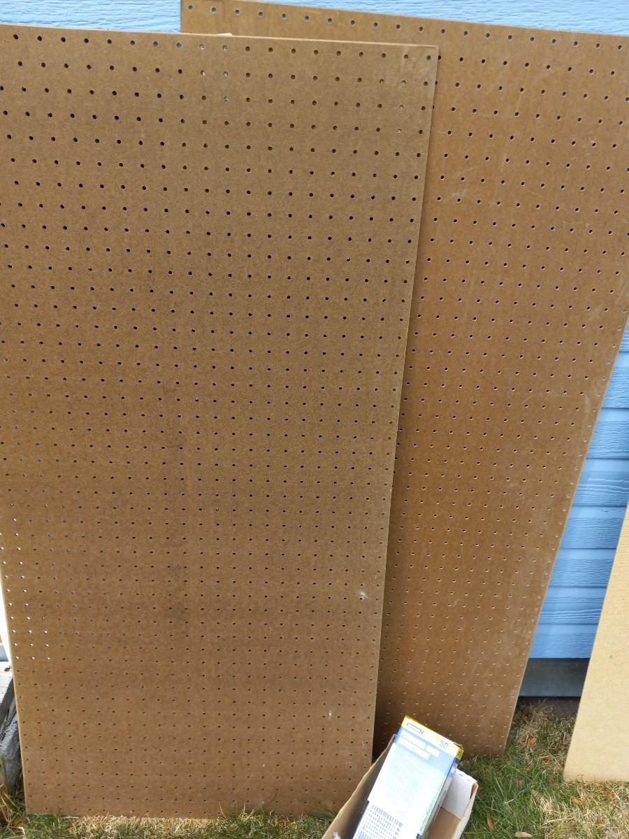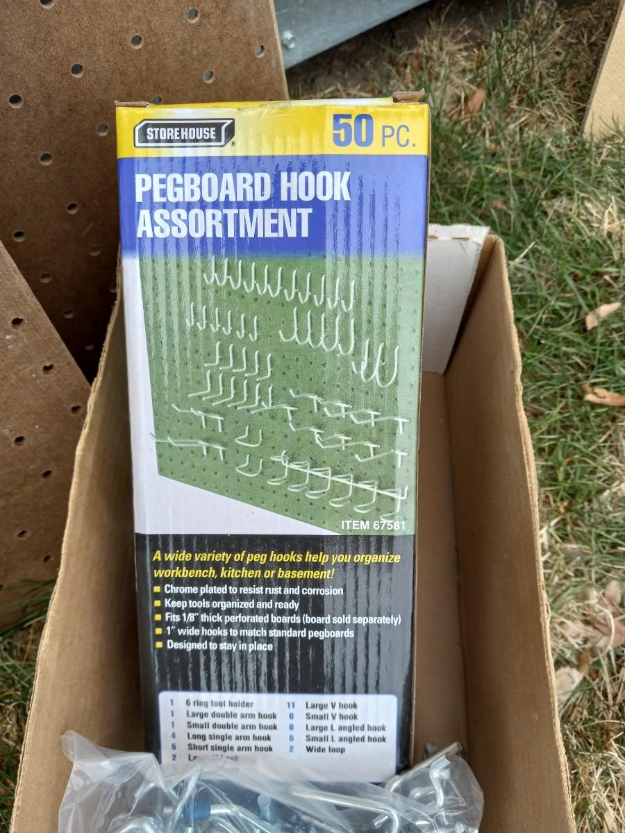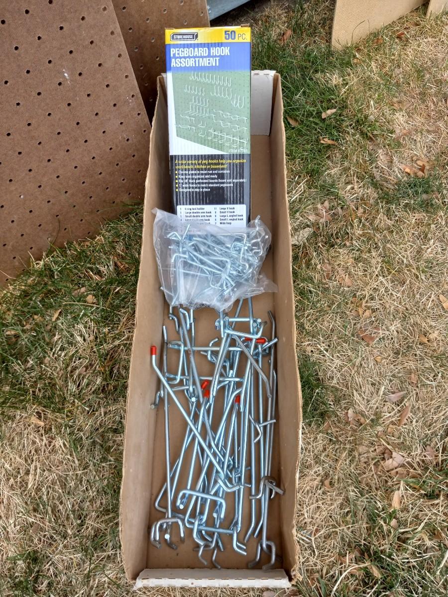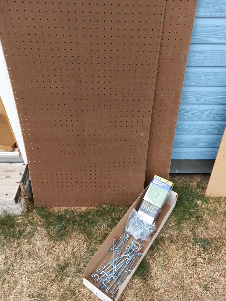 TWO PIECES OF PEG BOARD AND PEG BOARD HOOKS