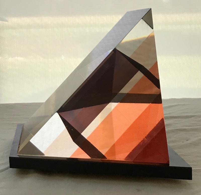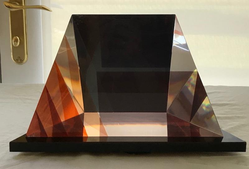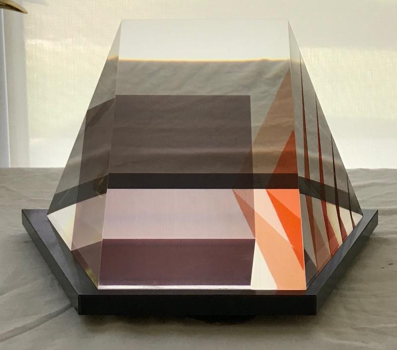 Acrylic prism sculpture art piece measures 7-1/2” tall and 13” wide and sits on a base that spins.