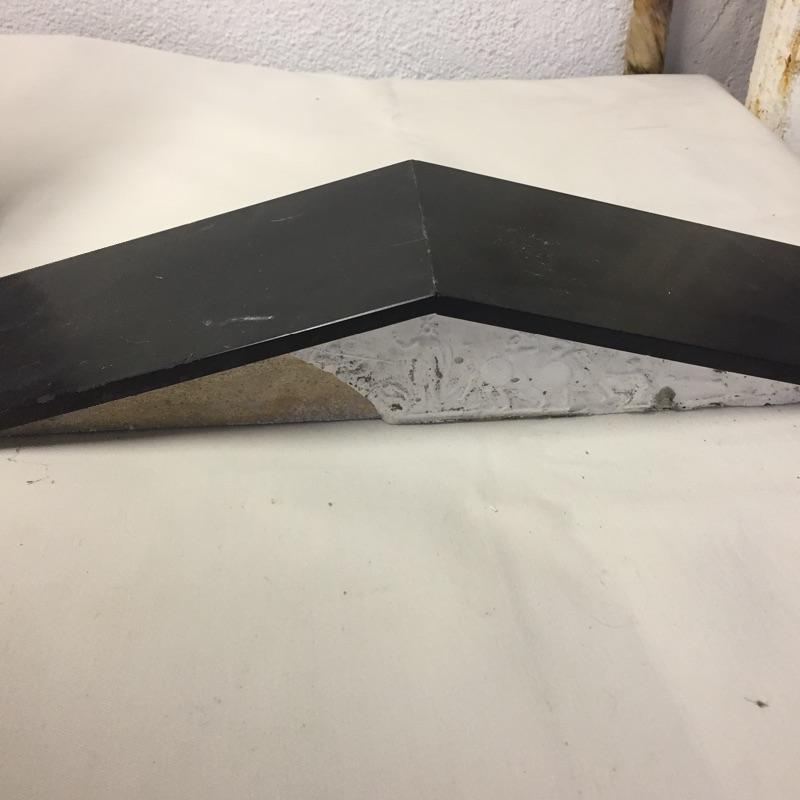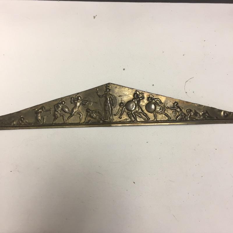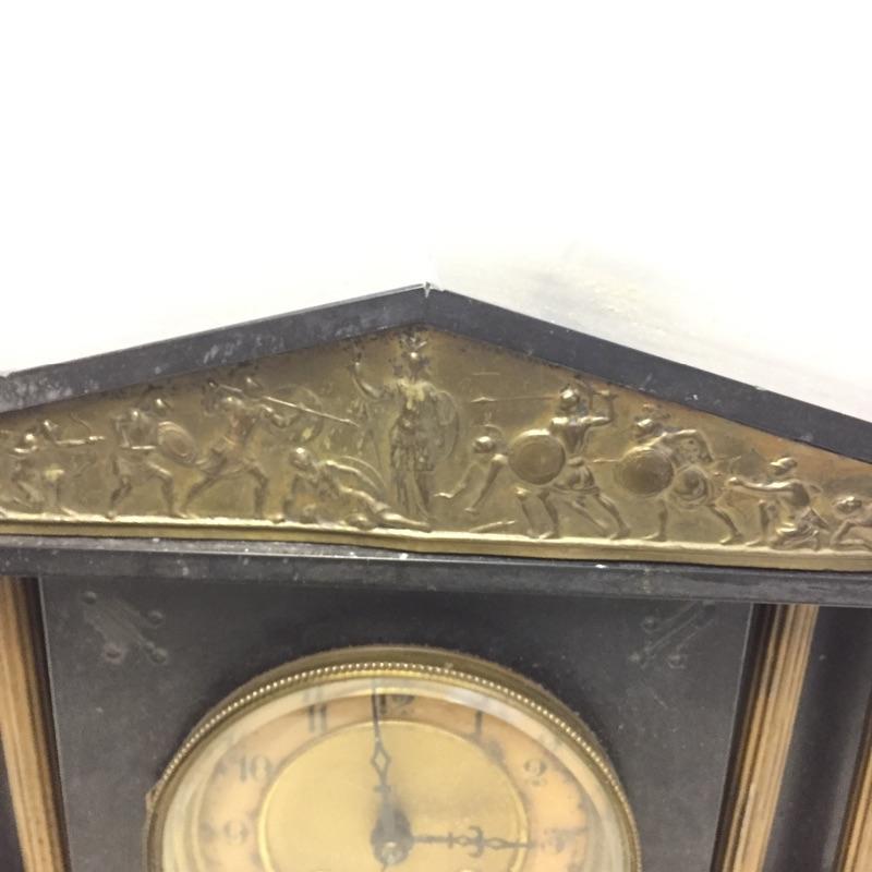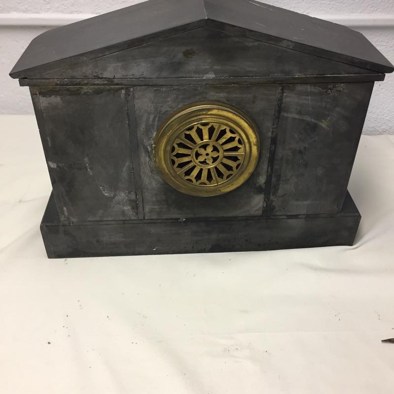 Bold substantial antique mantle clock made of a mixture of metal, wood and tile. Gold triangular motif needs to be reglued. Top piece is not attached and pendulum is not attached. Fair to say it likely needs work to be functional. Clock is missing key. Clock measures 16.5” x 5” x 12.5”.