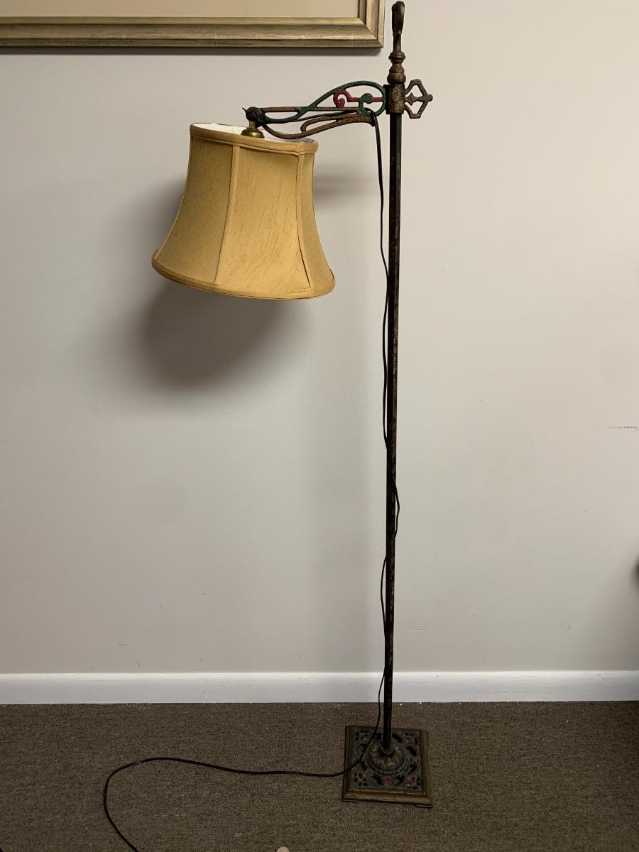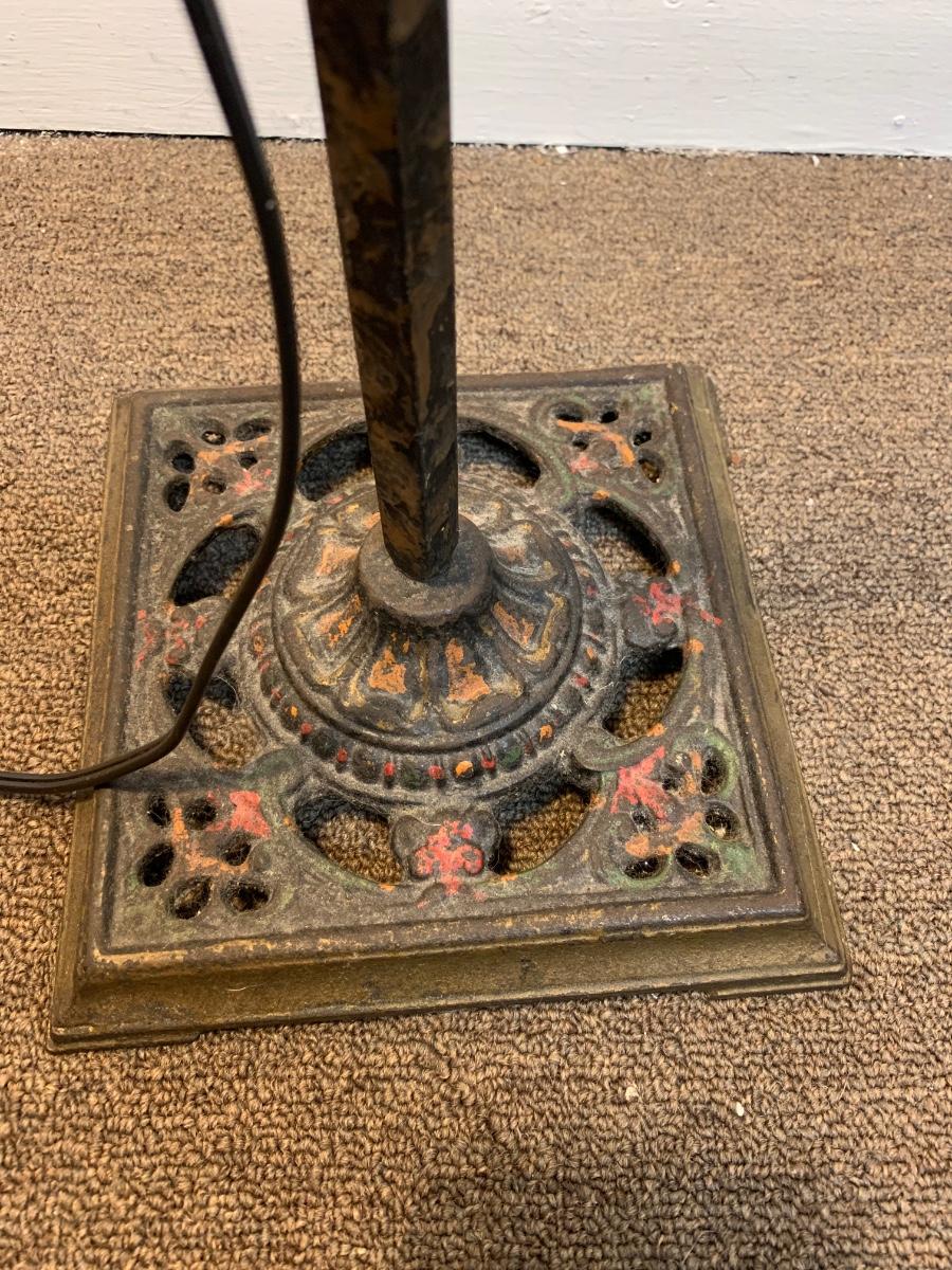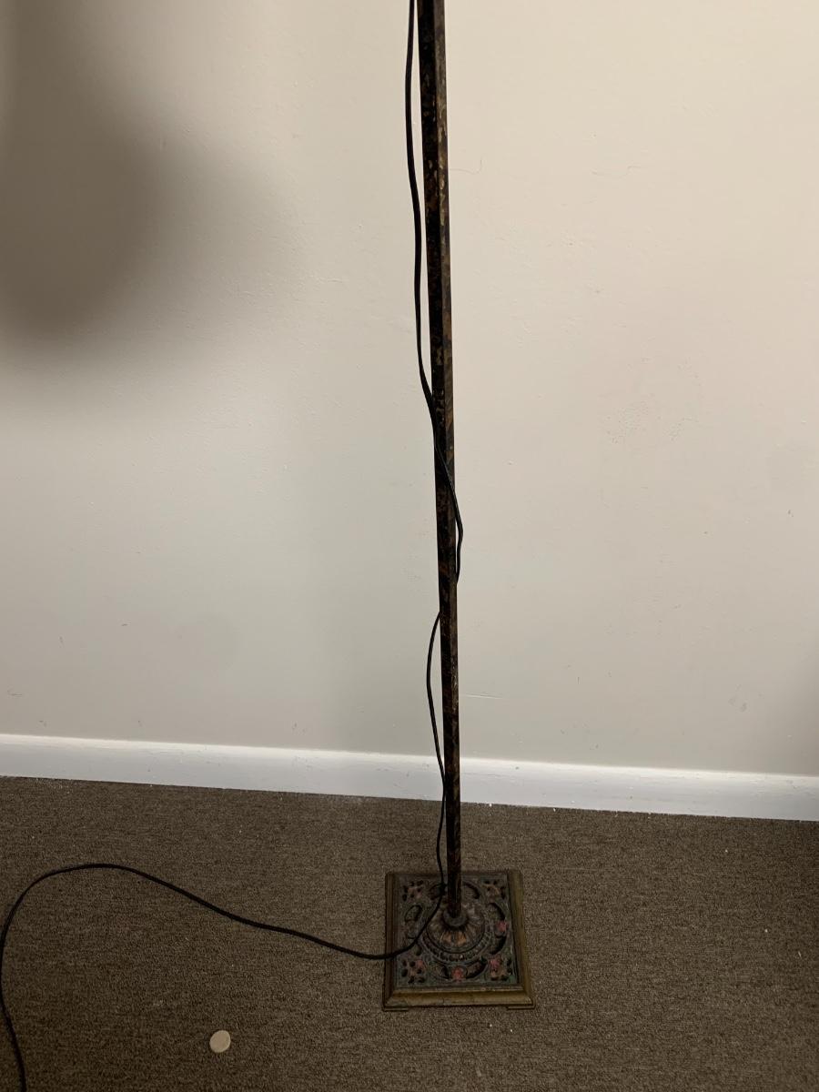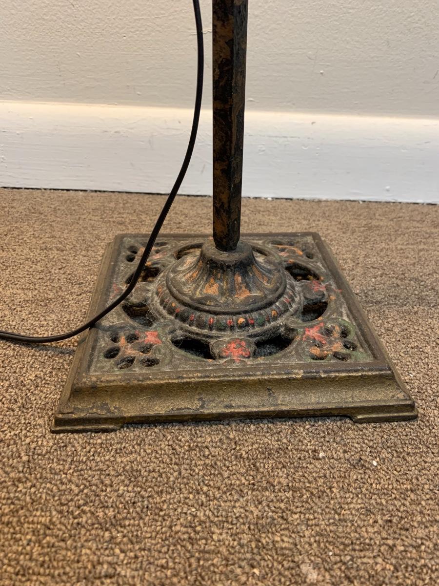This lot includes one antique floor lamp. The lamp appears to be made of Wrought Iron and hand painted. The lamp appears to have newer hardware and can confirm that it turns on (see photos). Most of the paint appears chipped or faded (see photos). The lamp measures about 57" x 17". Shipping not available.