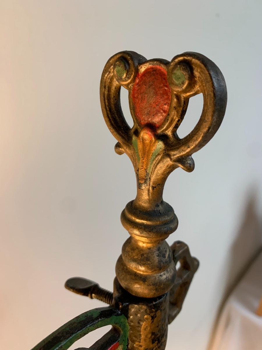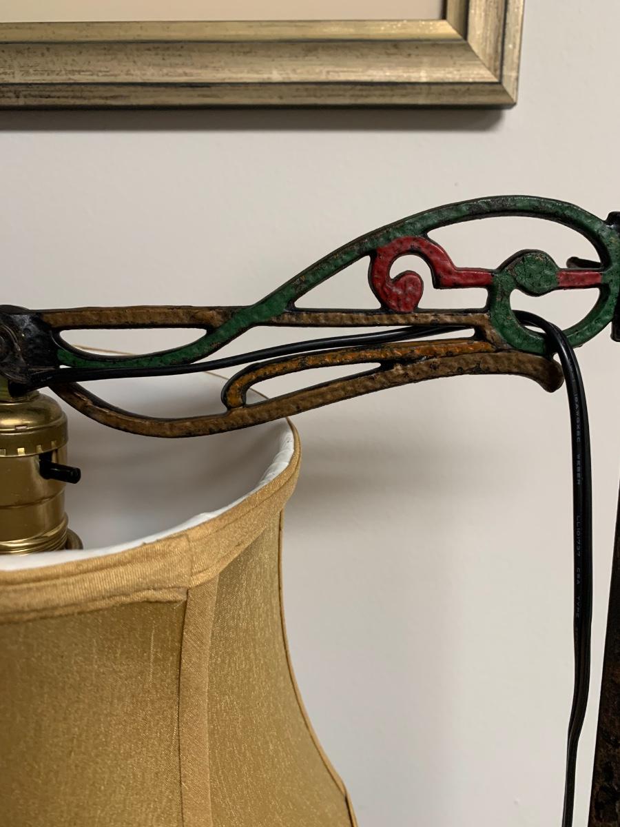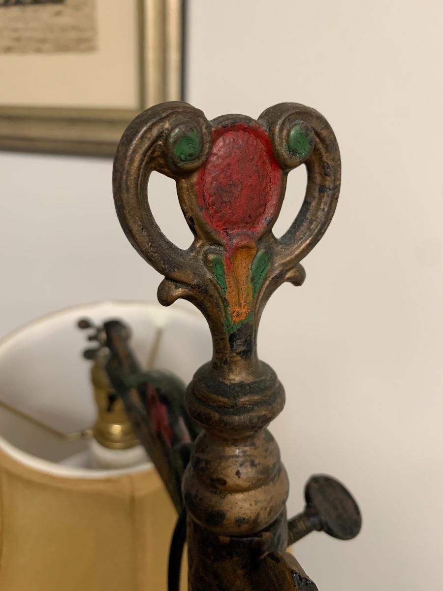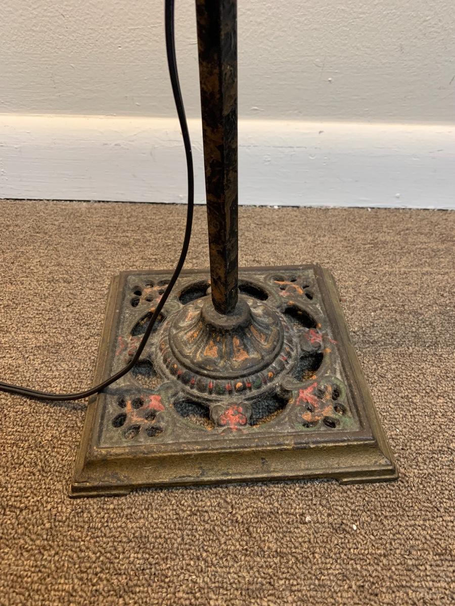 This lot includes one antique floor lamp. The lamp appears to be made of Wrought Iron and hand painted. The lamp appears to have newer hardware and can confirm that it turns on (see photos). Most of the paint appears chipped or faded (see photos). The lamp measures about 57" x 17". Shipping not available.