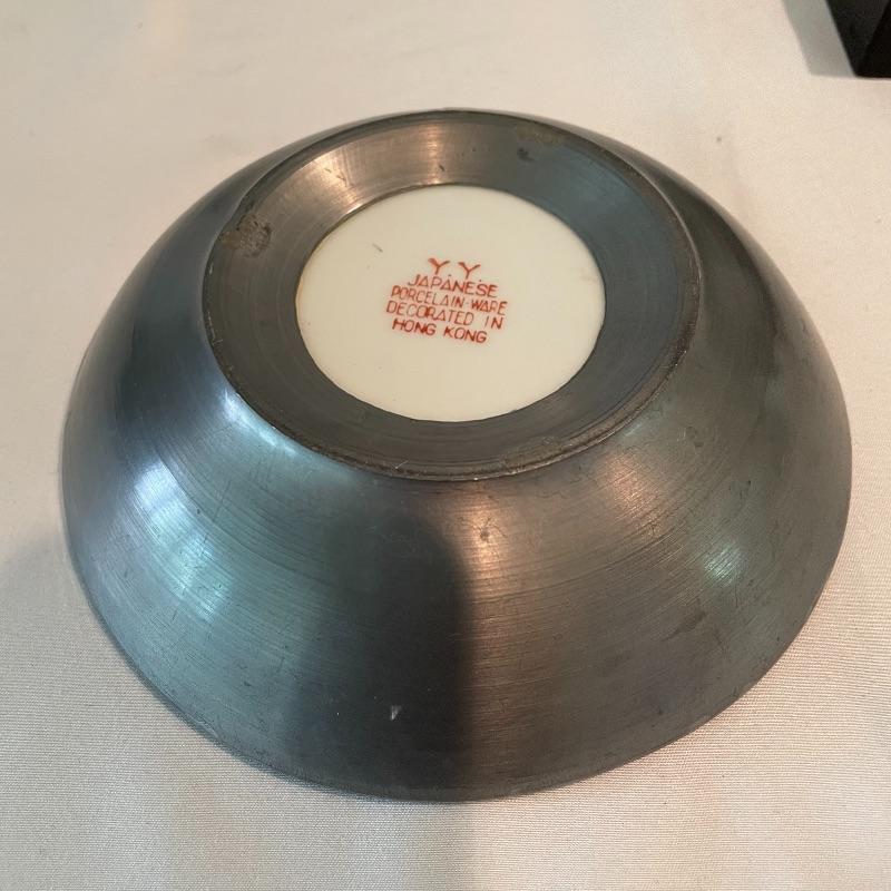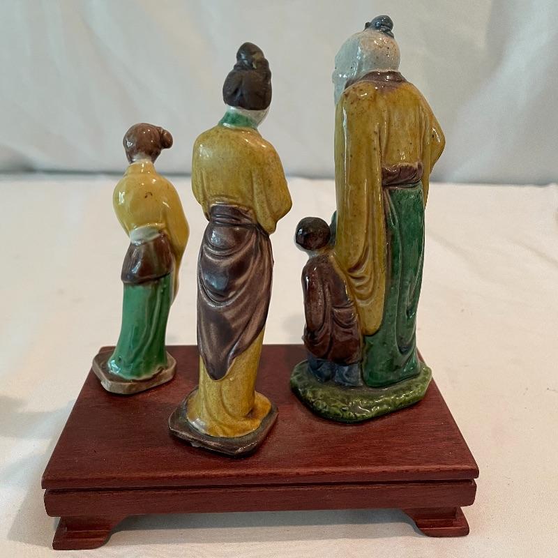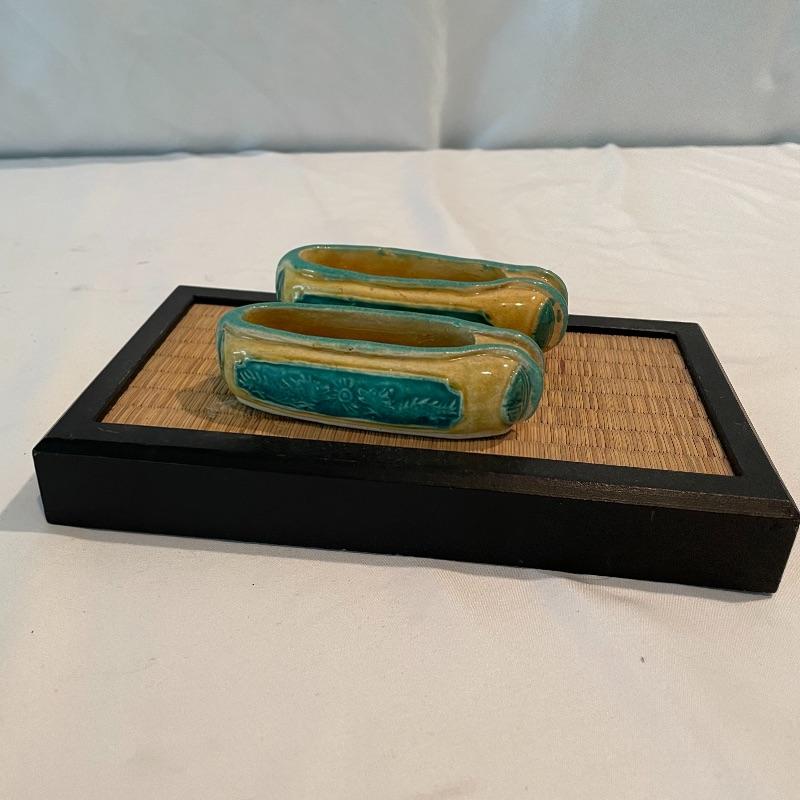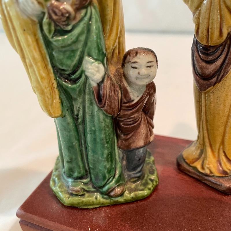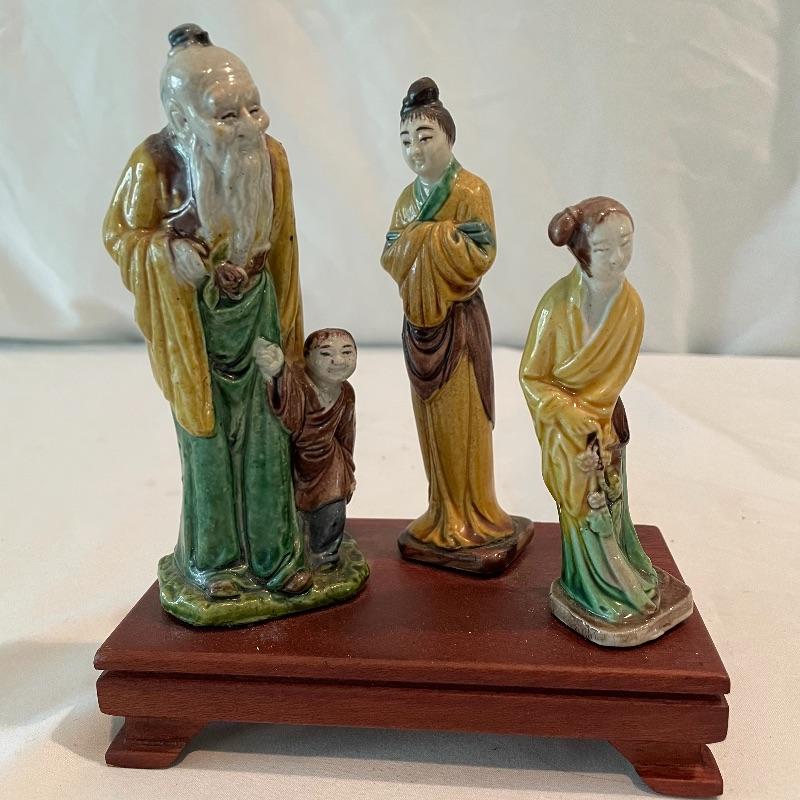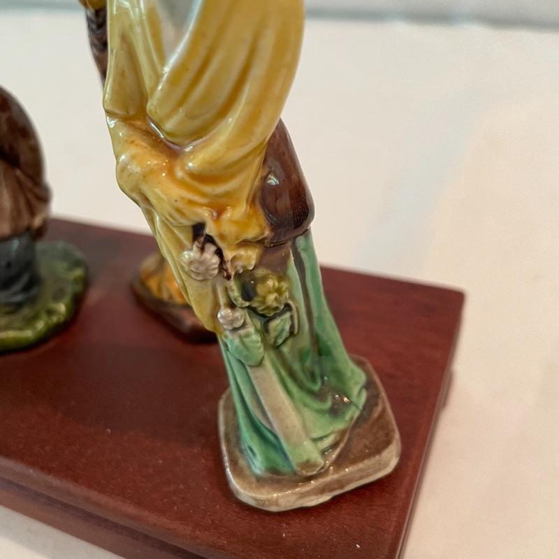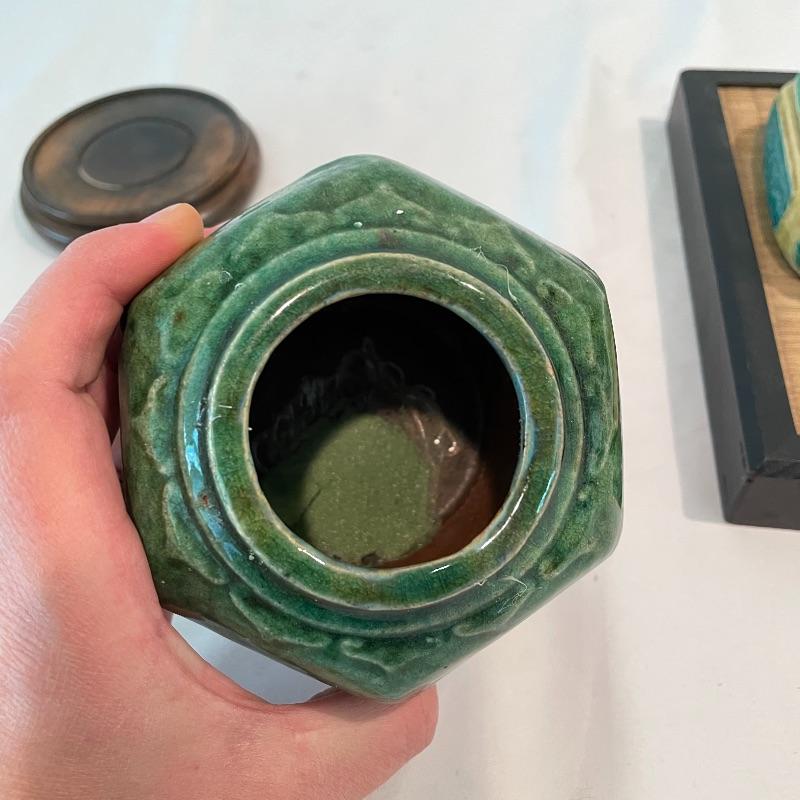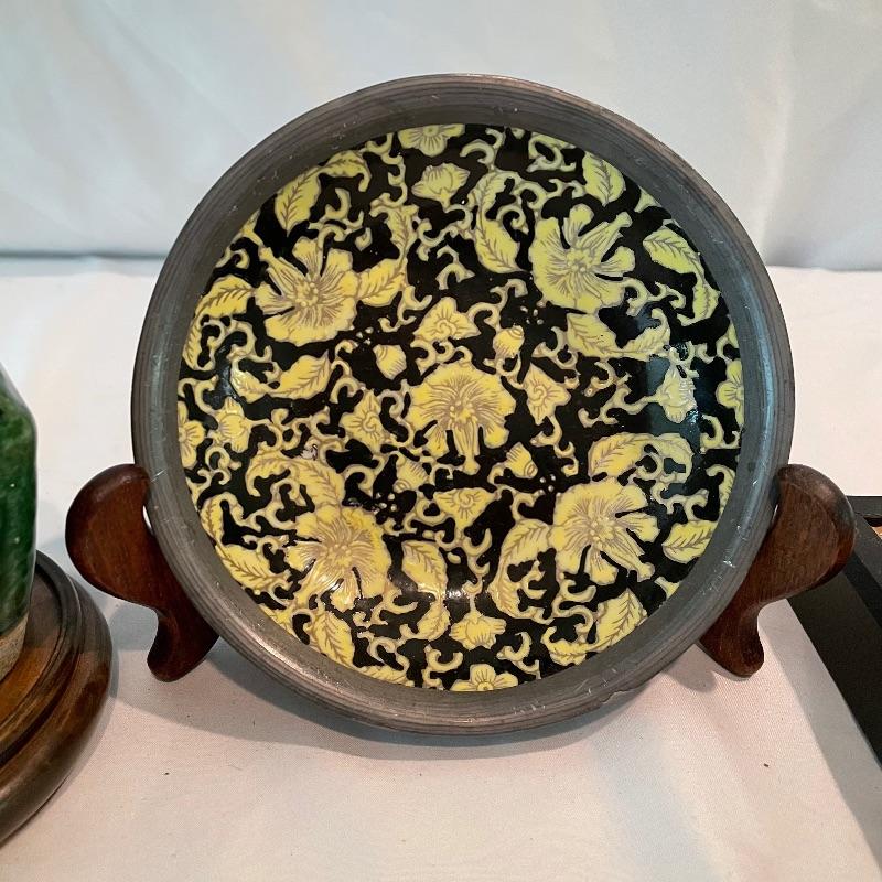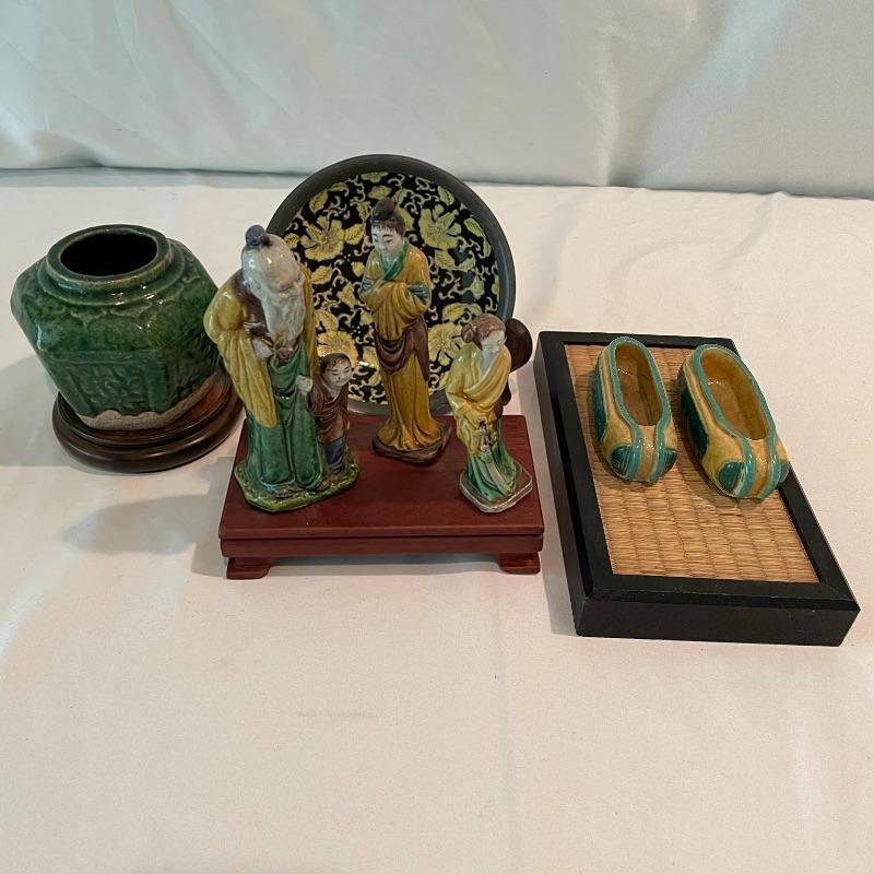 Here’s a lovely little collection of ceramics and stoneware. Three figures full of personality in a small size, the man is about 6” tall. Lot includes a beautiful yellow, black, silver colored porcelain ware bowl from both Japan and Hong Kong. A nice small 4” tall green planter and more. All stands in photos are included in lot. See photos, shipping available.