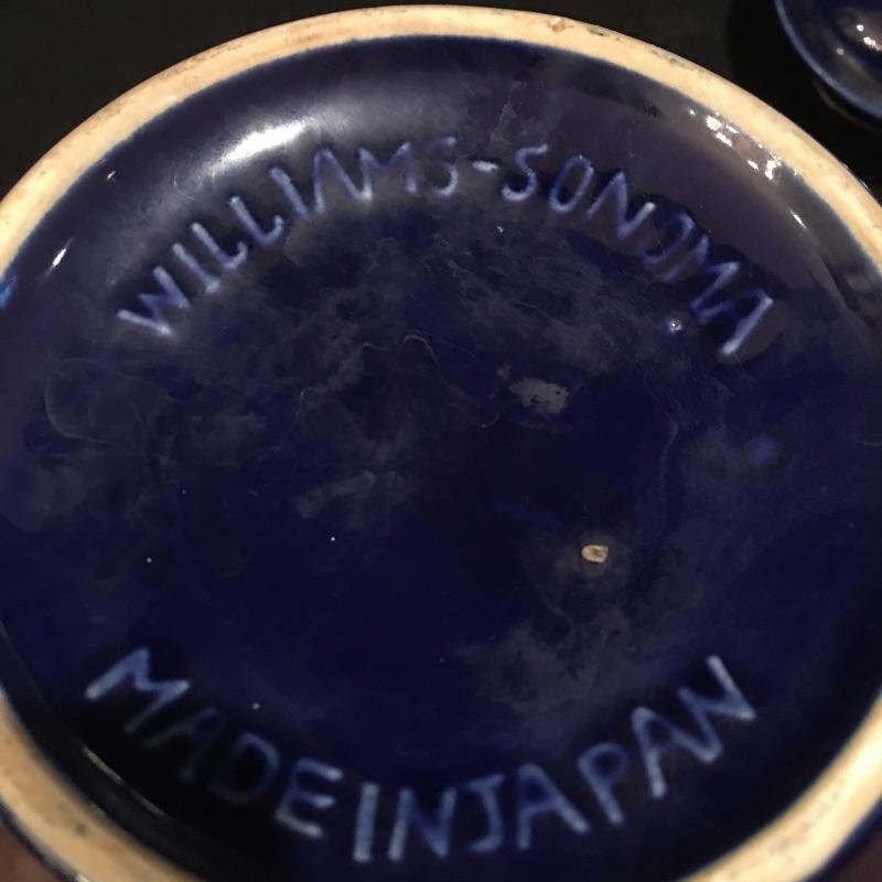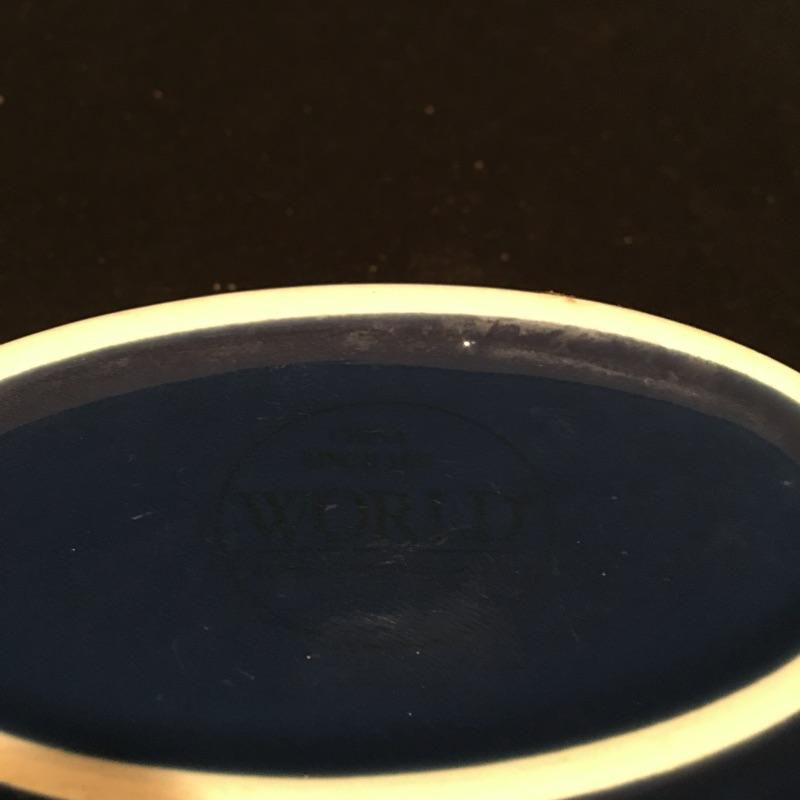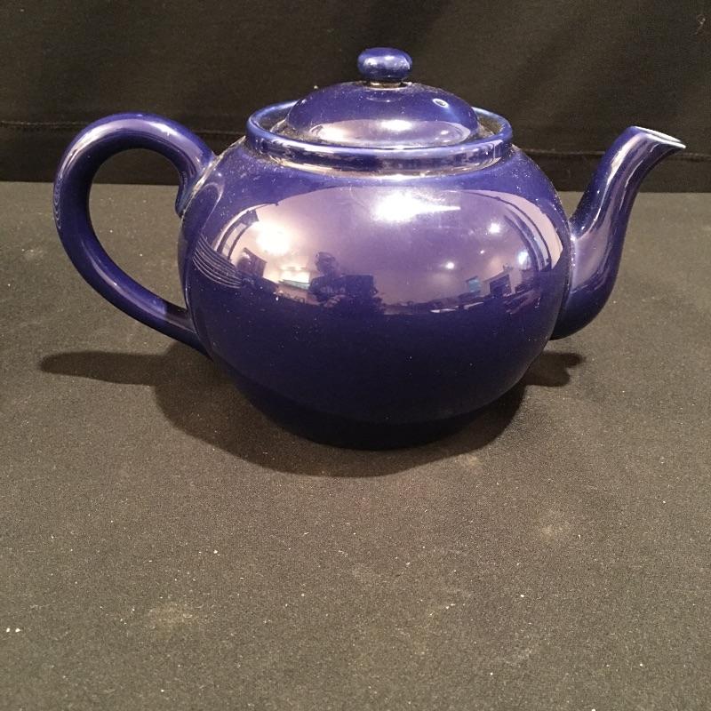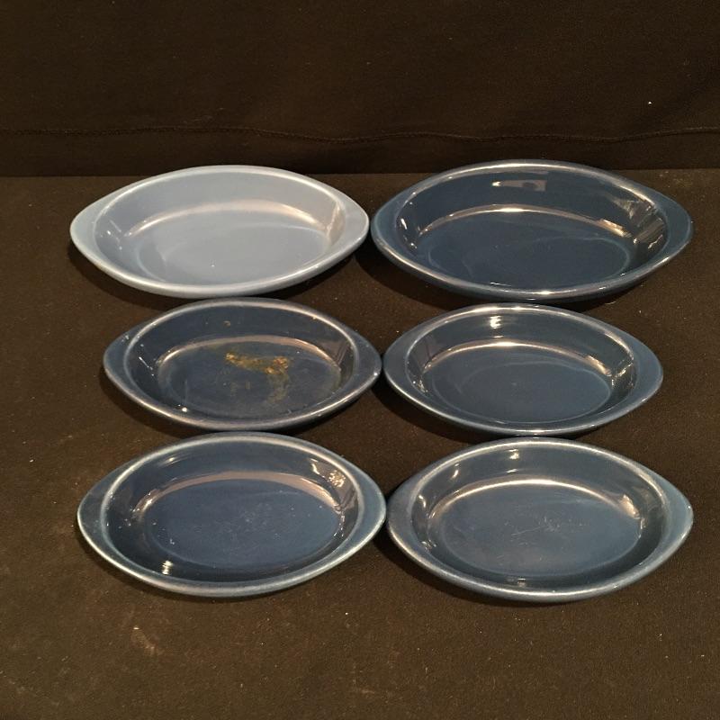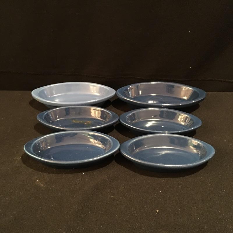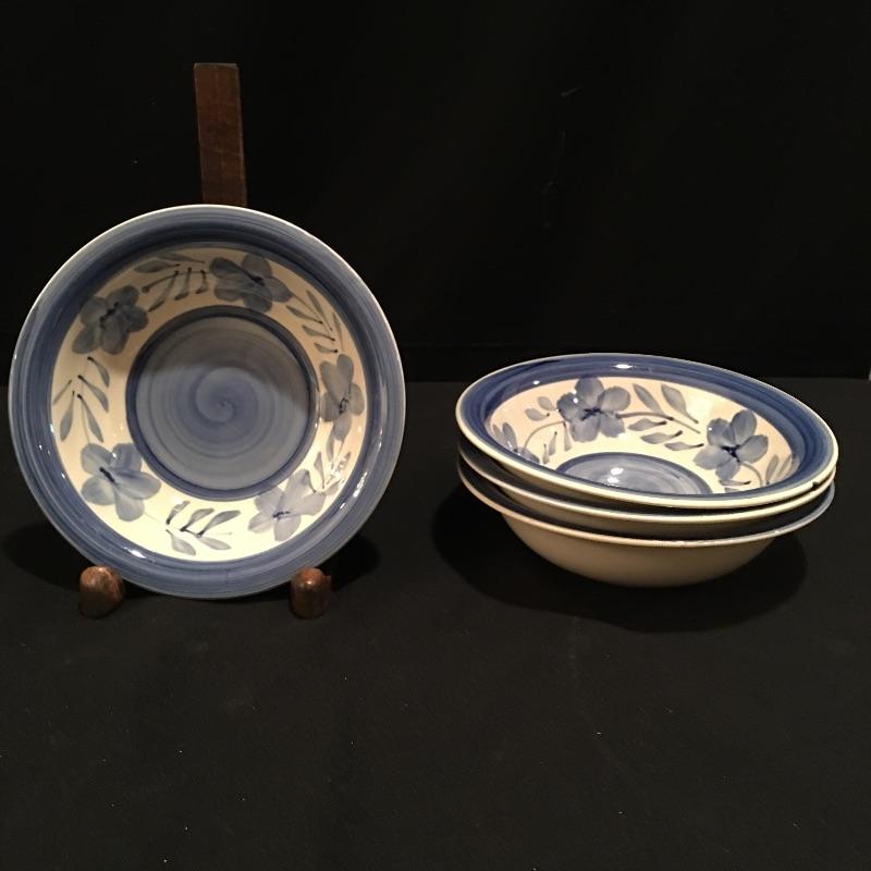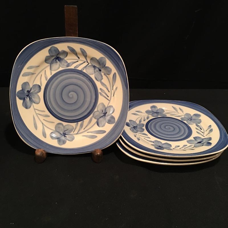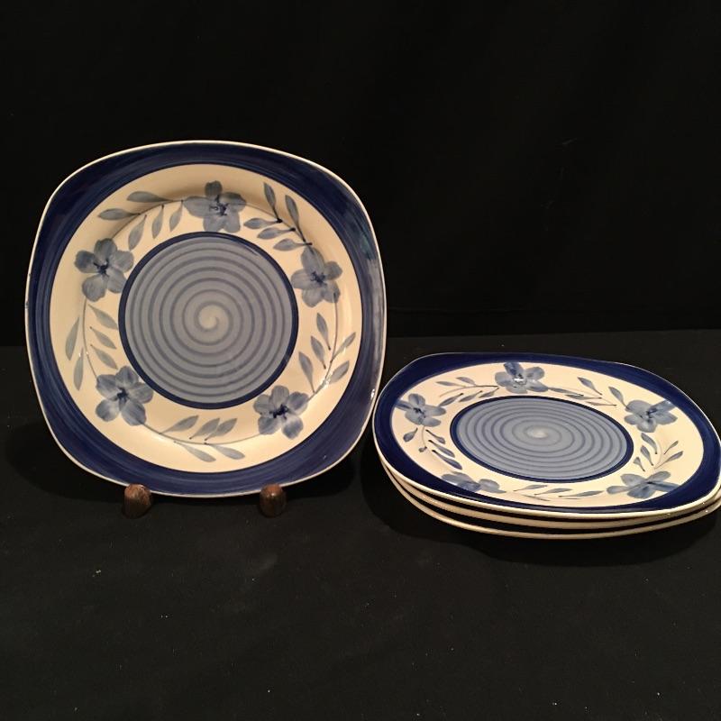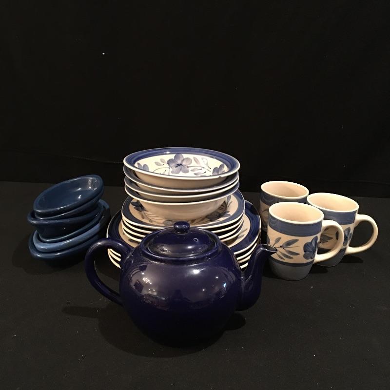 Soothing blue dishes includes four matching bowls, dinner plates and bread plates with three coffee cups, Williams Sonoma teapot and six small dishes. Dinner plate measures 10.5” x 10.5”.