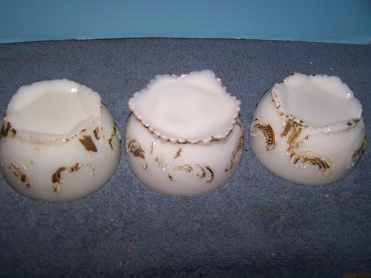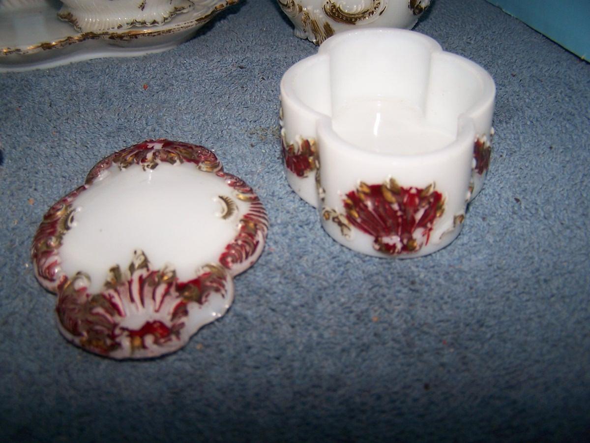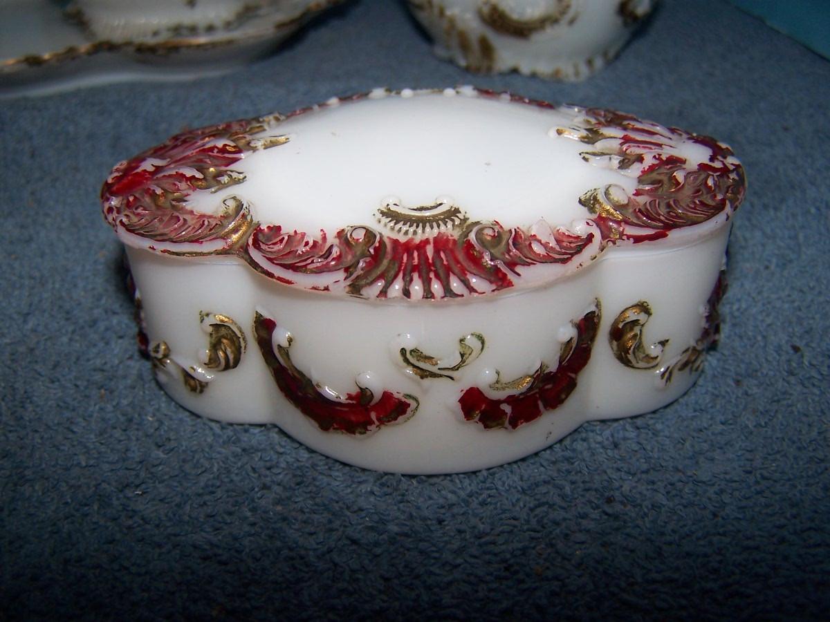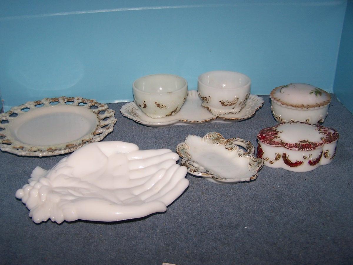 THESE ARE BEAUTIFUL VERY OLD MILK GLASS PIECES!!! SEVERAL ARE MARKED.. MATCHED DRESSER PIECES... SOME FLAKES, SOME PAINT GONE, OTHERWISE, LIGHT WEAR..