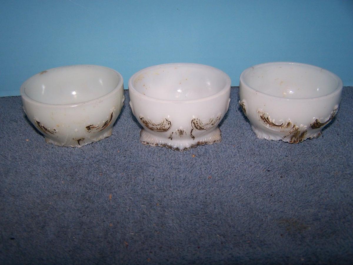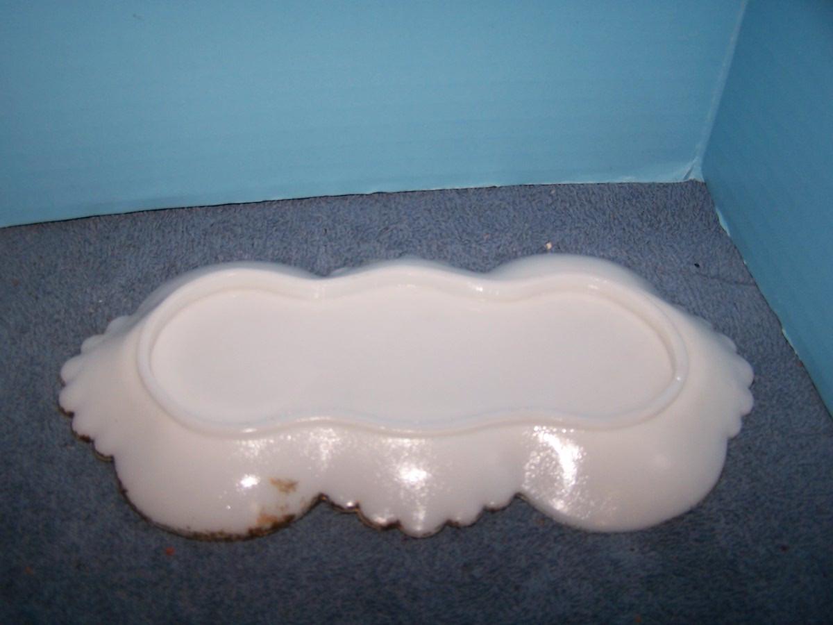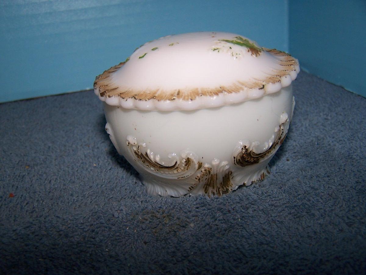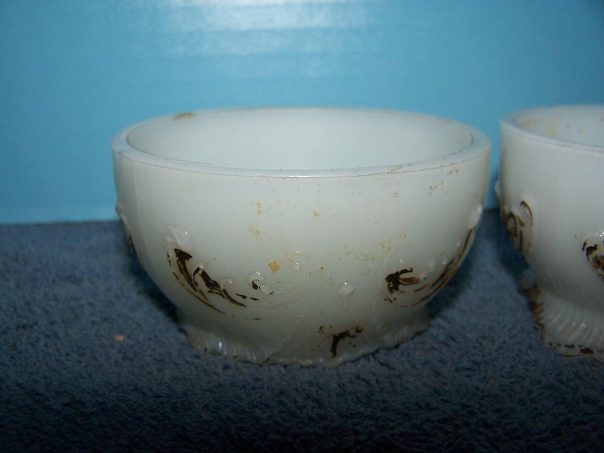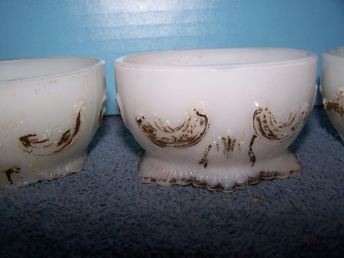 THESE ARE BEAUTIFUL VERY OLD MILK GLASS PIECES!!! SEVERAL ARE MARKED.. MATCHED DRESSER PIECES... SOME FLAKES, SOME PAINT GONE, OTHERWISE, LIGHT WEAR..