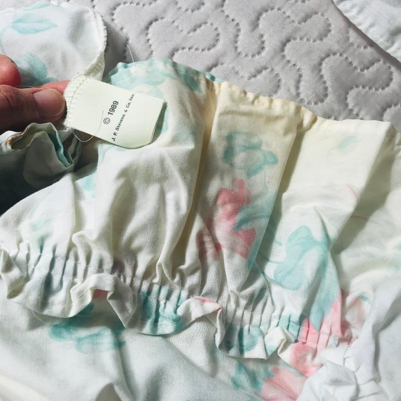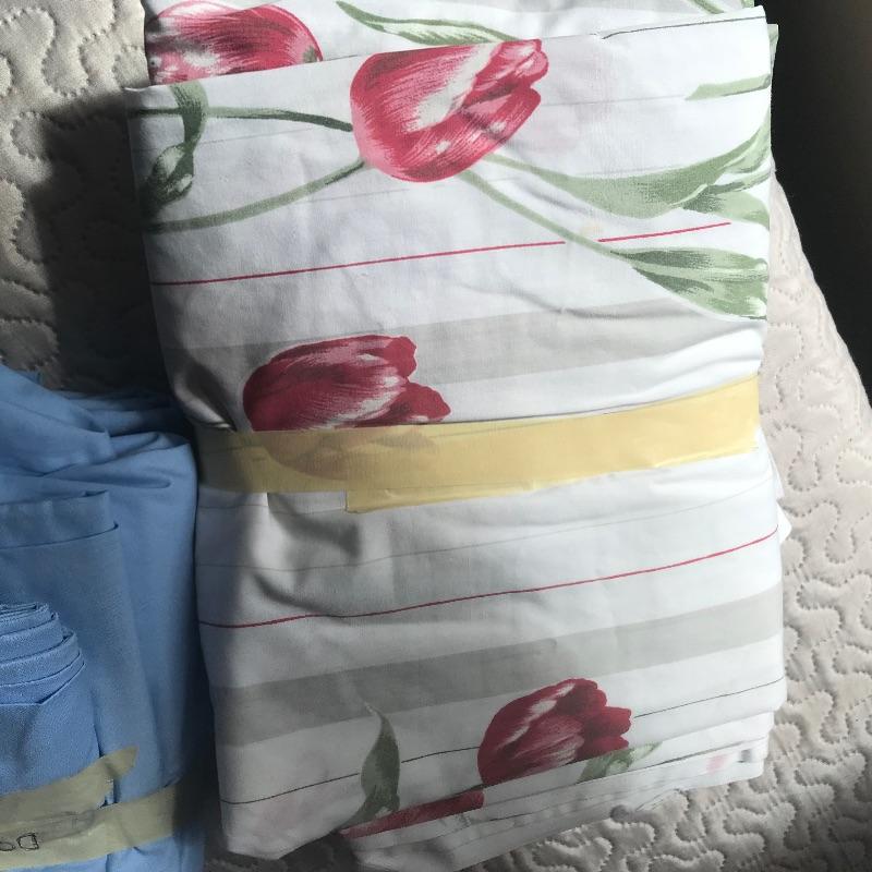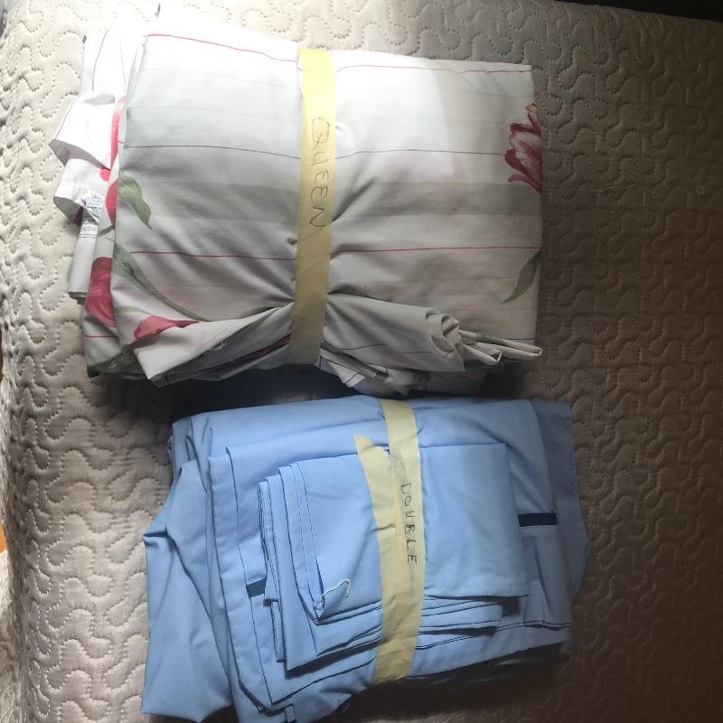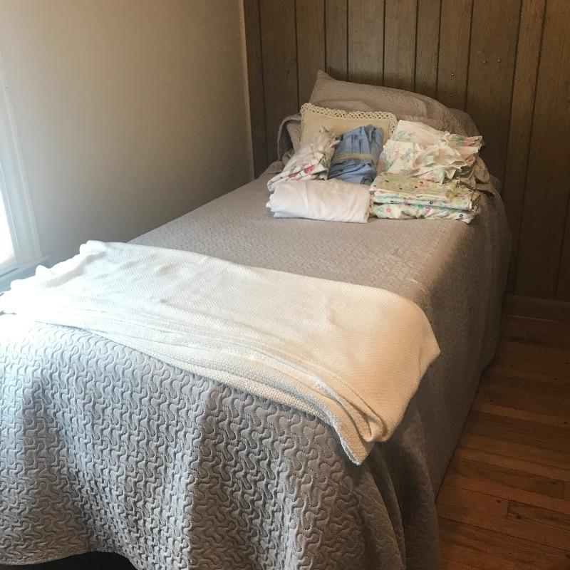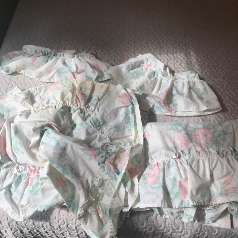 Nice variety of bedroom linens including twin, double and queen sized sets. Lot includes two twin floral bedskirts with what appears to be feet coverings secures with safety pins. All appear to be cotton, polyester or blend. The Queen sheet set does not include pillow cases. The double blue set has a nice navy ribbon. The set showcased on the twin bed (bed not included but can be found in lot 106) is a gray with a soft lavender look. That set has one soft gray standard pillowcase and two king pillow shams with matching comforter that appears to be queen sized. Known tags are shown in images. There is one crocheted pillow with adorable flowers in need of cleaning. House has cat hair present. Also, a few pieces show discoloring, see images. Local pick up only.