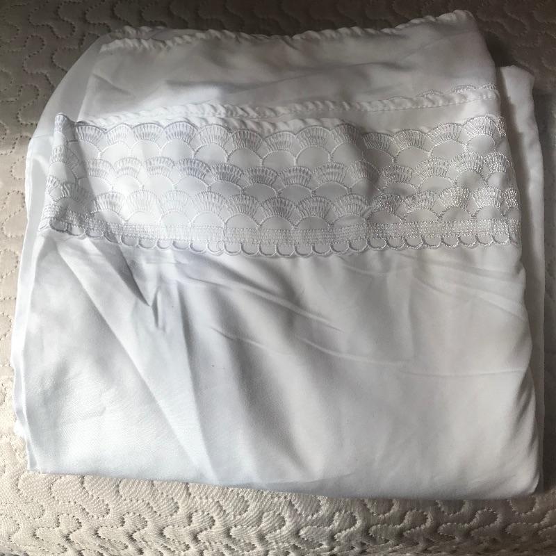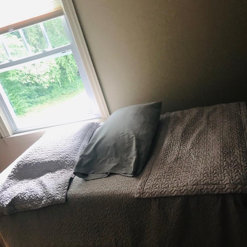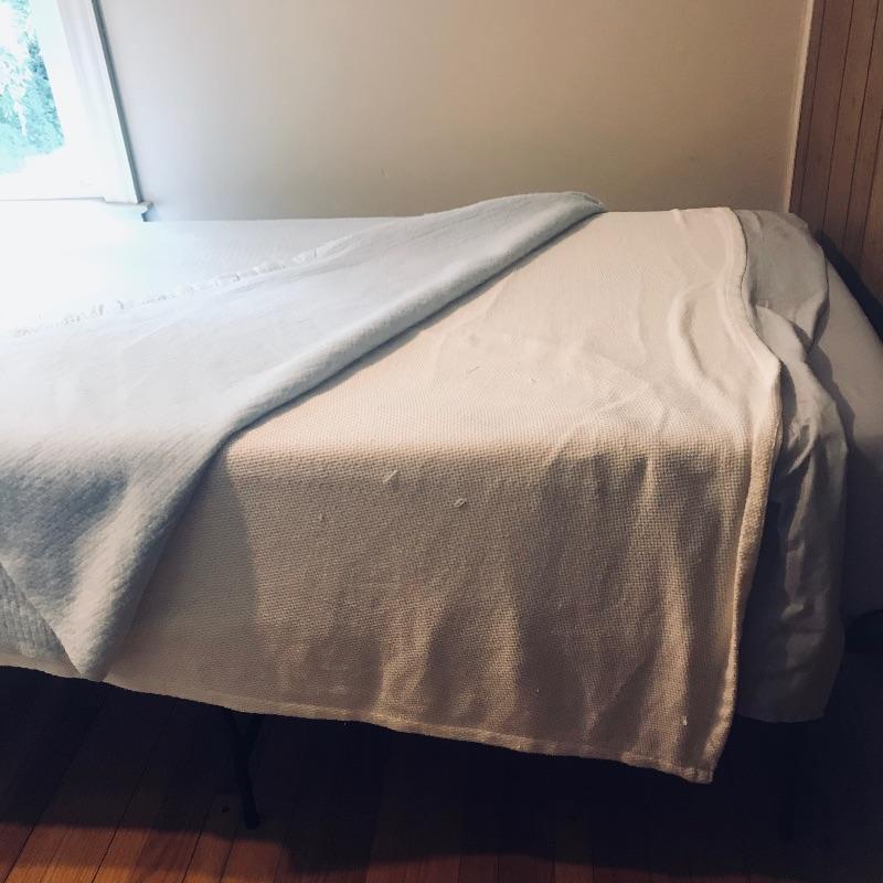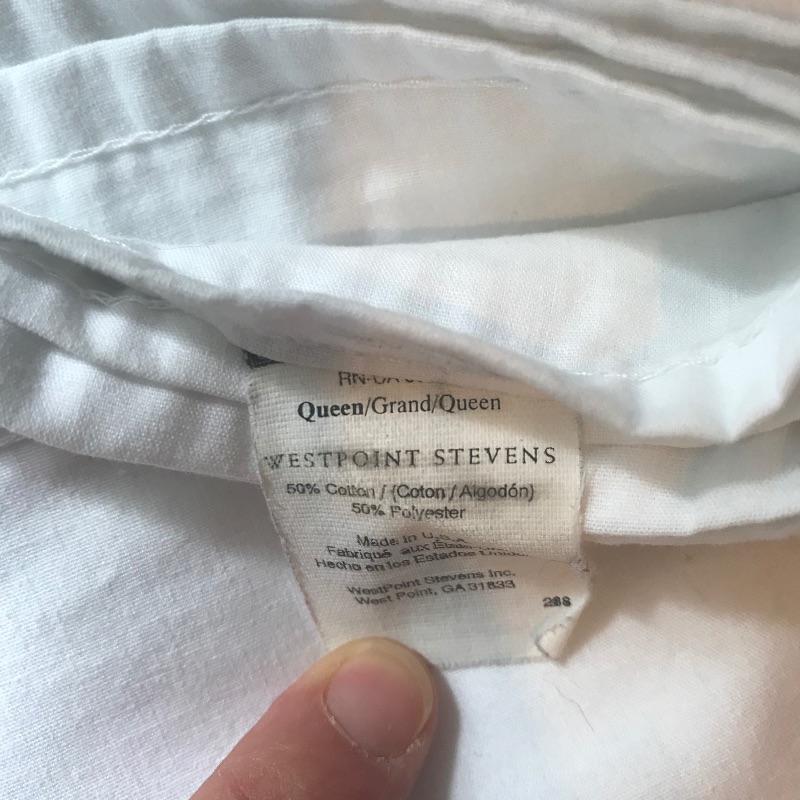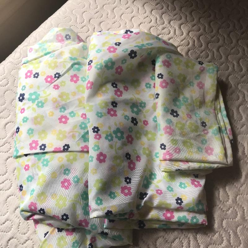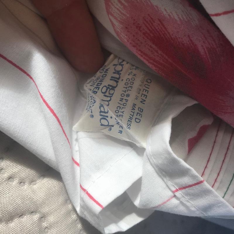 Nice variety of bedroom linens including twin, double and queen sized sets. Lot includes two twin floral bedskirts with what appears to be feet coverings secures with safety pins. All appear to be cotton, polyester or blend. The Queen sheet set does not include pillow cases. The double blue set has a nice navy ribbon. The set showcased on the twin bed (bed not included but can be found in lot 106) is a gray with a soft lavender look. That set has one soft gray standard pillowcase and two king pillow shams with matching comforter that appears to be queen sized. Known tags are shown in images. There is one crocheted pillow with adorable flowers in need of cleaning. House has cat hair present. Also, a few pieces show discoloring, see images. Local pick up only.