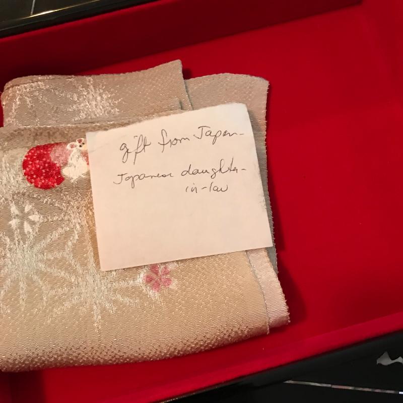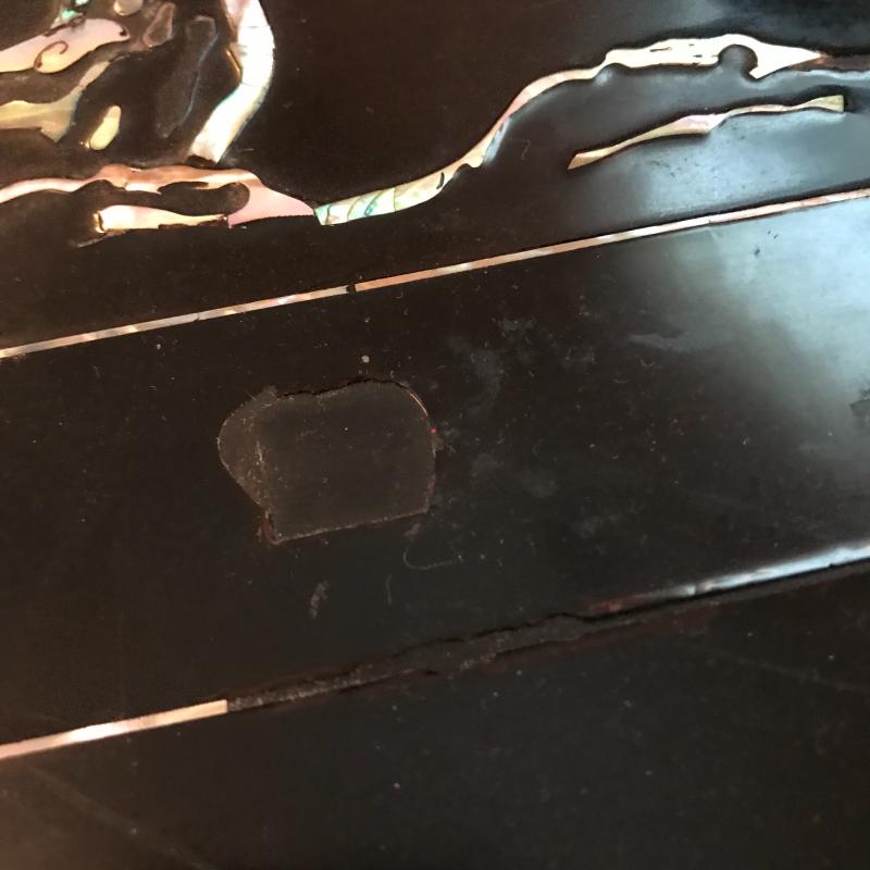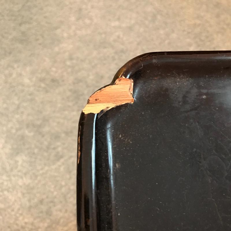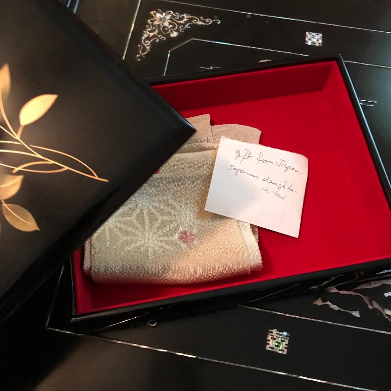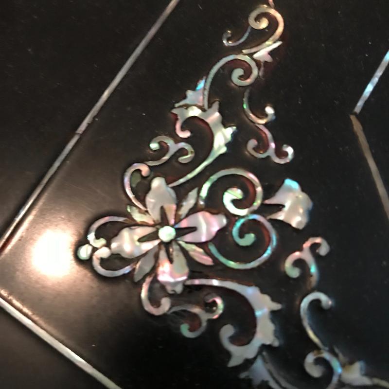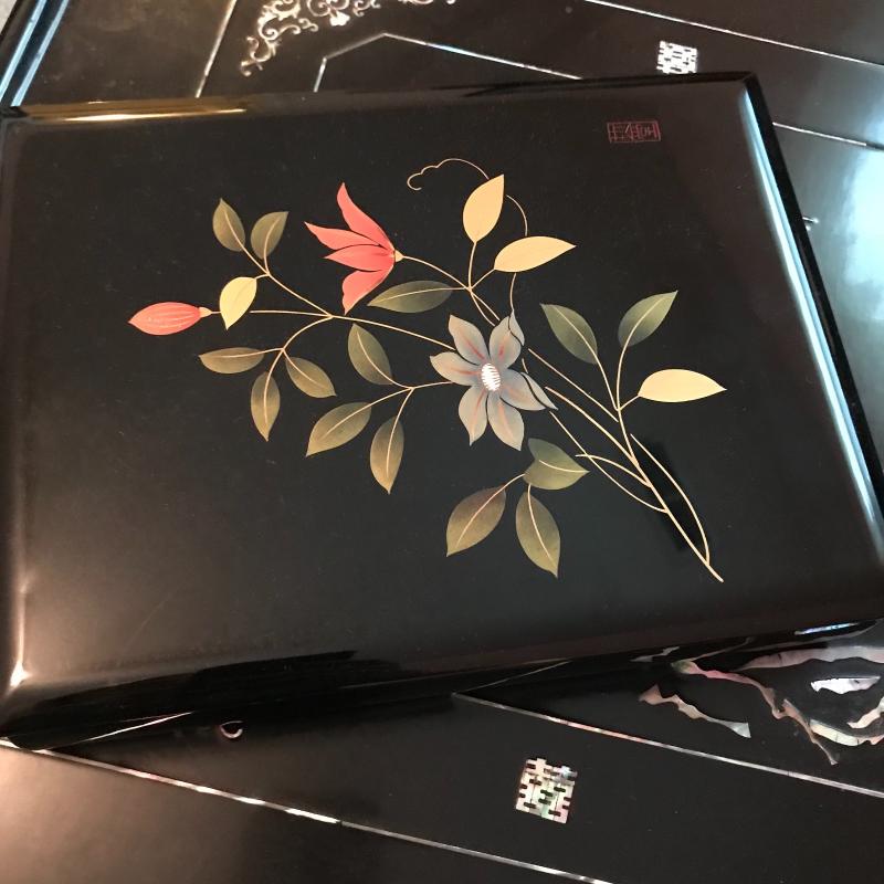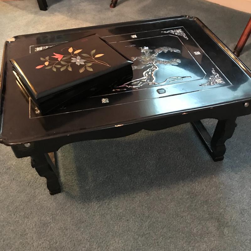 Lot includes black laminate tray and box with lovely intricate designs. Tray is approx. 24” x 18” x 11” and has a chip out of one corner. Box is approx. 9.5” x 7” x 2”. Lot also includes a silk scarf from Japan. No shipping available. Local pickup only in Arden, NC.