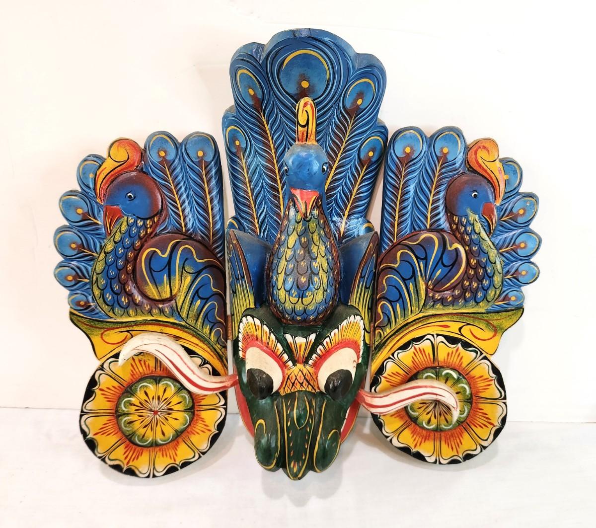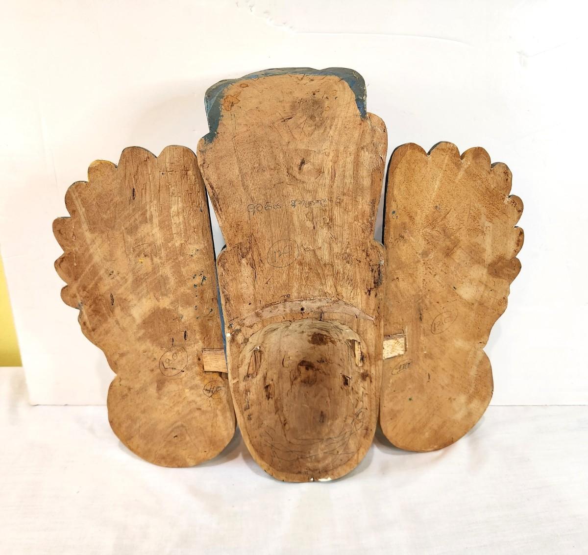 Carved wood, brightly painted ceremonial mask that our client hand carried back with him from Sri Lanka. Garuda Figure. 18" tall, 18" across. Excellent condition.
