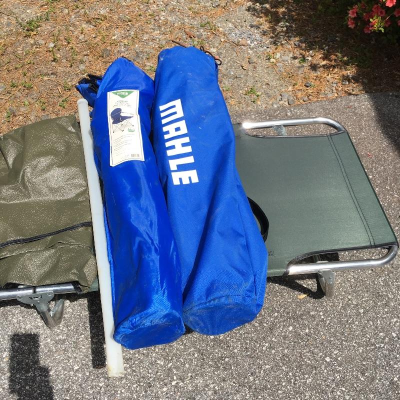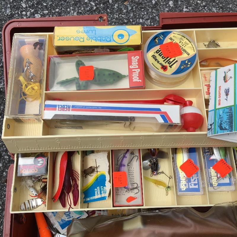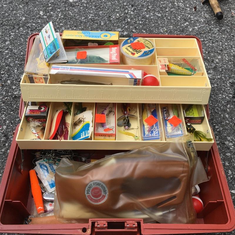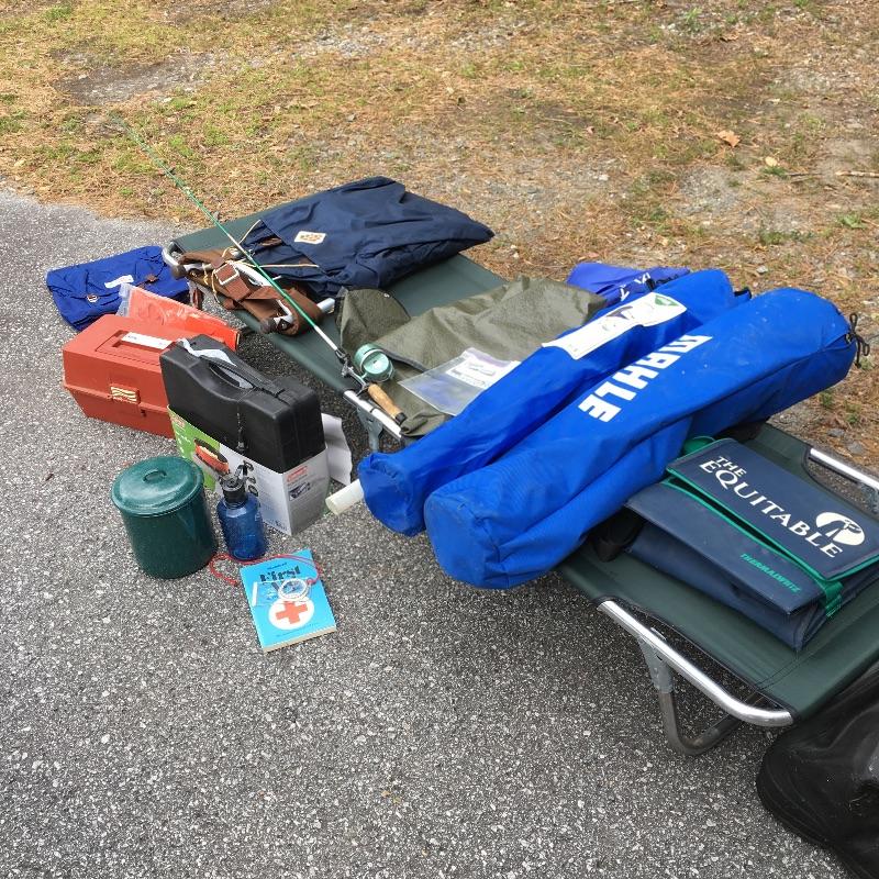 Camping and fishing lot. Lot includes two folding chairs, folding cot, Coleman butane stove, pocket fisherman, sterno stove, Bata rubber boots size 13, tackle box and contents, Southaven’s spincast reel and more. Be ready for the great outdoors with this handy lot.