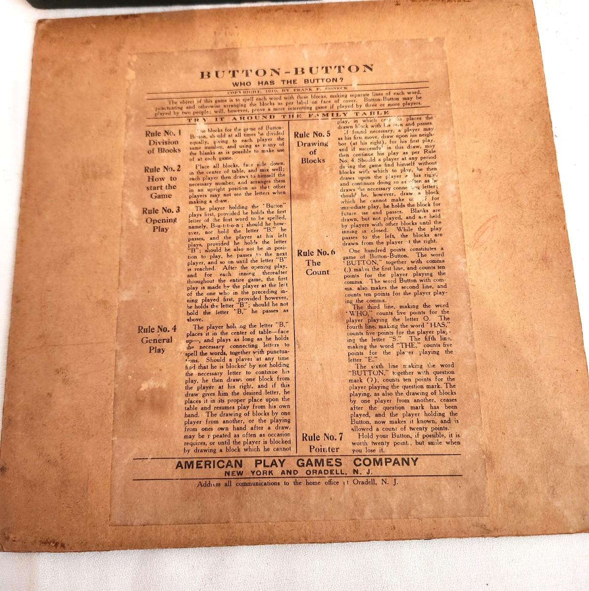 Charming little board game dated 1910 - Button, Button Who has the Button! Complete in original box - has instructions. SCARCE.
