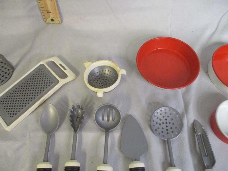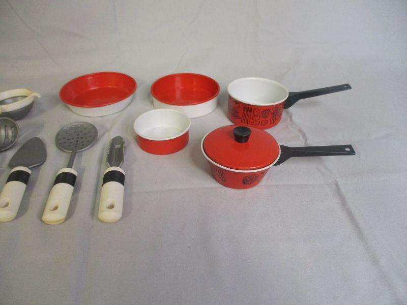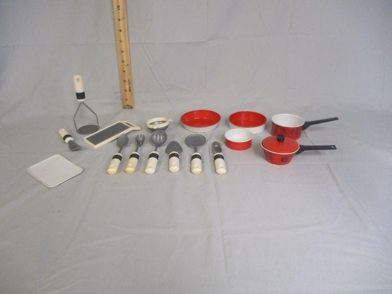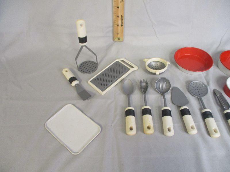 The pots and pans are made of metal while the utensils are all plastic. The only damage that I see is that the colander is missing it's handle.